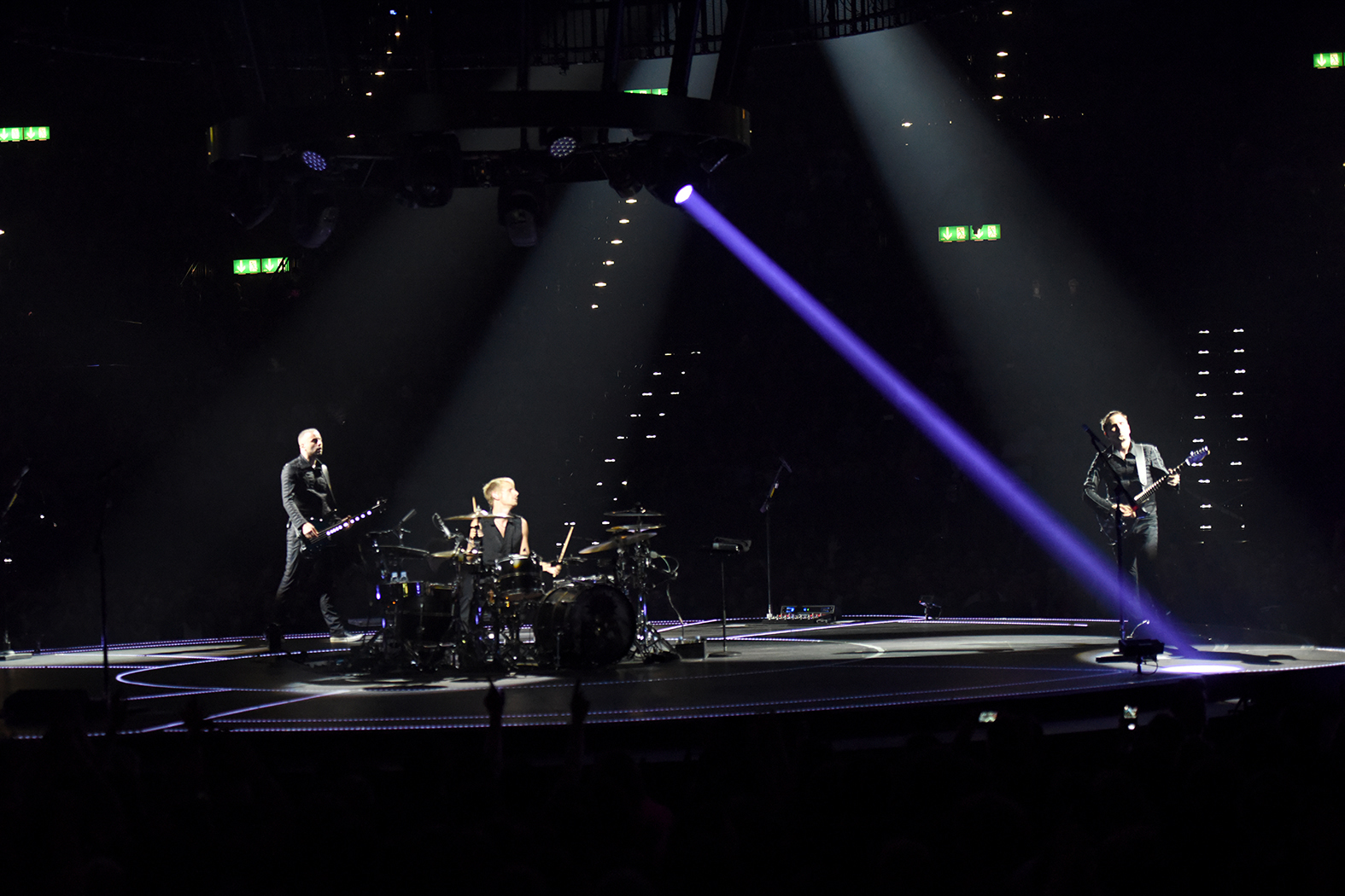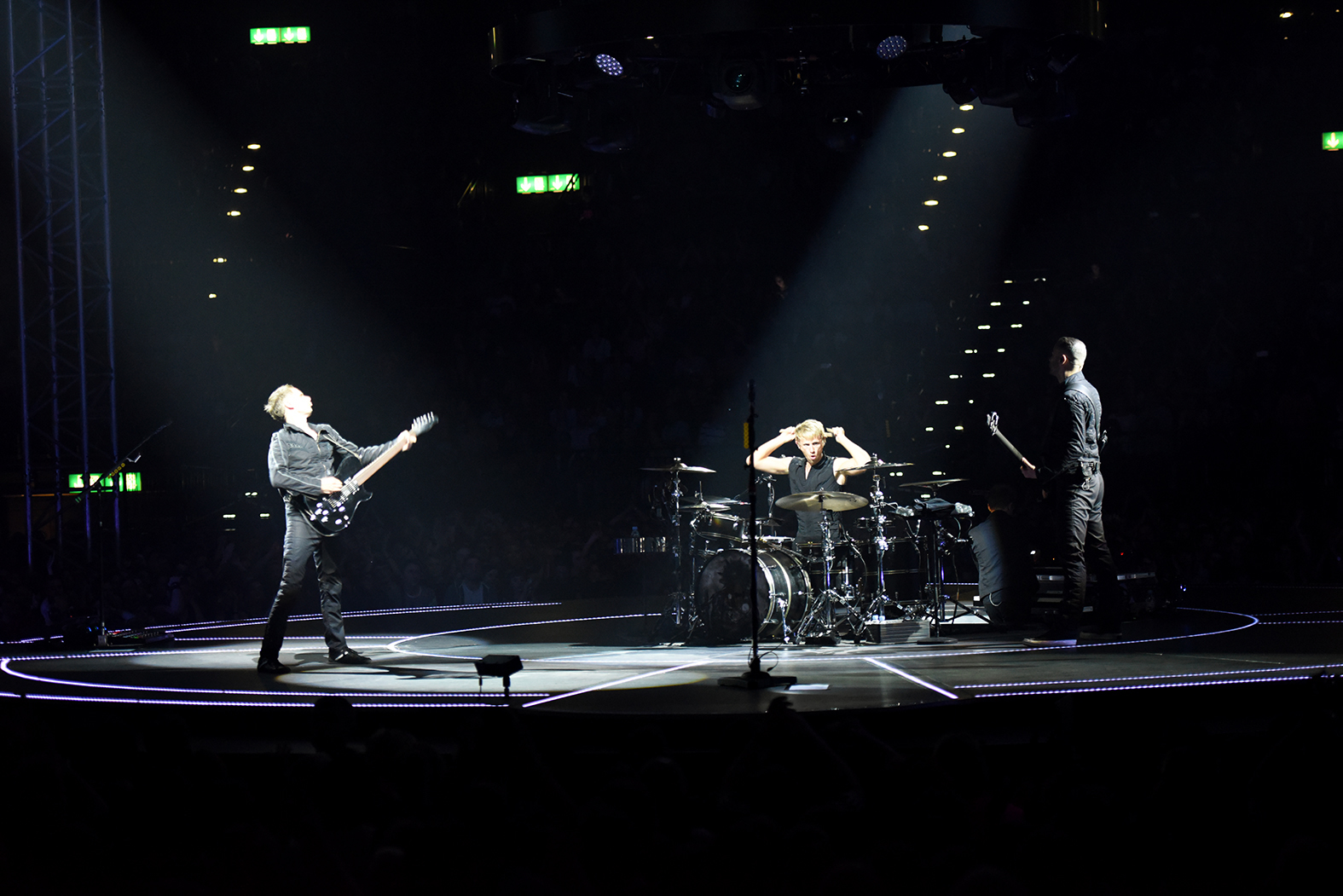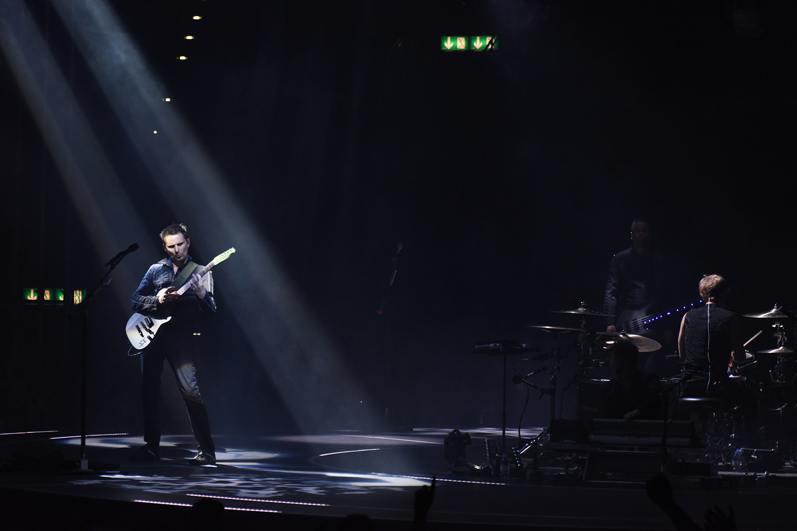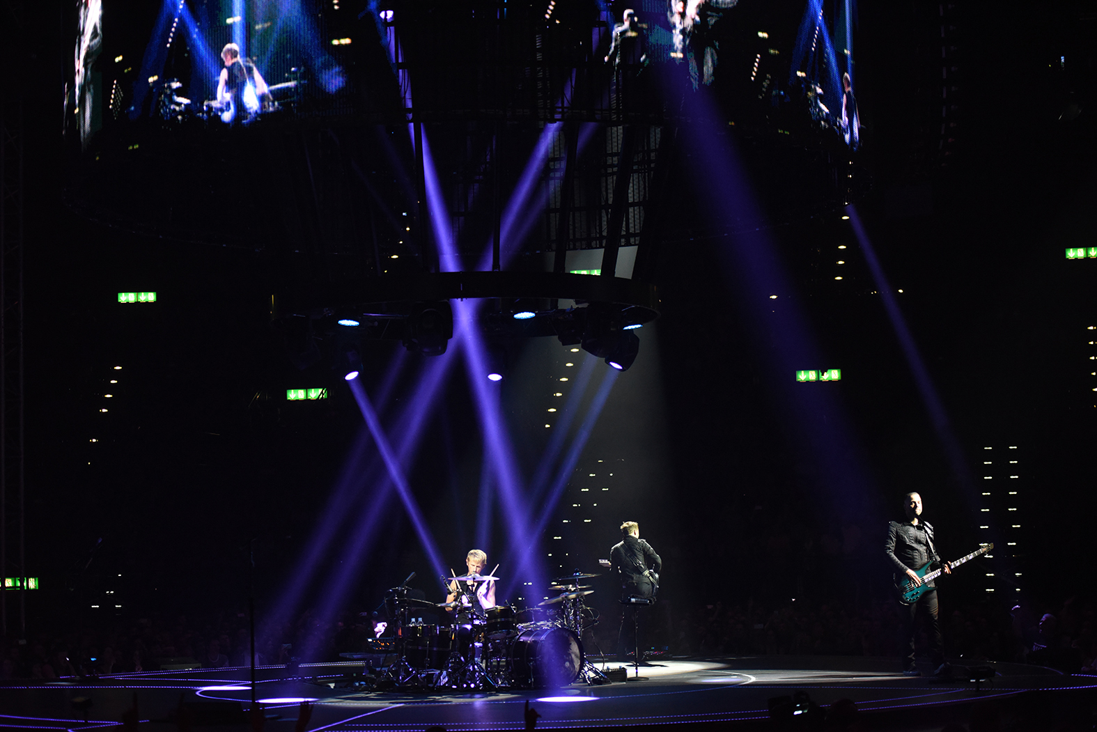 Muse retourne en tournée dans les salles et c’est tout de suite le délire. Les deux concerts planifiés à Zürich étaient-sold out en quelques minutes pour plus de 26’000 fans, qui ont rempli la plus grande salle suisse dans tous les recoins disponibles. Les Anglais de Muse sont bien connus pour leur shows spectaculaires et blindés de technologie, mais ce qu’ils ont concocté pour ce « Drones » tour amène le concept de « concert d’arène » à un niveau supérieur. Un spectacle qu’on pourrait assimiler à « The Wall » de Roger Waters ou le « Full Arsenal » de Metallica. Et comme ce dernier, la tournée est jouée « on the round », avec la scène au milieu de la salle, pour permettre aux spectateurs de jouir du spectacle au maximum, que ce soit au niveau sonore ou visuel, depuis n’importe quelle place de l’arène (et au groupe de vendre plus de tickets !) Une plateforme ronde et tournante forme la partie principale de la scène, avec batterie au centre et plusieurs micros aux bords. Depuis le centre deux énormes catwalks amènes à deux plateformes placées aux extrémités de la salle. Le tout entouré d’autant de lumières et d’effets qu’il serait difficile à compter : des balles transparentes avec des lumières qui volent au dessus de la foule comme des drones, projections de toutes sortes sur un écran rond sur la plateforme principale ainsi que sur des écrans géants qui descendent pour couvrir toute la longueur de la scène. Sans compter les hologrammes des musiciens ou le piano qui sorte depuis une des plateformes. Vous suivez? Pour faire court, magistral!