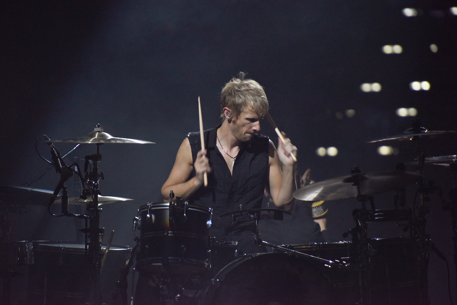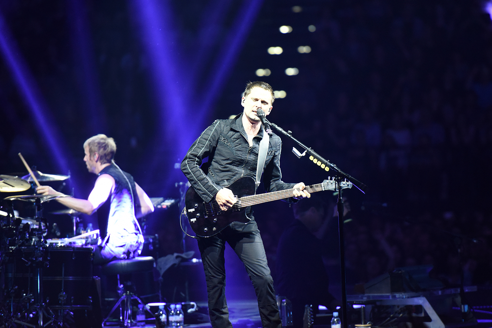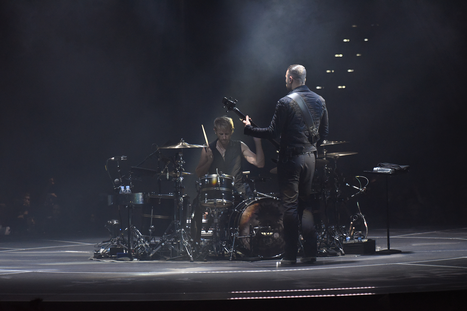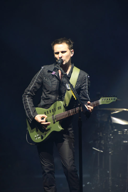 Muse retourne en tournée dans les salles et c’est tout de suite le délire. Les deux concerts planifiés à Zürich étaient-sold out en quelques minutes pour plus de 26’000 fans, qui ont rempli la plus grande salle suisse dans tous les recoins disponibles. Les Anglais de Muse sont bien connus pour leur shows spectaculaires et blindés de technologie, mais ce qu’ils ont concocté pour ce « Drones » tour amène le concept de « concert d’arène » à un niveau supérieur. Un spectacle qu’on pourrait assimiler à « The Wall » de Roger Waters ou le « Full Arsenal » de Metallica. Et comme ce dernier, la tournée est jouée « on the round », avec la scène au milieu de la salle, pour permettre aux spectateurs de jouir du spectacle au maximum, que ce soit au niveau sonore ou visuel, depuis n’importe quelle place de l’arène (et au groupe de vendre plus de tickets !) Une plateforme ronde et tournante forme la partie principale de la scène, avec batterie au centre et plusieurs micros aux bords. Depuis le centre deux énormes catwalks amènes à deux plateformes placées aux extrémités de la salle. Le tout entouré d’autant de lumières et d’effets qu’il serait difficile à compter : des balles transparentes avec des lumières qui volent au dessus de la foule comme des drones, projections de toutes sortes sur un écran rond sur la plateforme principale ainsi que sur des écrans géants qui descendent pour couvrir toute la longueur de la scène. Sans compter les hologrammes des musiciens ou le piano qui sorte depuis une des plateformes. Vous suivez? Pour faire court, magistral!
