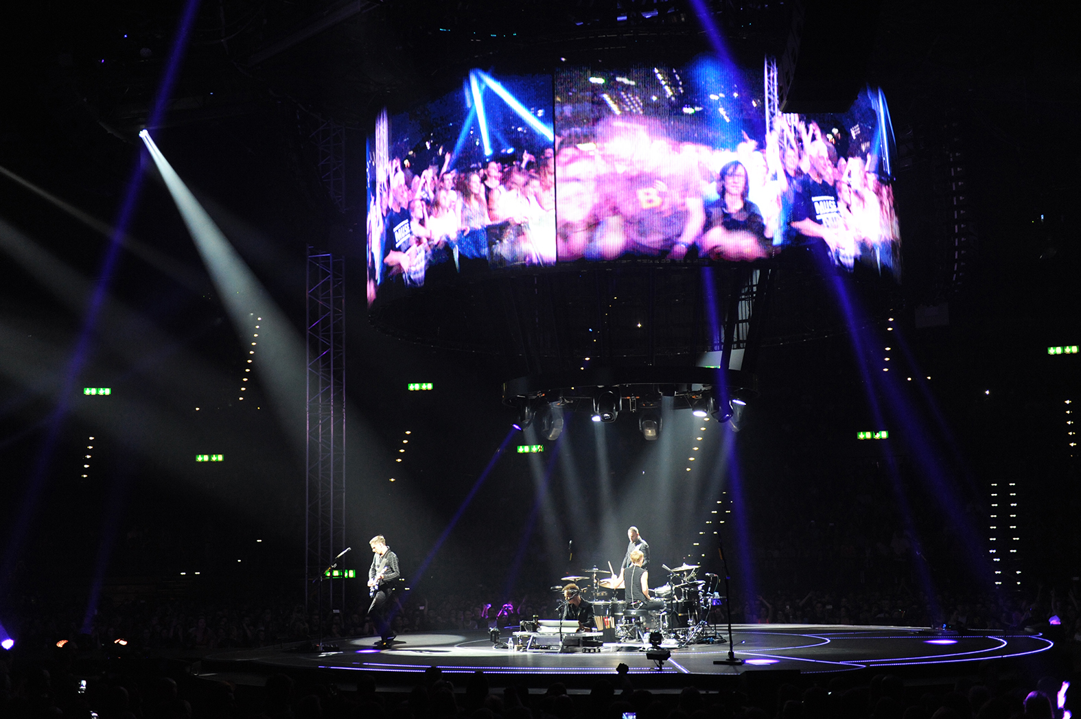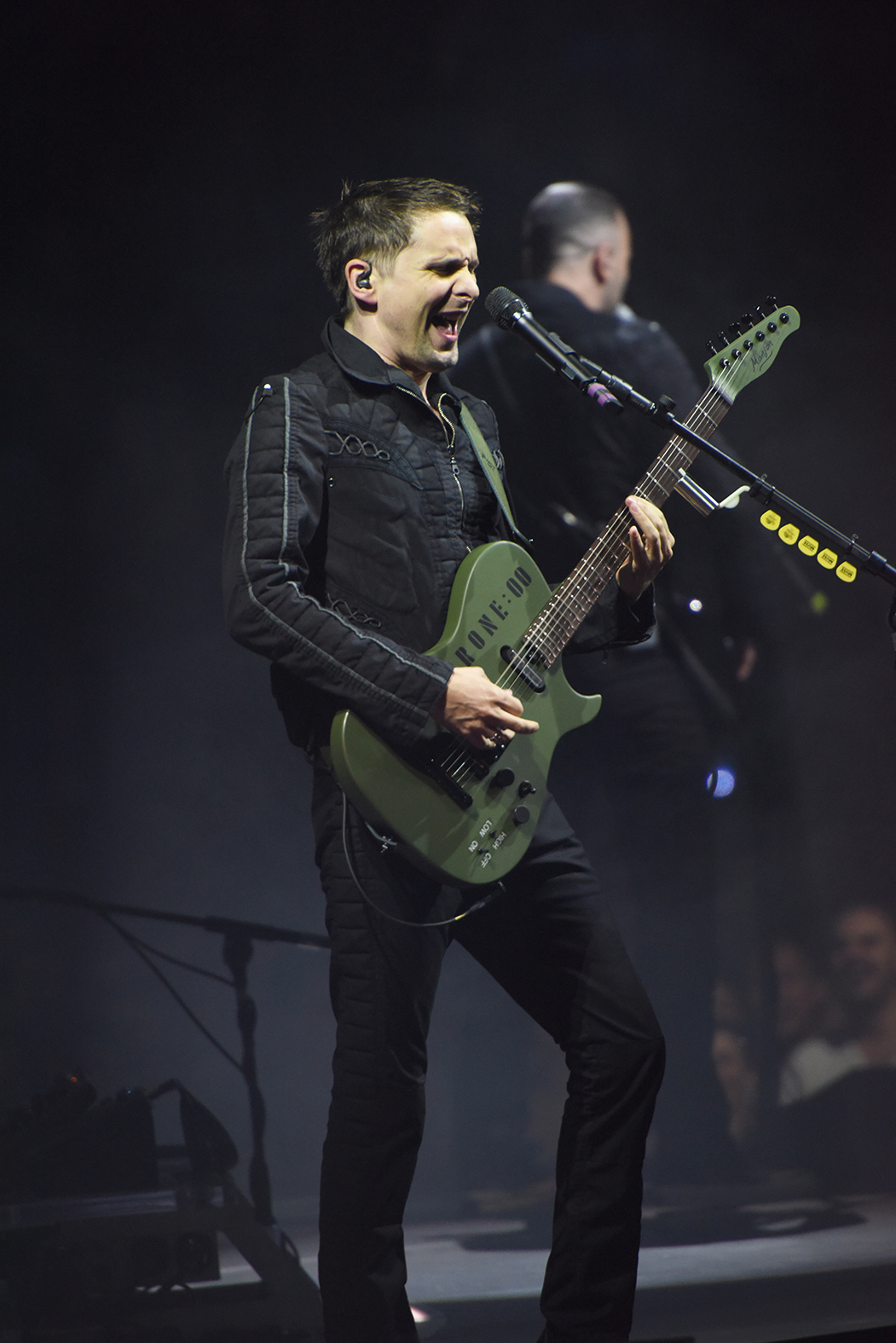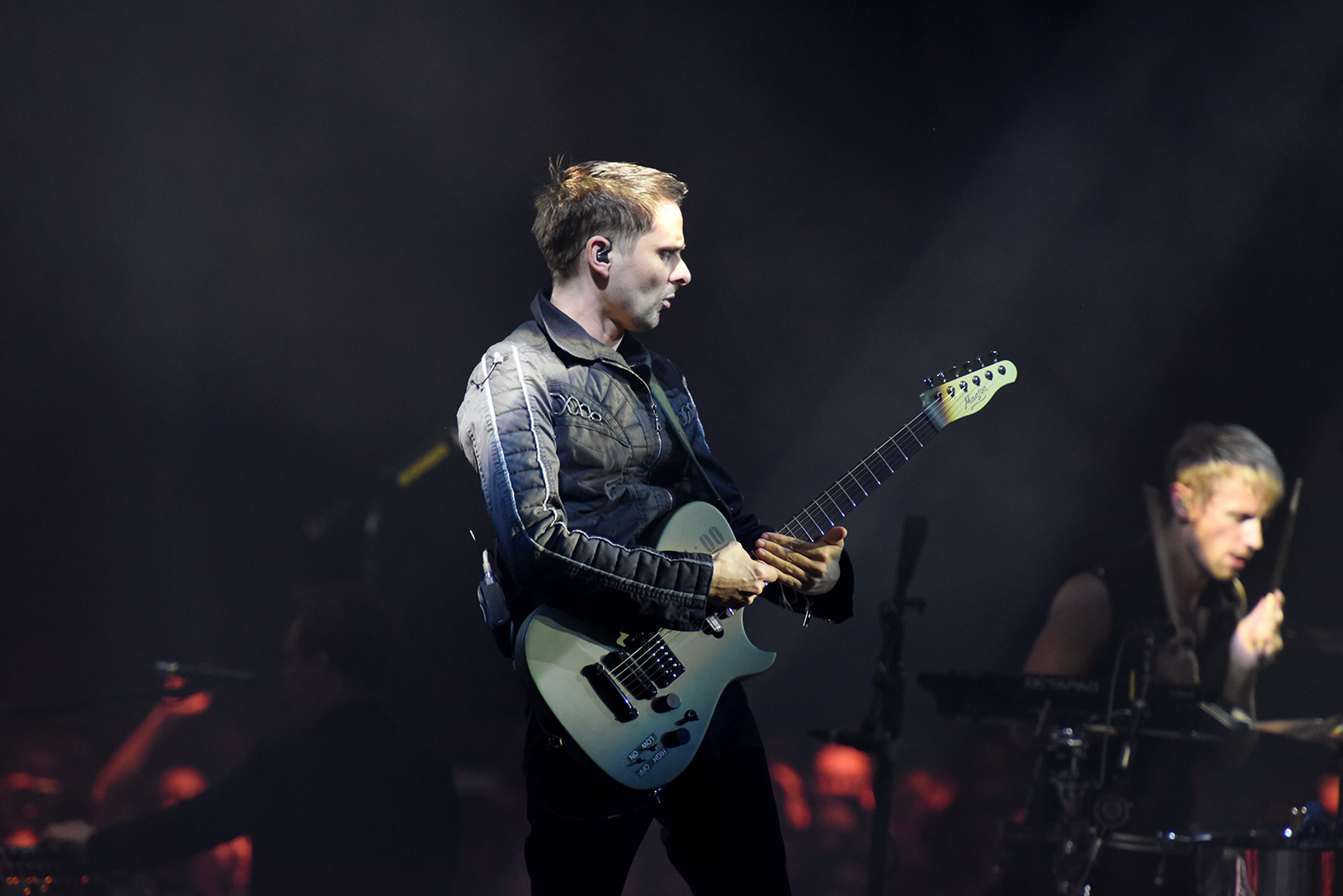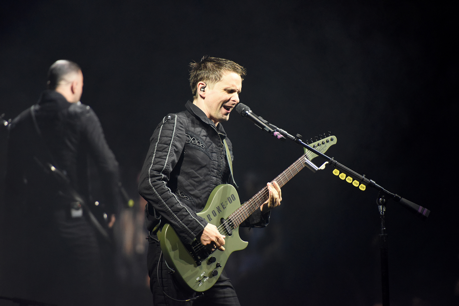 Muse retourne en tournée dans les salles et c’est tout de suite le délire. Les deux concerts planifiés à Zürich étaient-sold out en quelques minutes pour plus de 26’000 fans, qui ont rempli la plus grande salle suisse dans tous les recoins disponibles. Les Anglais de Muse sont bien connus pour leur shows spectaculaires et blindés de technologie, mais ce qu’ils ont concocté pour ce « Drones » tour amène le concept de « concert d’arène » à un niveau supérieur. Un spectacle qu’on pourrait assimiler à « The Wall » de Roger Waters ou le « Full Arsenal » de Metallica. Et comme ce dernier, la tournée est jouée « on the round », avec la scène au milieu de la salle, pour permettre aux spectateurs de jouir du spectacle au maximum, que ce soit au niveau sonore ou visuel, depuis n’importe quelle place de l’arène (et au groupe de vendre plus de tickets !) Une plateforme ronde et tournante forme la partie principale de la scène, avec batterie au centre et plusieurs micros aux bords. Depuis le centre deux énormes catwalks amènes à deux plateformes placées aux extrémités de la salle. Le tout entouré d’autant de lumières et d’effets qu’il serait difficile à compter : des balles transparentes avec des lumières qui volent au dessus de la foule comme des drones, projections de toutes sortes sur un écran rond sur la plateforme principale ainsi que sur des écrans géants qui descendent pour couvrir toute la longueur de la scène. Sans compter les hologrammes des musiciens ou le piano qui sorte depuis une des plateformes. Vous suivez? Pour faire court, magistral!