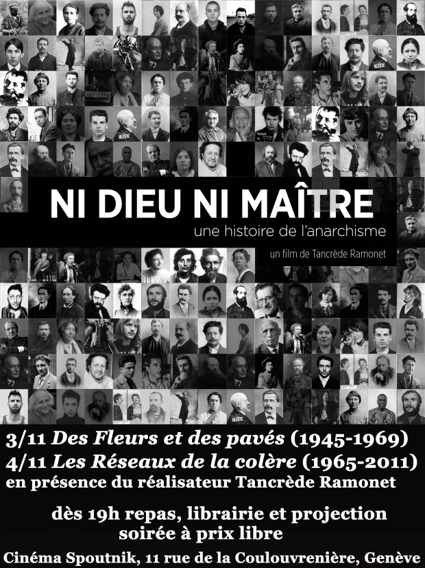 Les 3 et 4 novembre seront projetés au cinéma Spoutnik à Genève les épisodes 3 et 4 du documentaire sur l’histoire de l’anarchisme « Ni Dieu Ni Maître« .