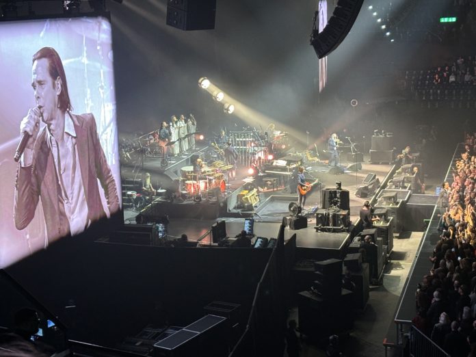 Deux ans après une nouvelle tournée épique et des prestationsinoubliables dans les arènes de Fourvière à Lyon et au Montreux Jazz Festival notamment, Nick Cave arrive sur scène précédé des Bad Seeds et de choristes gospel. Elégant dans son éternel costume sombre, souriant, à l’aise, saluant le public, il ouvre le concert avec trois titres du nouvel album, ‘Frogs’ – ‘Wild God’ et ‘Song of the Lake’. Le ton est donné,chaleureux, empathique, mystique, halluciné. Nick a tôt fait de venir sur le devant de la scène et de parcourir le catwalk qui longe les barrières de la première rangée, signant des vinyles ou serrant des mains. ‘O Children’, sublime, prend une dimension supérieure avec l’appui des choristes. Des frissons parcourent les fans en communion avec l’artiste qui a perdu deux fils dans des conditions tragiques par le passé.