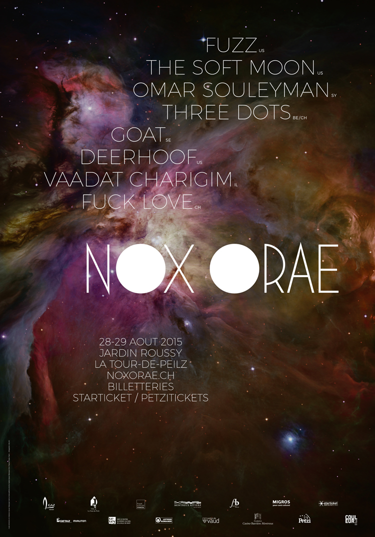 Le Nox Orae – le bout de la nuit dans la langue d’Ovide (le premier qui fredonne ‘Les Démons de Minuit’ sort) – avait déjà fait fort en 2014 en rassemblant les affoleurs de critiques que sont Thee Oh Sees, Warpaint et The Horrors. C’était une montée d’ambition par rapport aux éditions précédentes, telle qu’on se demandait si le Nox Orae était sur le point de se hisser dans la cour des festivals à surveiller de près. Maintenant le doute est balayé, la prog’ de l’édition 2015 fait déferler une vague de bon goût à même de réveiller le hipster qui sommeille en vous (celui qui vous force à suivre les Inrocks en cachette). On pense à Goat tout d’abord, vous savez, ce projet suédois aux airs voodoo de rock psychédélique expérimental, baigné d’influences fusion, qui joue pieds nus et en costumes inquiétants. Le Nox Orae les emprunte ici à la programmation 2014 du Kilbi Festival, comme Thee Oh Sees l’année passée ; mais lorsqu’on tient une telle référence comme source d’inspiration, c’est les spectateurs qui en profitent les premiers. Goat a la faiblesse – la force ! – de parvenir à s’affranchir des sentiers battus sans pour autant se donner des airs inaccessibles ou condescendants. Leur dernier album, ‘Commune’, témoigne de ce mélange inattendu d’exotisme et d’ouverture. Cet aspect se retrouve également dans deux noms qui vont piocher au Moyen-Orient. D’abord les sonorités folkloriques du Syrien Omar Souleyman, qui a fait ses premiers pas dans la musique en tant qu’animateur des mariages de la région. Il s’est ensuite exporté en collaborant, entre autres, avec Björk, avant d’écumer les salles d’Europe, comme Fri-son en 2013. Sa popularité est valorisante dans la mesure où elle témoigne de l’ouverture musicale du public occidental, qui est parvenu à reconnaître le talent de cet artiste pourtant baigné dans les sonorités traditionnelles de son pays. Aussi oriental, les Israëliens de Vaadat Chagirim puisent leurs influences davantage à l’ouest, concoctant un shoegaze évoquant avec évidence My Bloody Valentine, à la différence près que les paroles ne sont pas en anglais. Le deuxième soir, on tient Fuzz. Ça ne vous dit rien ? Attendez voir, si je vous dis, scène rock psyché de San Francisco, vous me dites ? Thee Oh Sees ? Oui bon, mais encore ? Ty Segall ? Tout juste auguste ! Fuzz, c’est un de ses nombreux projets montés pour exprimer sa passion pour les décibels. Un seul album au compteur pour l’instant sous ce nom, mais quel album ! On dit souvent ‘Méfiez-vous de l’écrivain à un seul livre.’, l’adage pourrait également s’appliquer aux groupes de rock en l’occurrence, tant cette pépite est réussie. Il reste bien Deerhoof, dans un registre au moins aussi expérimental que Goat, dont on pourrait vous parler, mais hélas on a encore l’esprit dérangé par le style vocal de sa chanteuse, et du jeu déconstruit de ses guitaristes, et de ses percussions sans queue ni tête. On s’en remet et on revient vers vous.