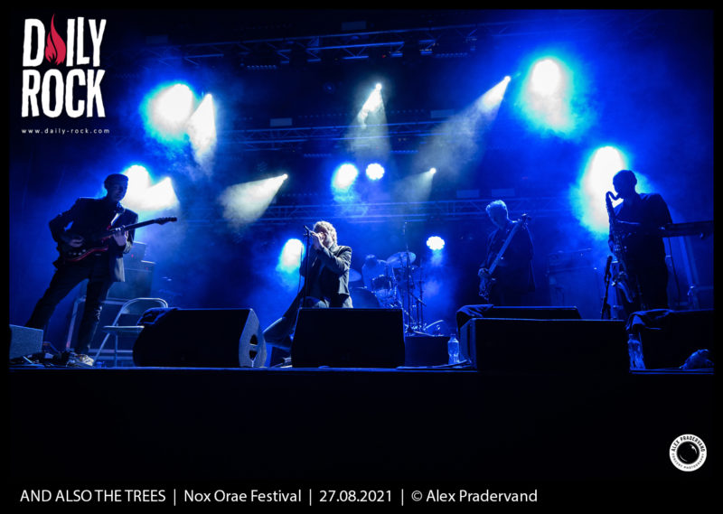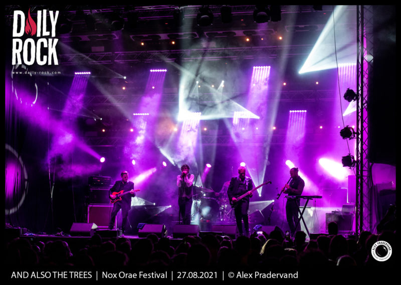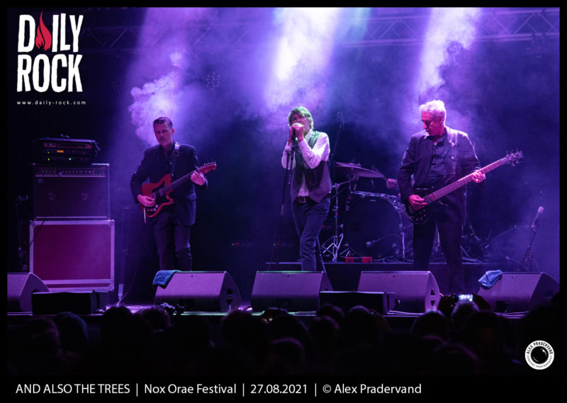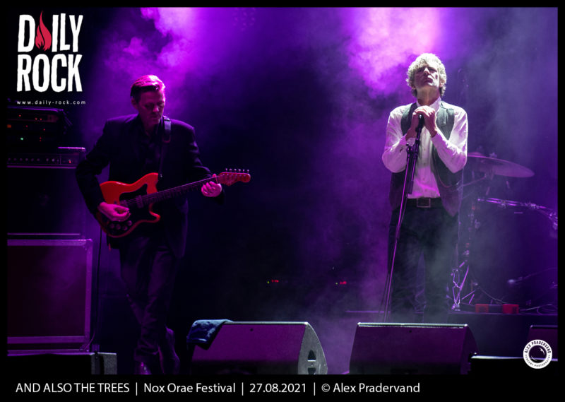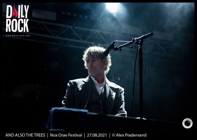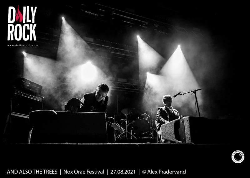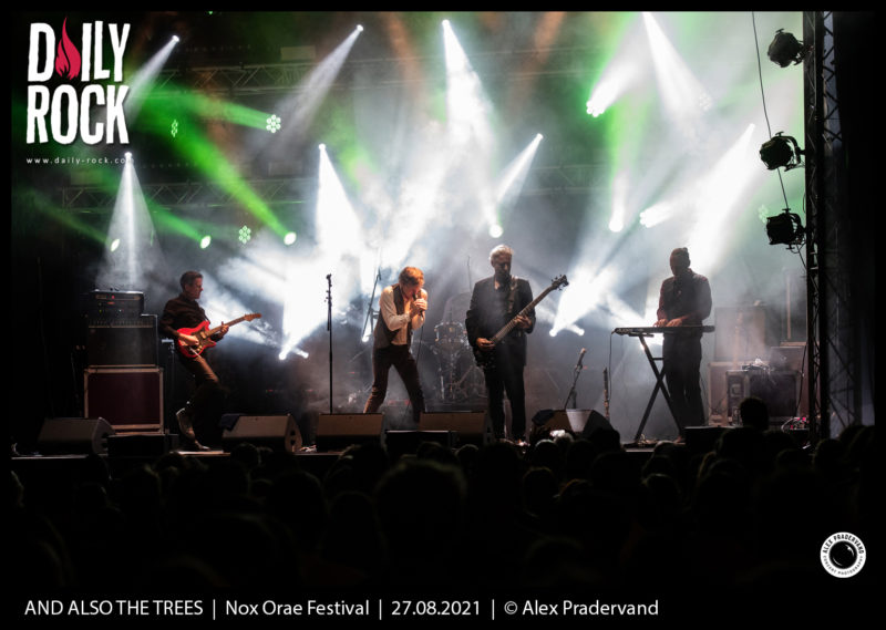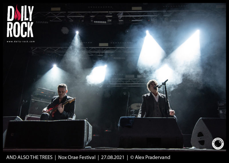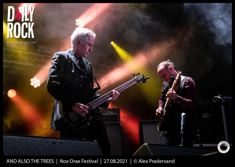 20.30 heures, la nuit s’installe. Le vent aussi et la température descend. C’est l’heure du concert tant attendu d’And Also The Trees. Les deux frères Jones prennent possession de la scène sous les applaudissements. Ils sont assis dans la pénombre, éclairés seulement de dos. Ils jouent ainsi en duo, pratiquement sans bouger, les yeux fermés, durant un bon quart d’heure avant d’être rejoints par le groupe au complet. Ouf, ils sont tous là. Nox 1, Brexit 0, Covid 0.