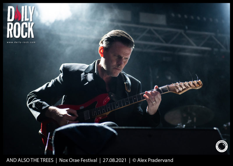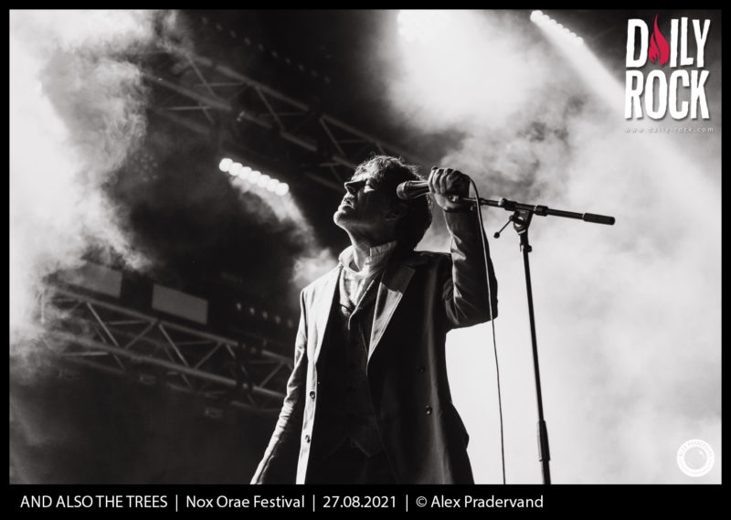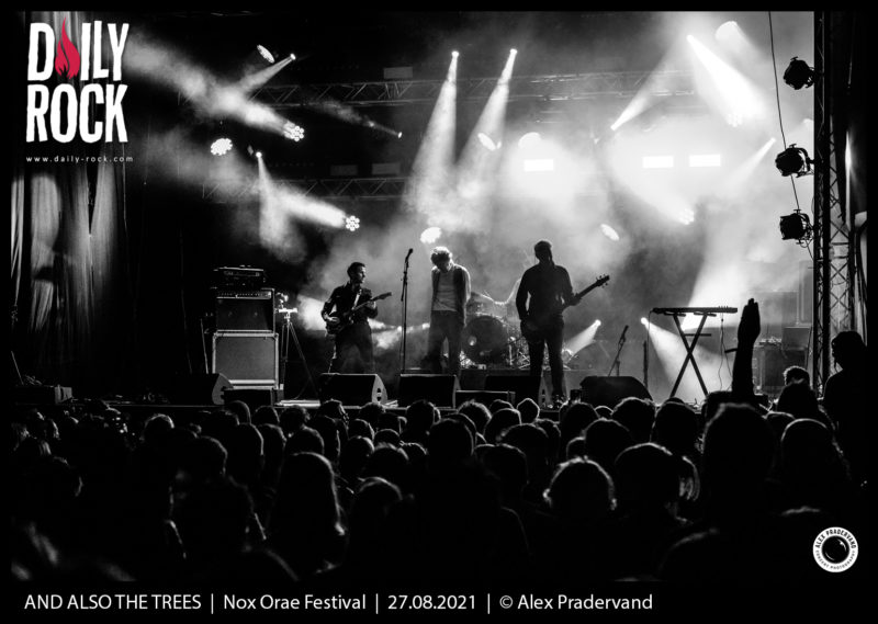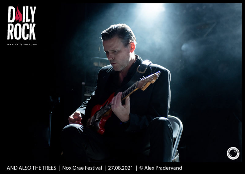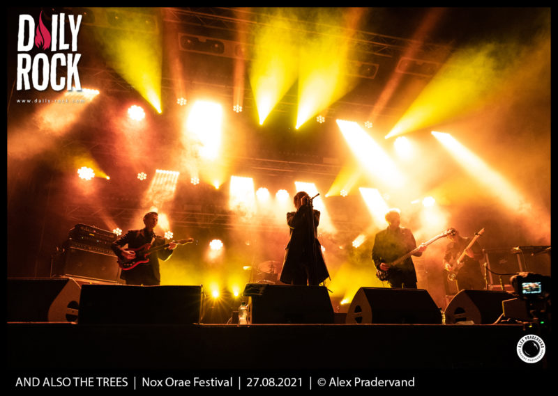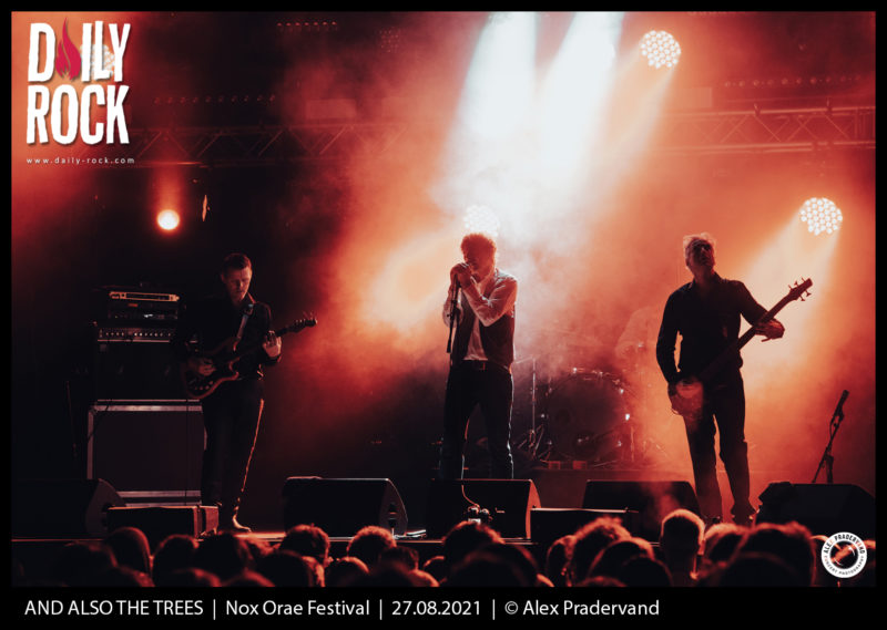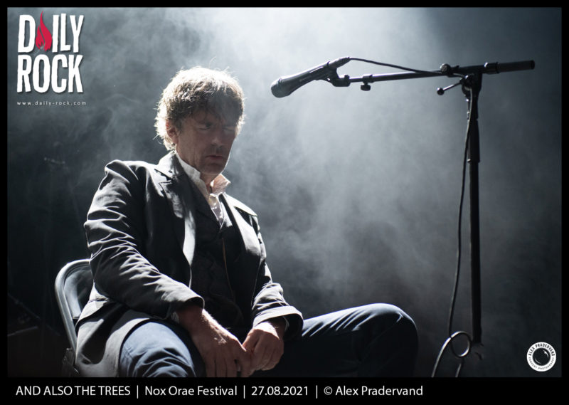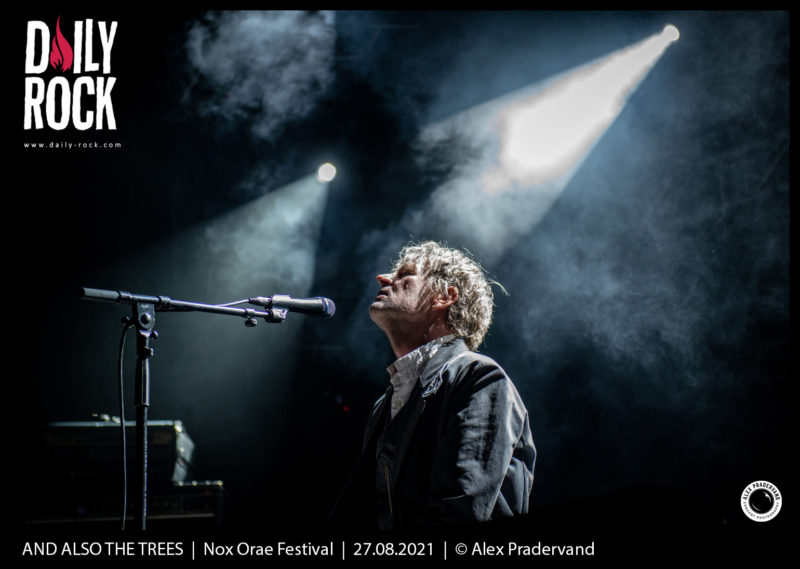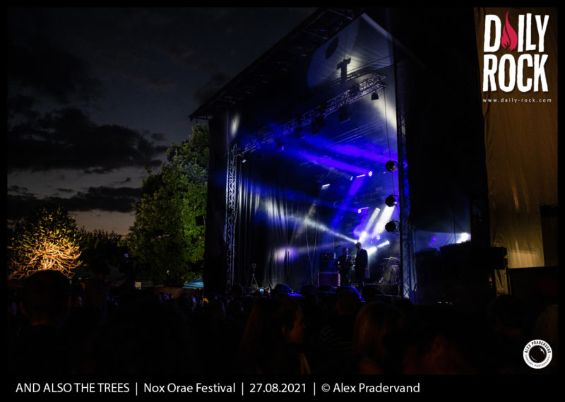 20.30 heures, la nuit s’installe. Le vent aussi et la température descend. C’est l’heure du concert tant attendu d’And Also The Trees. Les deux frères Jones prennent possession de la scène sous les applaudissements. Ils sont assis dans la pénombre, éclairés seulement de dos. Ils jouent ainsi en duo, pratiquement sans bouger, les yeux fermés, durant un bon quart d’heure avant d’être rejoints par le groupe au complet. Ouf, ils sont tous là. Nox 1, Brexit 0, Covid 0.