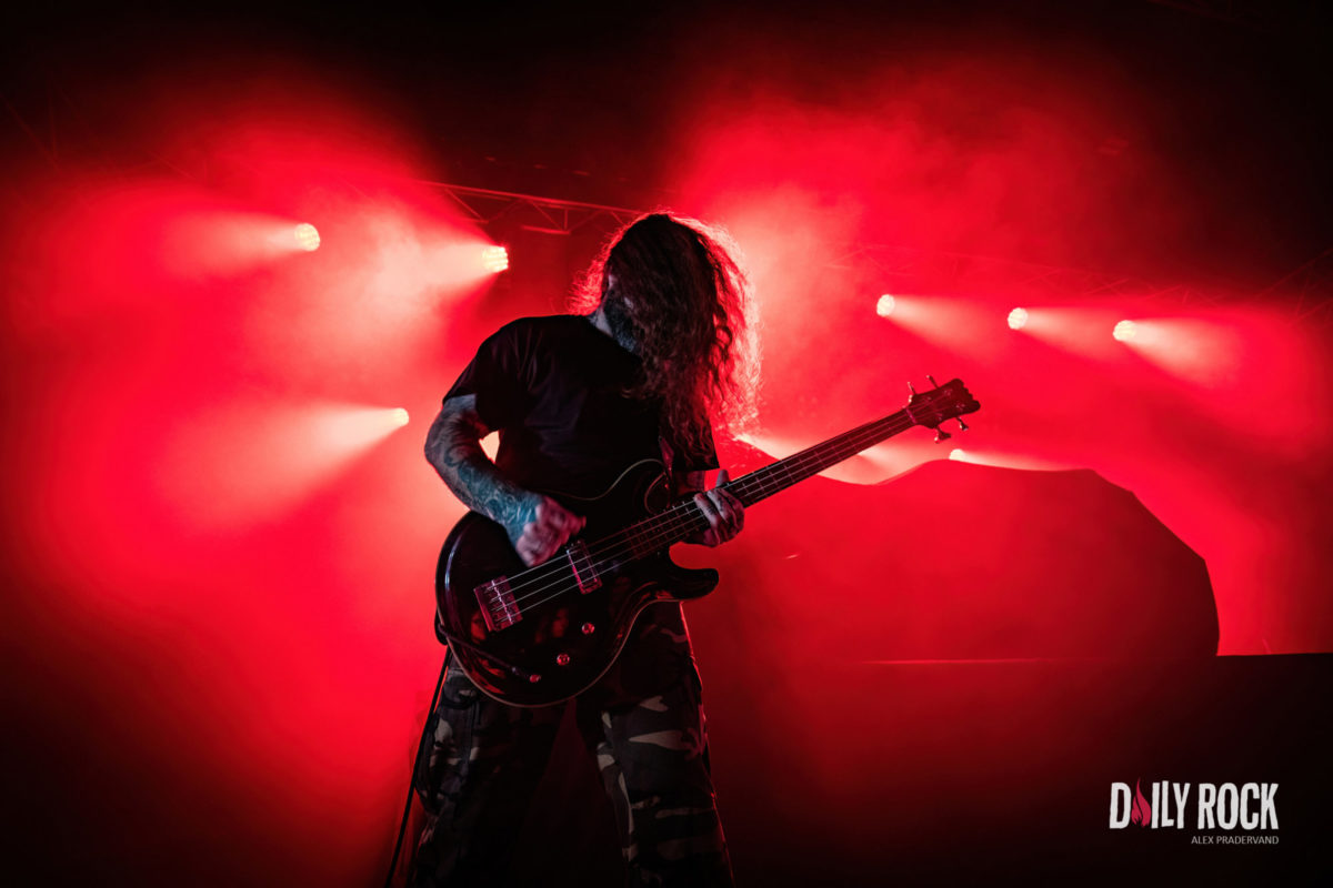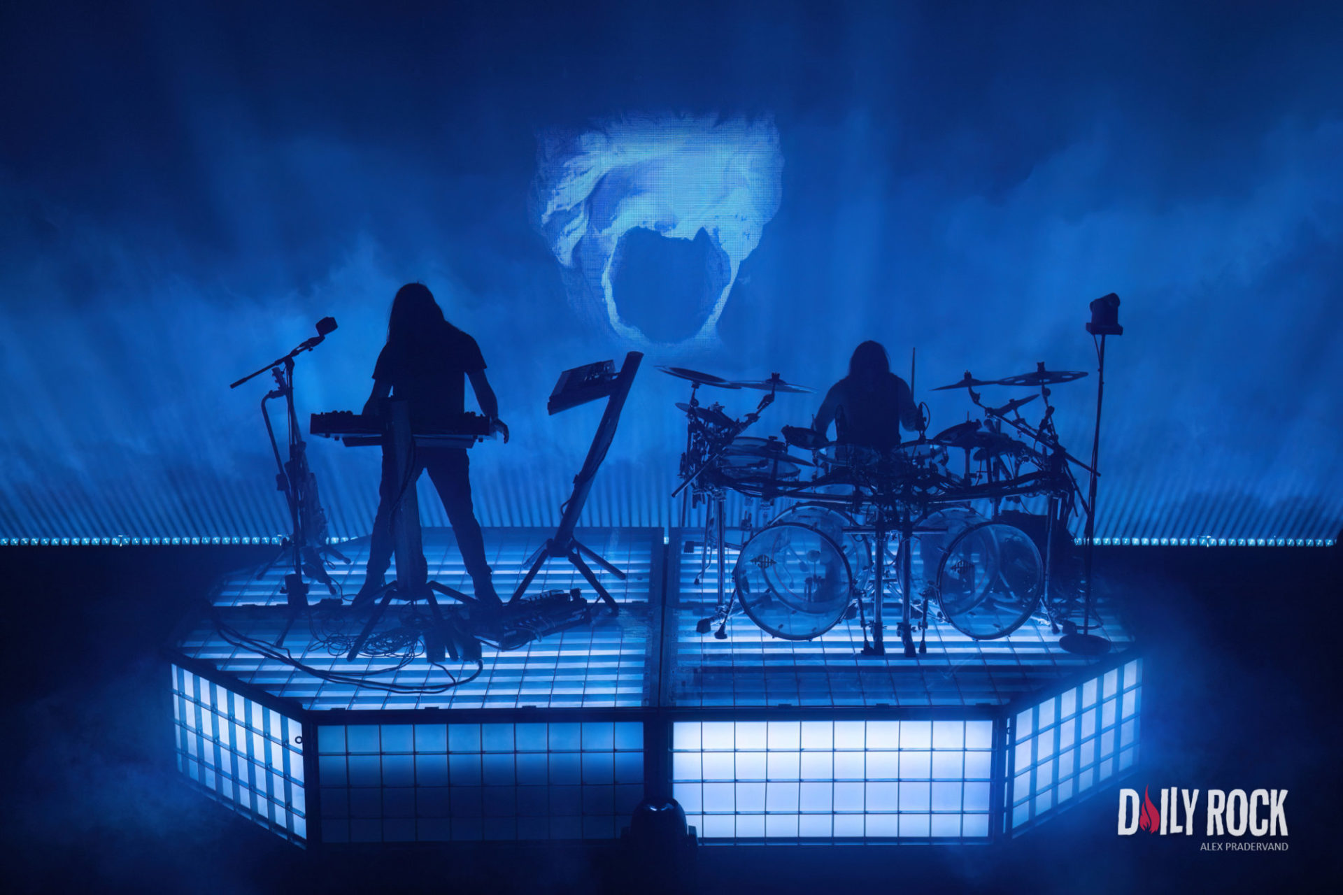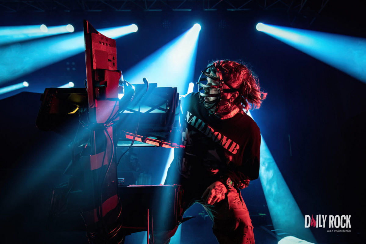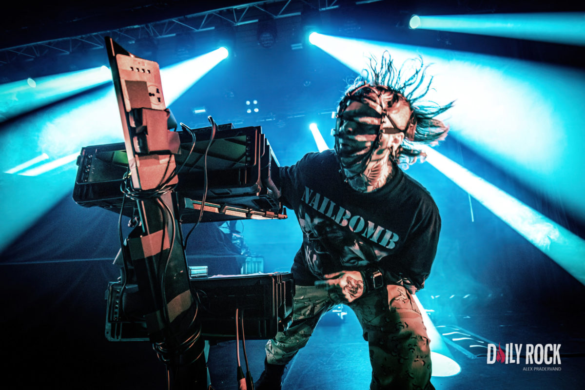 Pertubator en live, c’est une expérience à vivre ! Plein les yeux et les oreilles, en particulier grâce à la rangée de lights posée sur la scène face au public. Il y avait de quoi faire fondre quelques rétines. Perturbator, des concerts qui devraient être organisés en partenariat avec les hopitaux ophtalmiques des villes où ils jouent. Même s’ils ne sont que deux et que le matériel est déjà sur scène, il y a pas mal d’attente jusqu’au début du set. Les musiciens sont installés sur une structure surlevée, ce qui fait que l’on ne voit guère le batteur (mais on l’entend c’est le principal), le tout est entouré d’un lightshow supruissant comme la musique. Le son est vraiment bien dosé, c’est super propre. Et surtout cela envoie ! Aussi impressionant que sur disque pour le plus grand bonheur d’une salle bien remplie.