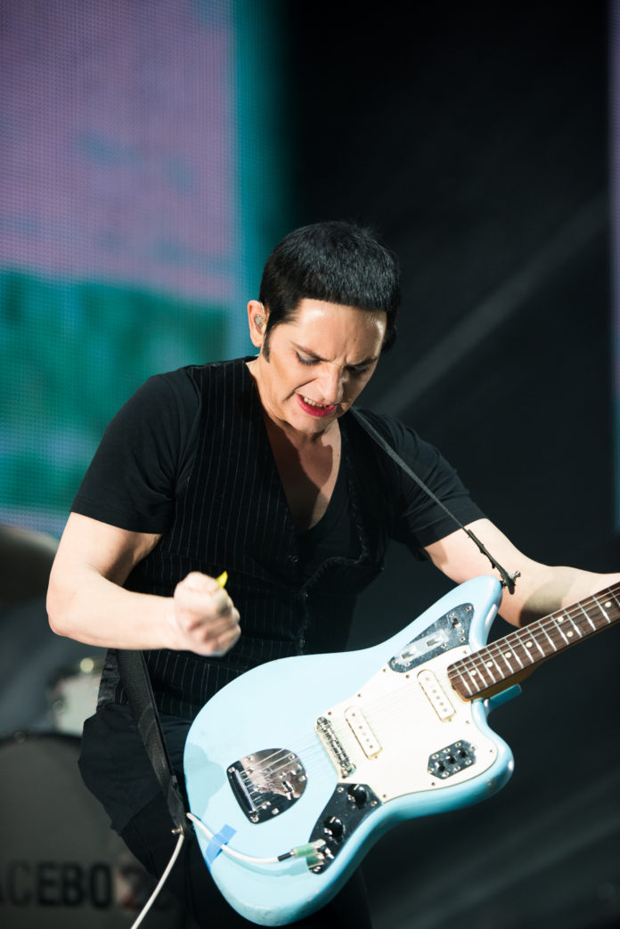 Le spectacle démarre avec un clip projeté sur l’énorme écran LCD au fond de la scène en hommage à Leonard Cohen, l’artiste canadien disparu seulement 10 jours avant. A suivre le clip de ‘Every You Every Me’ a créé la première surprise de la soirée. Le morceau, entre les plus connus et aimés par les fans, ne sera pas joué en live pendant le concert. Un choix au moins particulier de ne pas effectuer live un hit de ce calibre. Une fois que les membres entrés sur la scène sombre, le concert démarre avec ‘Pure Morning’ suivie par ‘Loud Like Love’ et ‘Jesus’ Son’. Les deux membres historiques du groupe, le charismatique Brian Molko et le bassiste Stefan Olsdal, sont bien motivés, surtout Brian, qui interprète les mots de ces morceaux avec passion et chargé d’énergie. A l’arrière un back-up band de multi-instrumentistes de grande classe a créé un tapis sonore de grand effet. Bill Lloyd (bass guitar, keyboards, piano), Fiona Brice (violon, clavier, theremin, percussion, backing vocals), Nick Gavrilovic (guitare, lap steel guitare, keyboards, backing vocals), Matt Lunn (batterie, percussion) changent d’instruments selon les besoins du morceau d’une manière impressionnante et donnent plus de dynamique et d’épaisseur aussi aux morceaux plus directs et rock. Le son de son côté est vraiment clair et puissant, comme je n’avais entendu depuis longtemps dans cette salle. Après un début plus rock, le groupe se promène sur une route plus tranquille et atmosphérique au son de morceaux comme ’20 Years’, ‘Protect Me From What I Want’ ou une particulière et lente version de ’36 Degrees’. Le public, déjà pas trop énergique, reste très passif et décontracté et jouis de l’atmosphère créée par les Anglais accompagnés par des projections très suggestives sur le grand écran. Brian s’en rend compte et, plus bavard que dans d’autres occasions, essaye d’impliquer le public et de les faire danser. ‘For What Is Worth’ nous ramène sur des voies plus rock et après ‘The Bitter End’ le groupe se prend une petite pause. ‘Teenage Angst’, ‘Nancy Boy’ et ‘Infra Red’ font partie des bis et le public se laisse enfin aller, aussi celui assis dans les tribunes presque vides. Le groupe rentre sur scène une toute dernière fois pour une version très intense de la reprise de ‘Running Up That Hill’ de Kate Bush pour terminer un concert de grande qualité. Dommage seulement pour l’atmosphère un peu froide crée par cette énorme salle trop vide pour un groupe de ce calibre. (Andy Gaggioli)