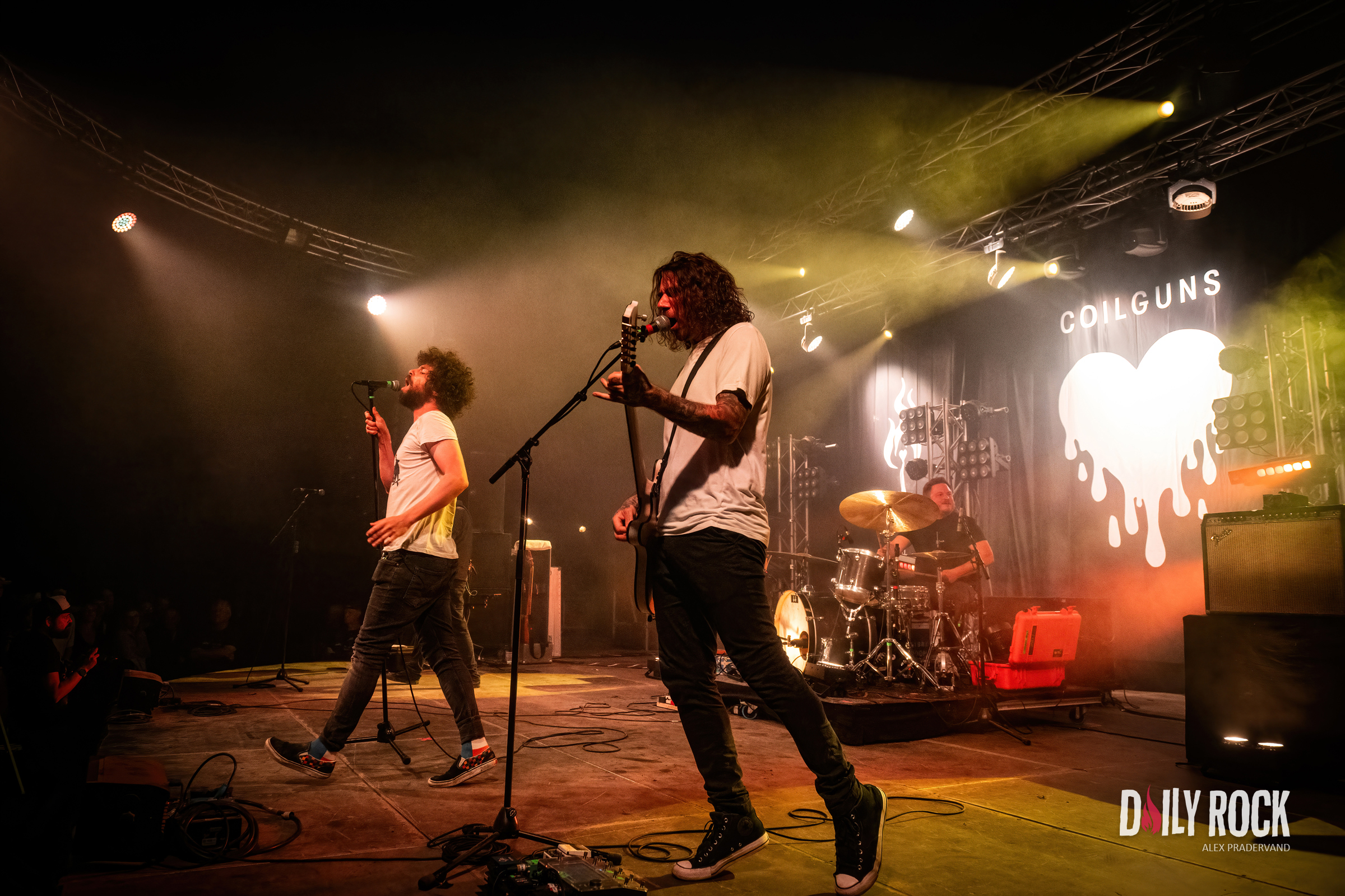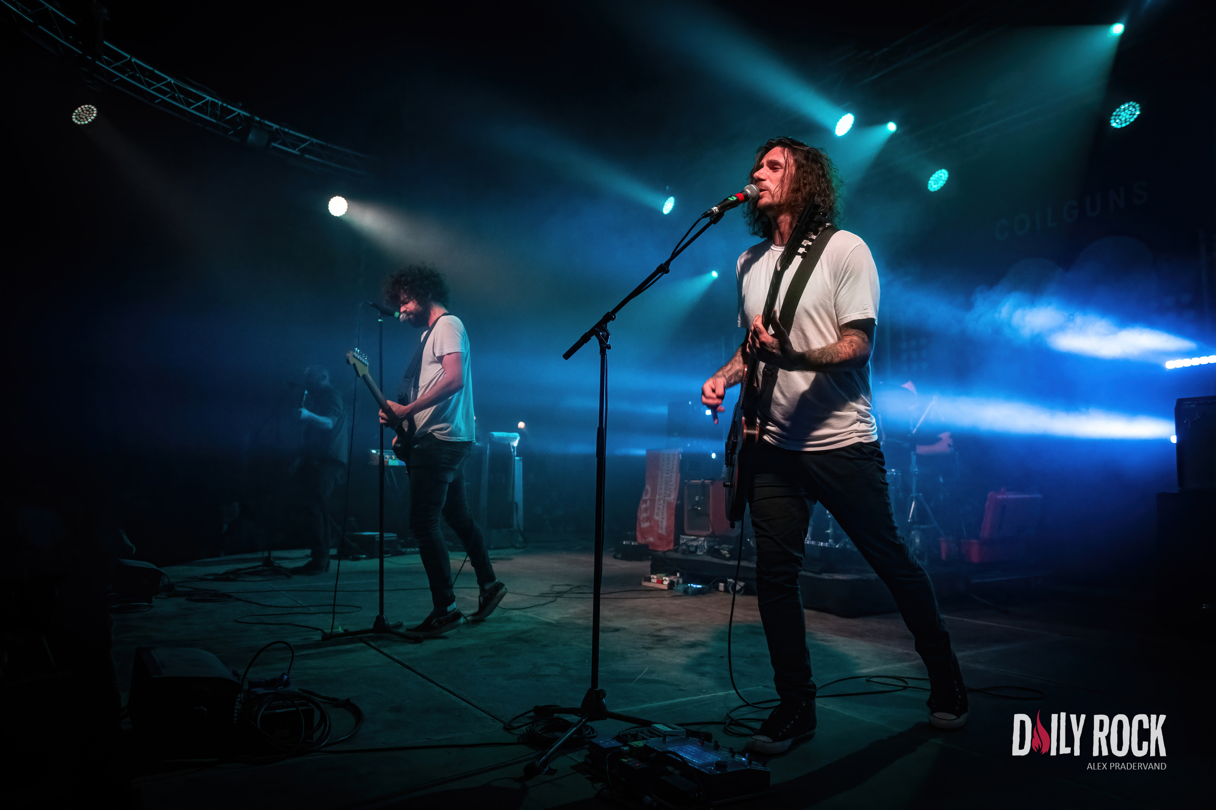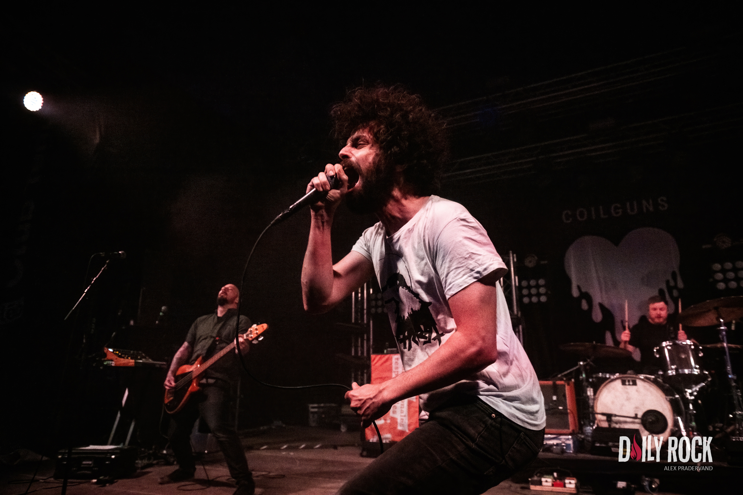Tout cela c’est bien, mais maintenant faut que cela explose. On est quand même venu pour en prendre plein les oreilles. Quoi de mieux que le retour de Coilguns au Paléo ? Dans le Club Tent, mis à la bonne température par Théa peu avant, le public est là en nombre et avec la pluie qui tombe vraiment fort maintenant, il n’y a plus un cm carré de libre sous la tente.
