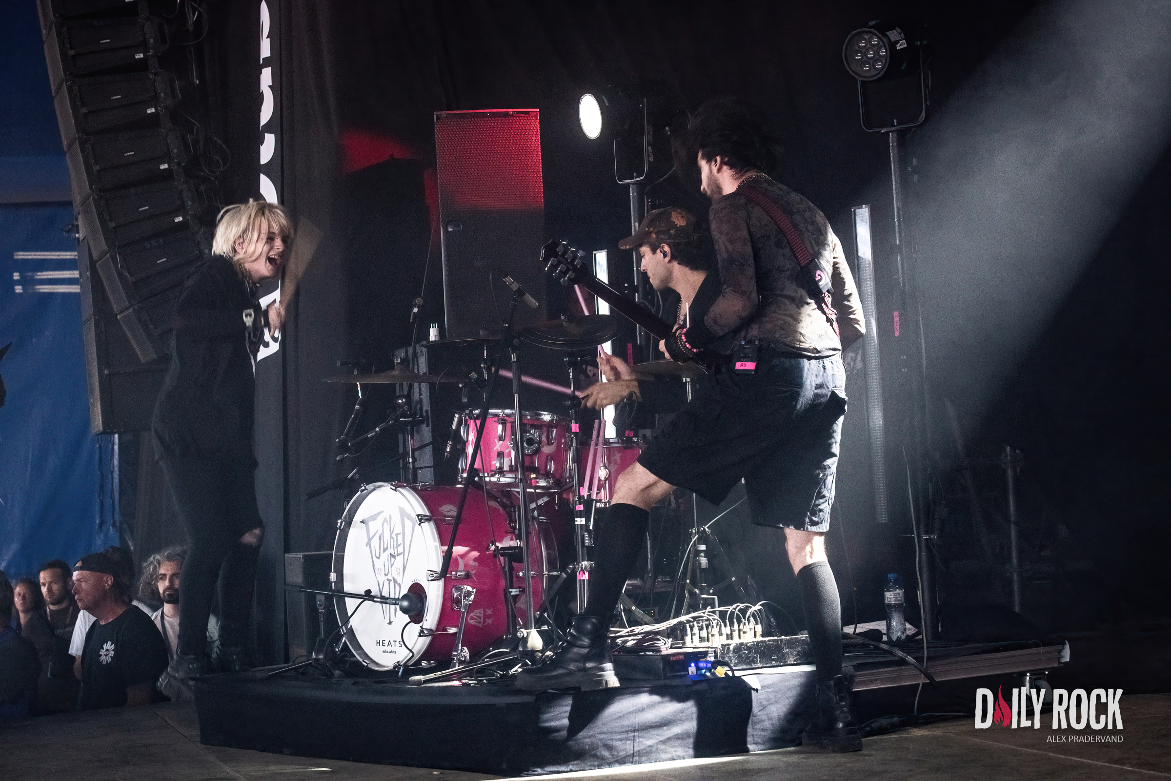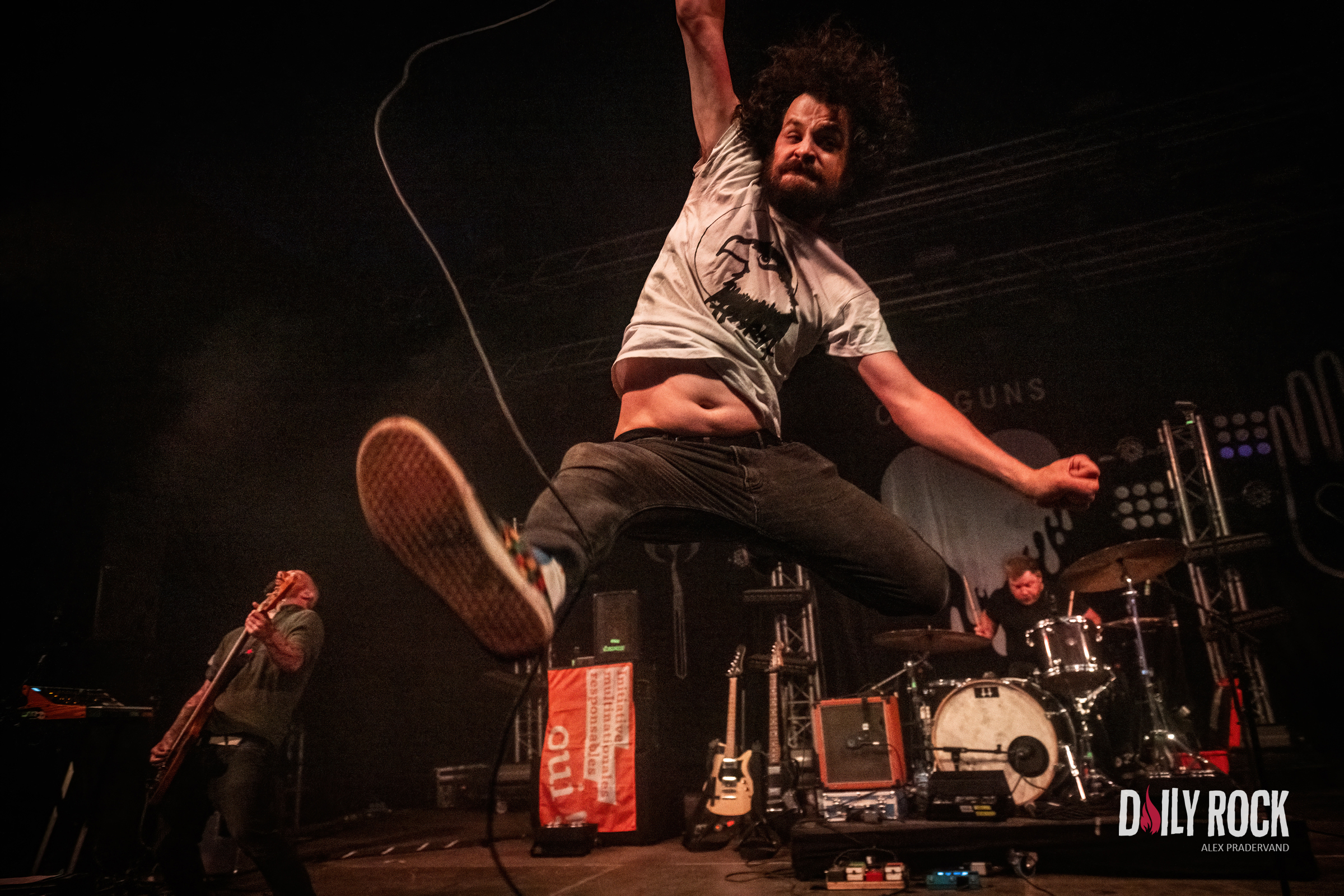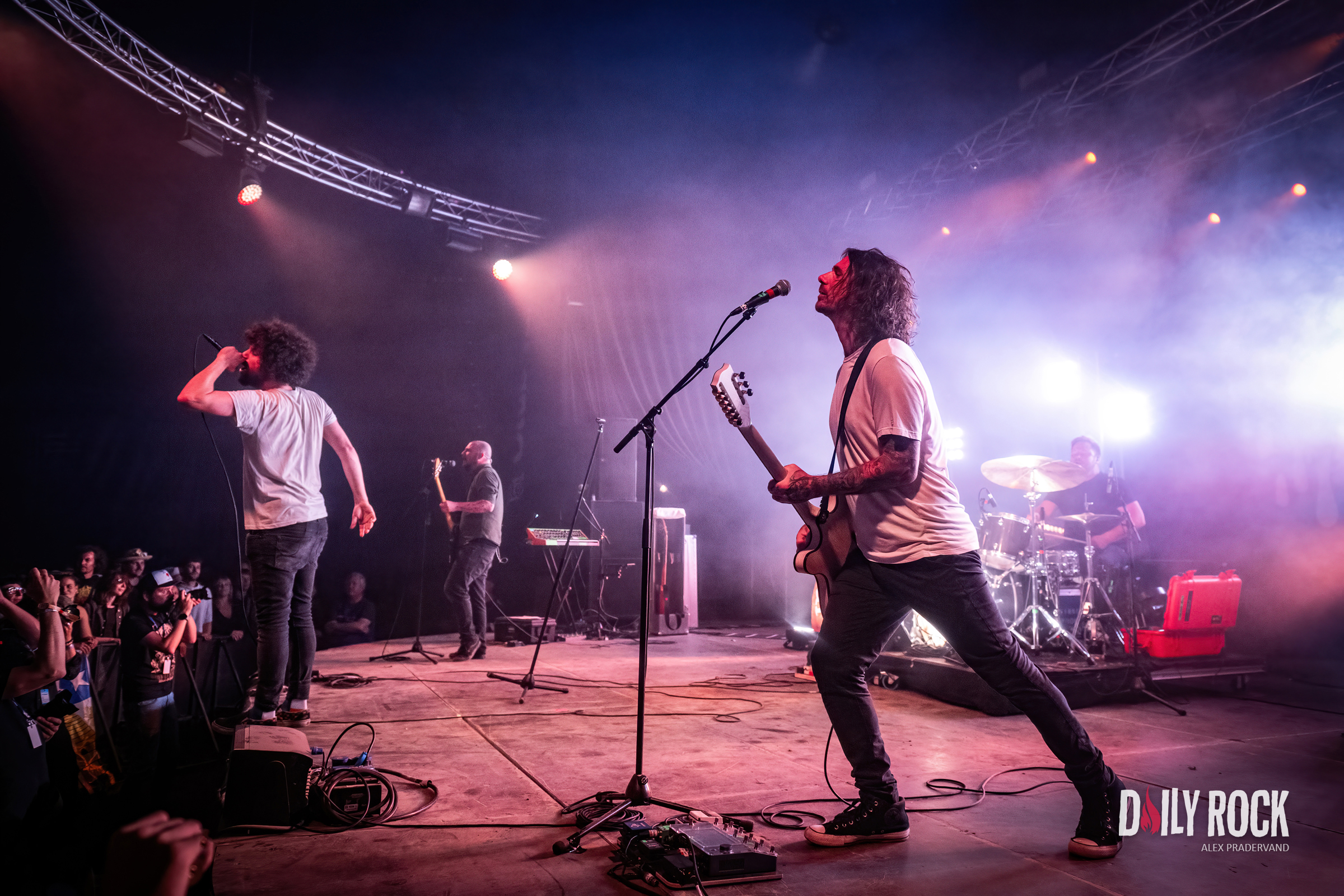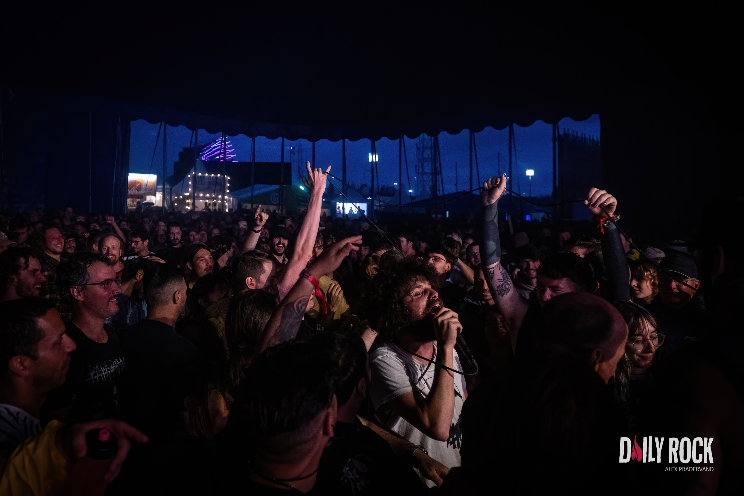 Tout cela c’est bien, mais maintenant faut que cela explose. On est quand même venu pour en prendre plein les oreilles. Quoi de mieux que le retour de Coilguns au Paléo ? Dans le Club Tent, mis à la bonne température par Théa peu avant, le public est là en nombre et avec la pluie qui tombe vraiment fort maintenant, il n’y a plus un cm carré de libre sous la tente.