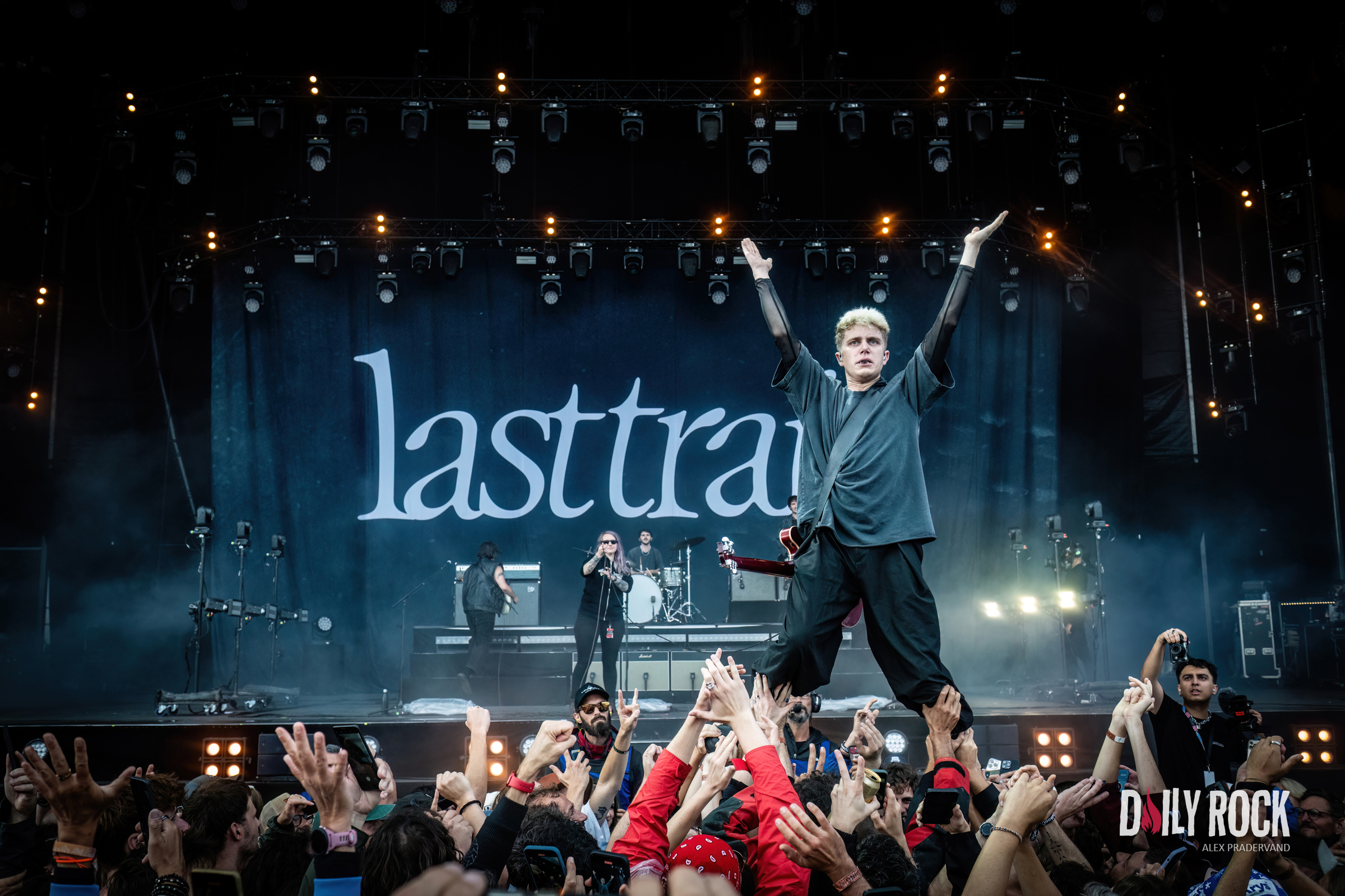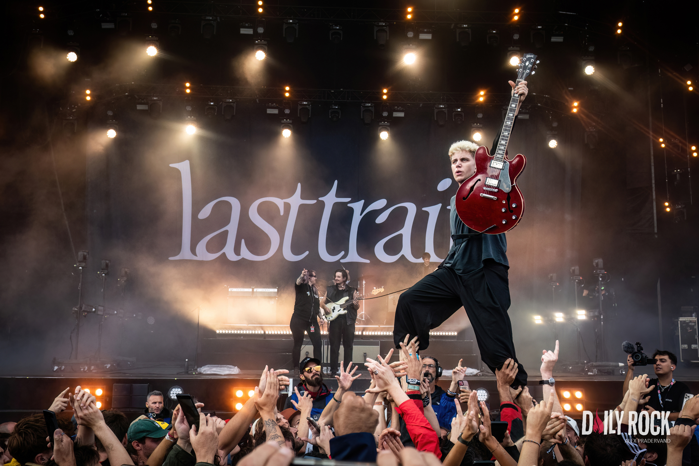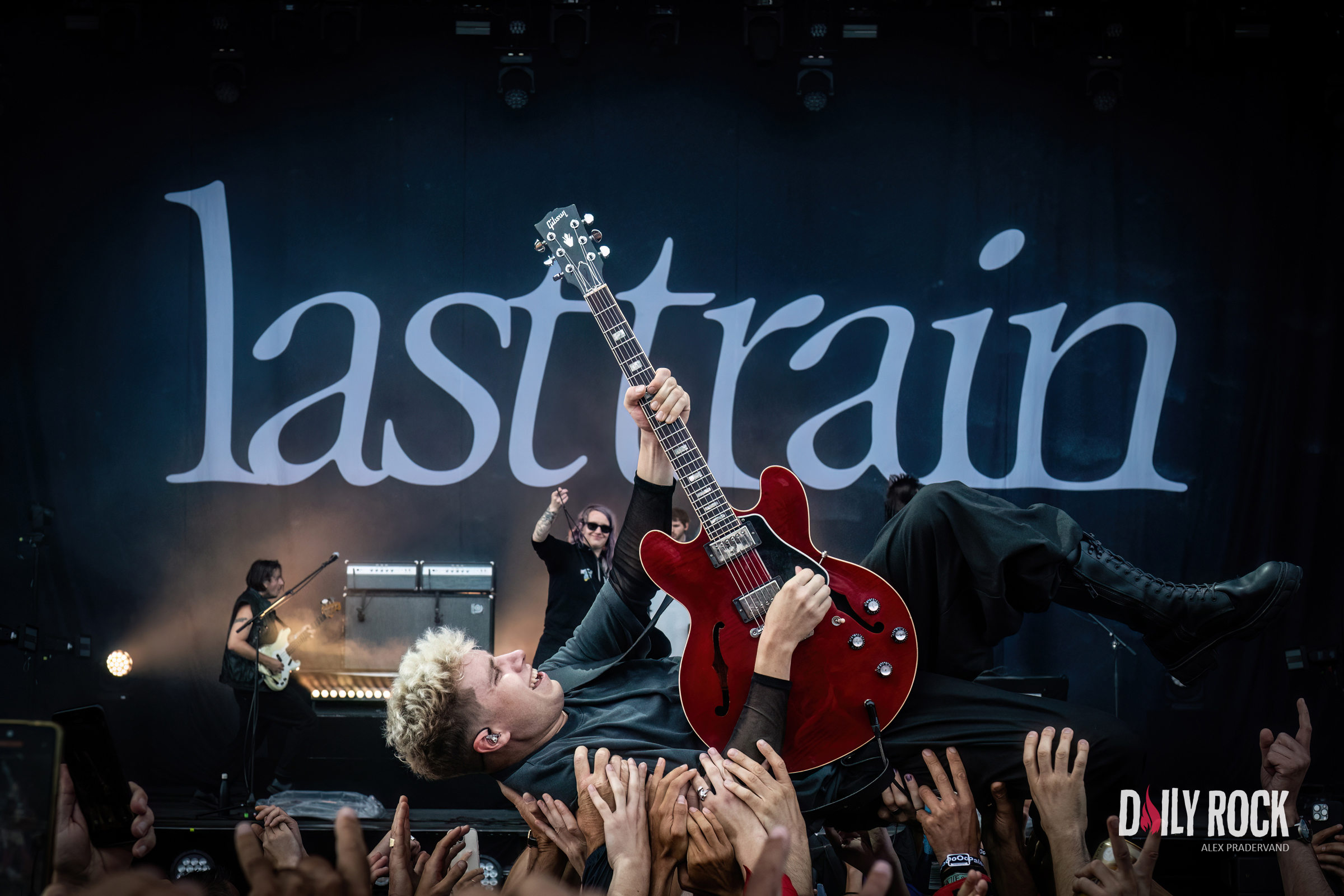 Les gars sont manifestement contents d’être là et de jouer ensemble. Le public répond présent alors que la pluie baisse d’intensité pour pratiquement s’arrêter. Grosse ambiance aussi quand le chanteur demande à la foule de s’avance car il veut essayer un truc, c’est-à-dire marcher dessus avec sa guitare à la main. Un classique des concerts de Last Train mais qui fait son effet à chaque fois.