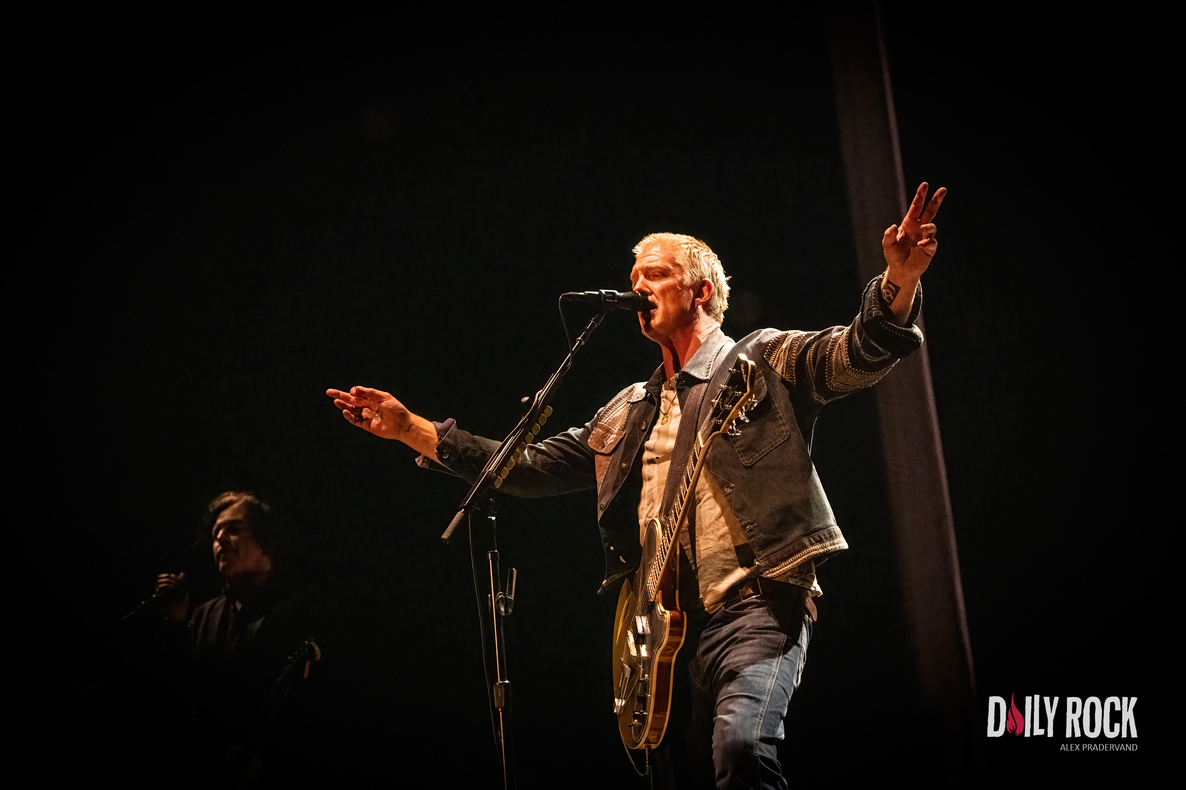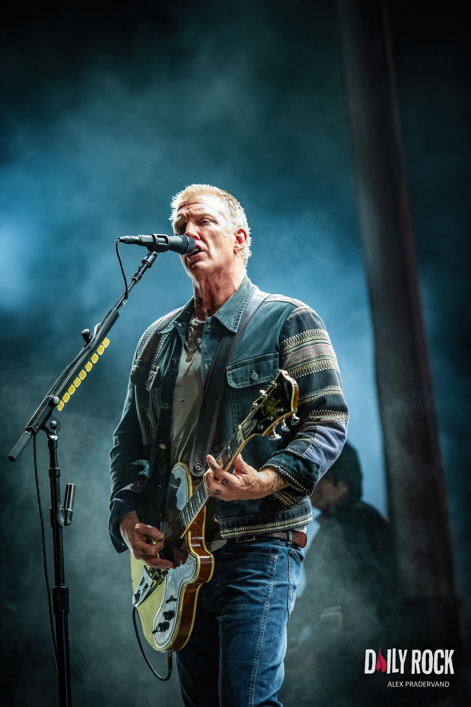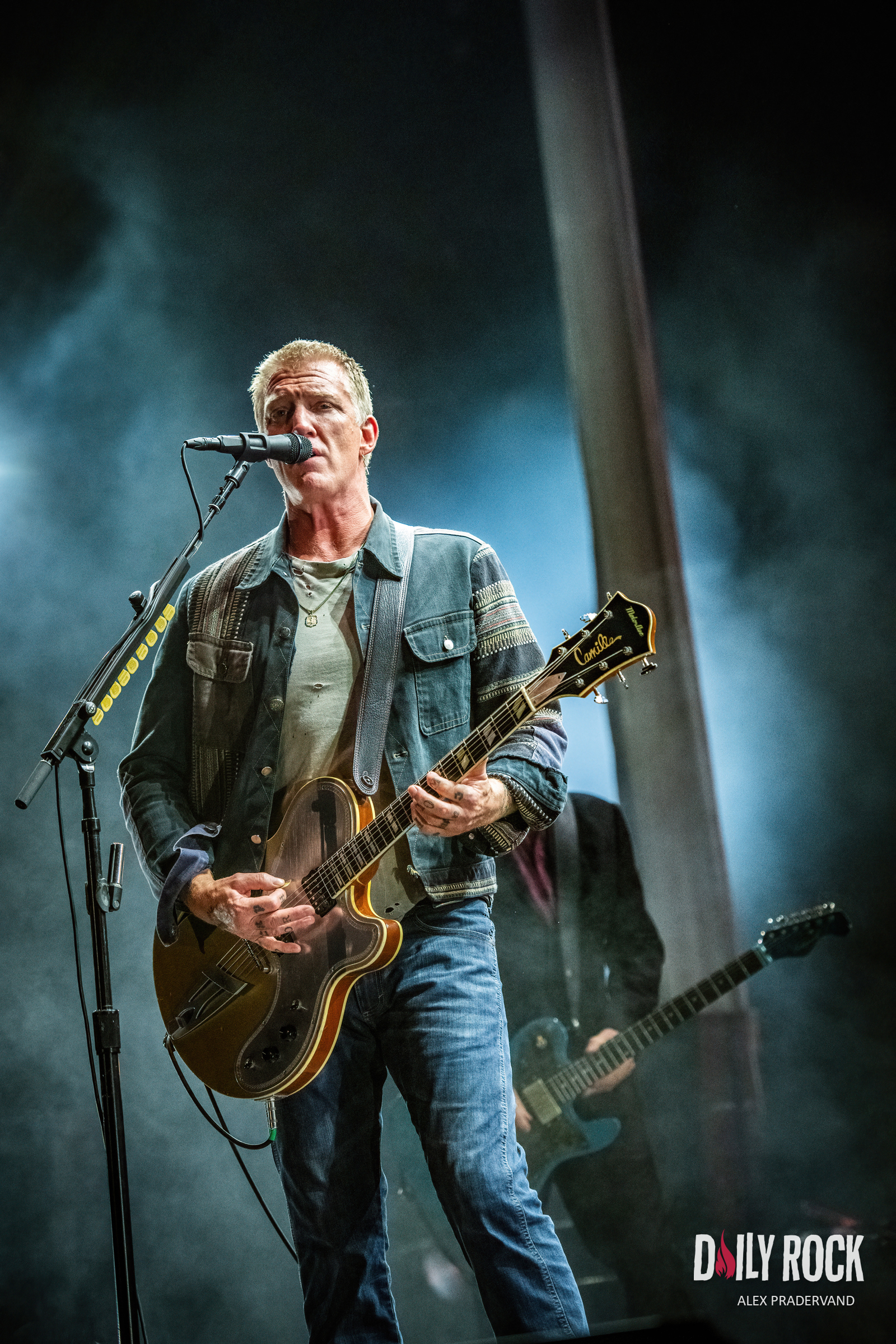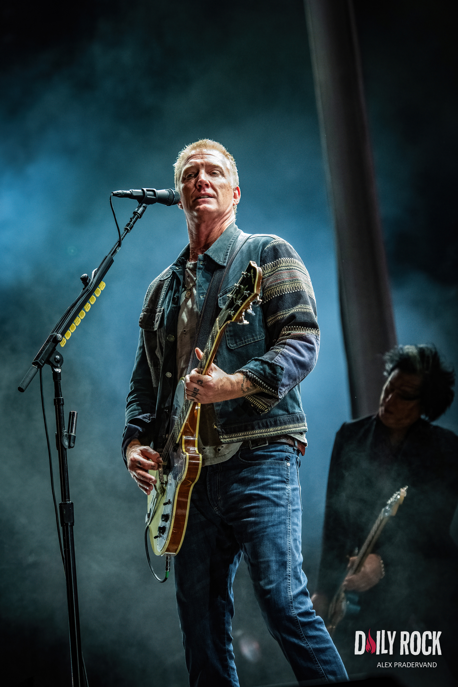 Il n’en reste plus qu’un pour clôturer cette soirée, place au groupe Queens Of The Stone Age sur la Grande Scène. Je ne pensais pas que je verrai un jour Josh Homme et ses acolytes jouer dans un festival grand public sur le créneau final de la scène principale. Et bien si, ils sont là pile à l’heure et d’attaque. Cela dit, au final, quoi de plus normal que de convier les folles de l’âge de pierre à un festival qui se nomme Paléo ?? En position resserée sur le centre la scène, les QOTSA démarrent avec un de leurs titres les plus connus, ‘No One Knows’, histoire de convaincre les curieux de rester pour le reste du concert. Cela marche plutôt bien comme technique car dans l’ensemble le public, plus que mouillé, demeure sur place pour le concert des QOTSA. Les moins convaincus sont rentrés discrètement mettre leurs habits à sécher après avoir drifté dans le parking gorgé d’eau, sans attendre la fin du show, nous laissant entre nous à déguster ce monument du rock.