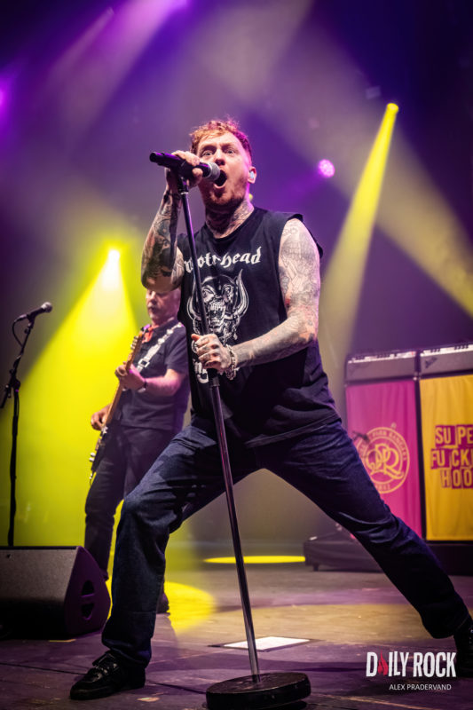 Les Sex Pistols? Oui, enfin sans Johnny Rotten (trop faché avec ses comparses) et sans Sid Vicious (trop mort). Mais avec un Franck Carter que l’on ne présente plus et qui a tout du chanteur idéal pour redynamiser ce groupe culte. Je les ai vus au Greenfield Festival un mois plus tôt et je savais donc à quoi m’attendre cette fois. Certes, ce ne sont pas les Pistols cuvée 77, mais là faut se faire une raison, ce groupe n’existe plus depuis longtemps, hormis une tentative de réssurection en 96. ‘Nevermind The Bollocks’ est un album culte qui regorge de pétites et c’est bien entendu ce dont il est question ce soir, comme l’annonce le NMTB affiché sur la batterie de Paul Cook. Tout y passe, ‘Pretty Vacant’, ‘God Save The Queen’, ‘Bodies’, etc. jusqu’à un ‘Anarchy In the UK’ majestueux.