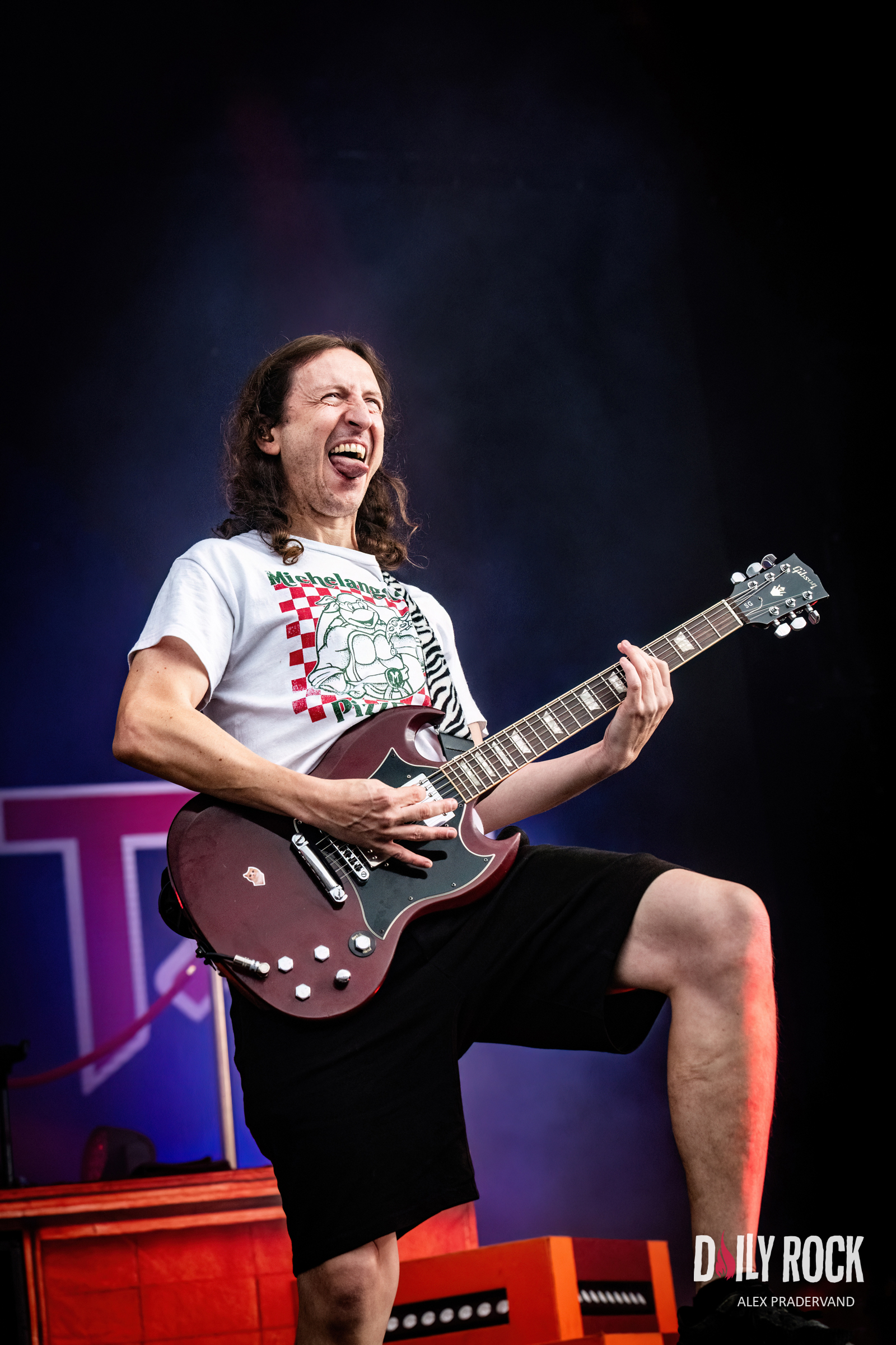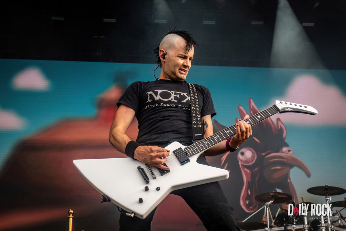 Autre groupe français à l’affiche ce soir, sur la Grande Scène cette fois, Ultra Vomit. Un nom qui doit laisser dubitatif les festivaliers qui ne connaissent pas le joyeux quatuor si branché déconne. Cela commence avec une voix-off qui teste un peu le public et la réaction est immédiate. La foule est amassée devant la Grande Scène et joue le jeu à fond. Impressionant.