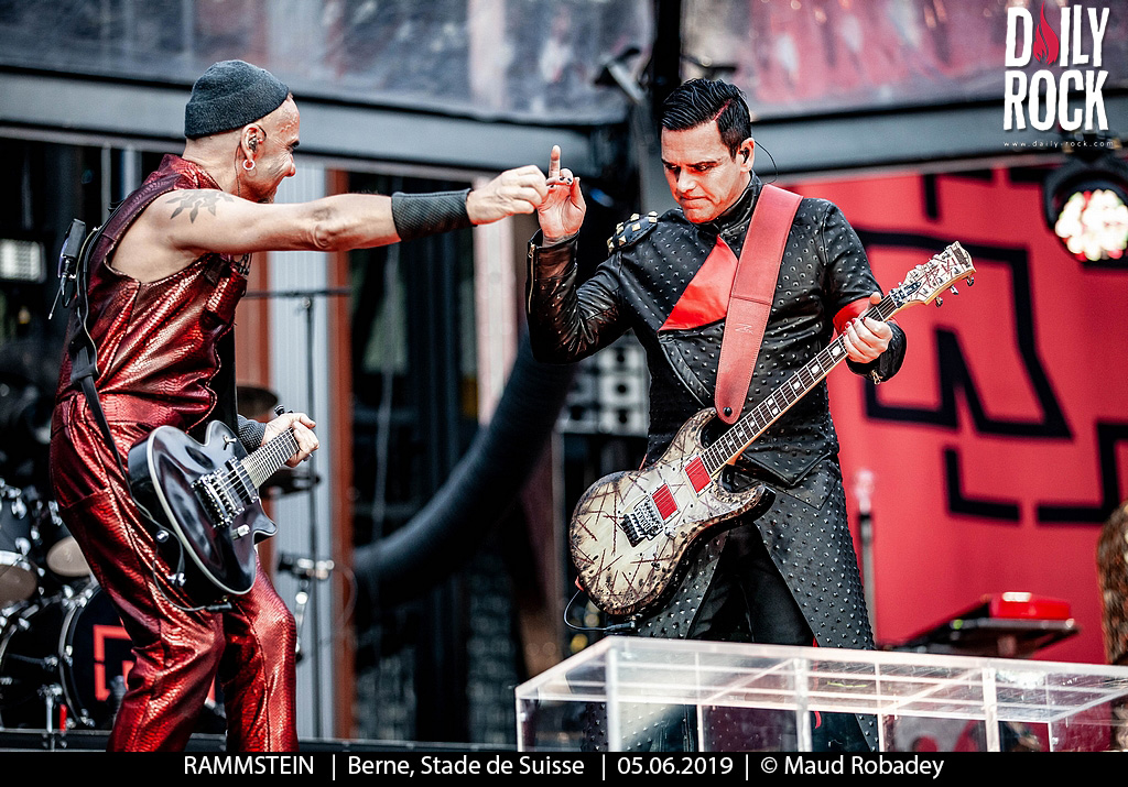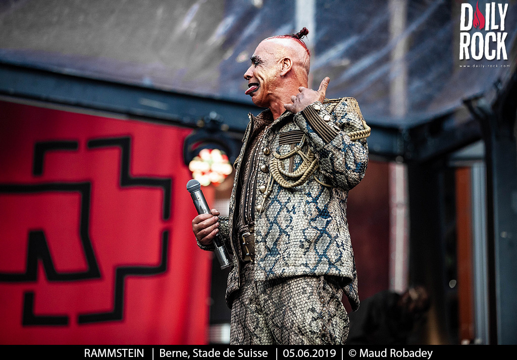 Autour de 43 000 personnes se sont retrouvées amassées autour du Stade de Suisse pour assister à cet événement, après une entrée quelque peu compliquée par le contrôle d’identité pour chaque billet nominatif. Avec quelques minutes de retard, une intro et une explosion : le show commence tout en douceur avec un des titres les plus calmes de leur nouvel album ‘Was ich liebe’. Changement d’ambiance soudain avec ‘Links 2-3-4’, et une animation d’une marche militaire sur l’écran central. Le public n’a pas besoin de motivation supplémentaire pour participer, ce qui est un fait tout de même assez rare en Suisse ; on entend bien que la majorité des gens s’expriment dans leur langue maternelle. Une bonne alternance est faite entre les anciens et nouveaux titres, ne relâchant pas la pression. ‘Tattoo’, ‘Sehnsucht’, l’excellent ‘Zeig dich’ : Rammstein les enchaînent sans pause, profitant de chaque minute pour nous en mettre plein les yeux. On notera ‘Mein Herz Brennt’ où on a droit à la représentation directe du titre sur scène.