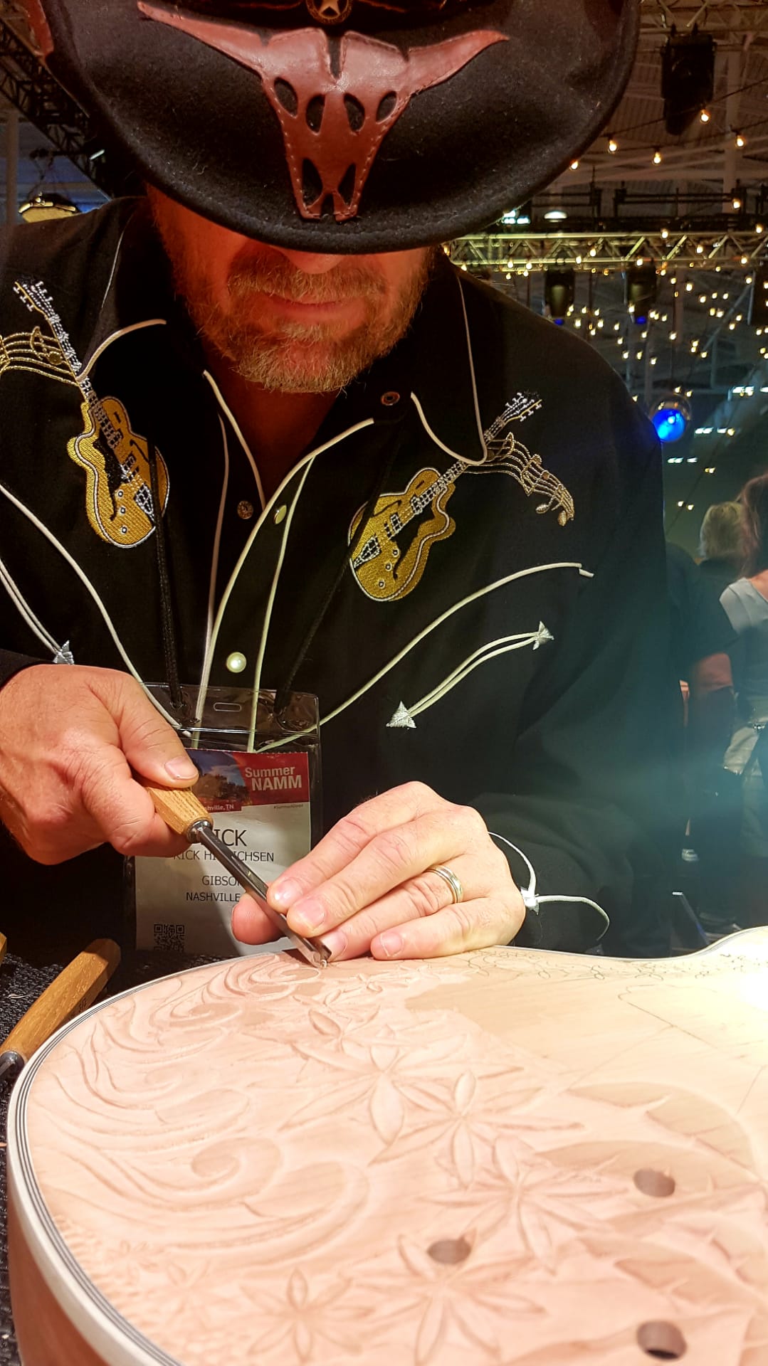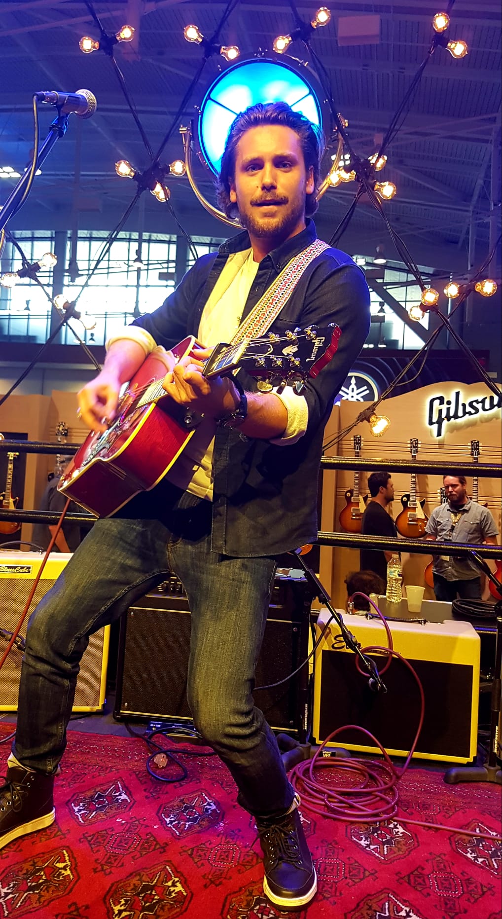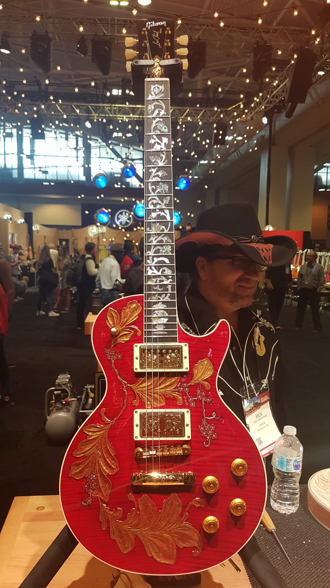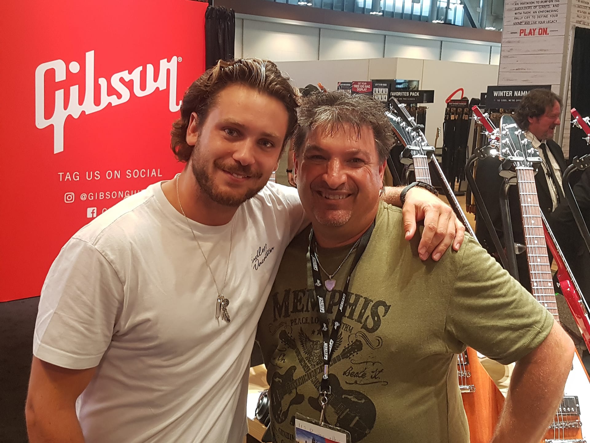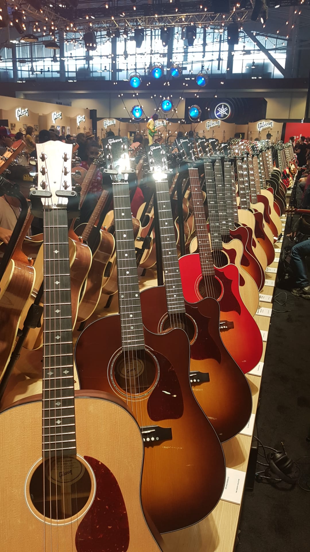 J’entre dans une immense halle et le stand Gibson me saute aux yeux …. Ils jouent à la maison et cela se voit : grande scène, des workshops avec les artisans de Gibson qui expliquent et montrent leur travail, passionnant et impressionnant. Des centaines de Gibson exposées, plus belles les unes que les autres, et la nouveauté du jour, THE Les Paul Standard Anniversary, qui fête les soixante ans de Les Paul, splendide ! Sur leur scène défilent les guitaristes et l’ambiance est sympa et bon enfant. Occupé à contempler les modèles d’exception, la sono crache une voix qui ne m’est pas inconnue, et là, nouvelle surprise, je découvre Bastian Baker qui fait son show sur scène. Nos regards se sont croisés, incrédules, et dans un éclat de rire il annonce au public qu’une connaissance suisse est là aussi …. Applaudissement général et moment improbable. On discute ensemble à la fin de son show et il m’annonce qu’il vient de signer chez Gibson, cool !