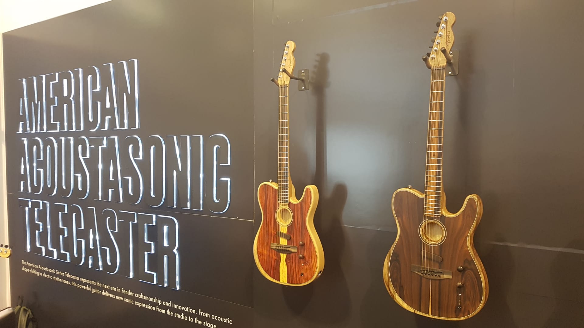 Après ce moment surprenant, je vais voir la concurrence, chez Fender, et je peux enfin essayer leur nouveauté ; l’Acoustasonic Telecaster, guitare hybride qui fait tout, belle découverte, avec une possibilité de jouer une multitude de styles, de sons électriques et acoustiques avec une seule et même guitare.