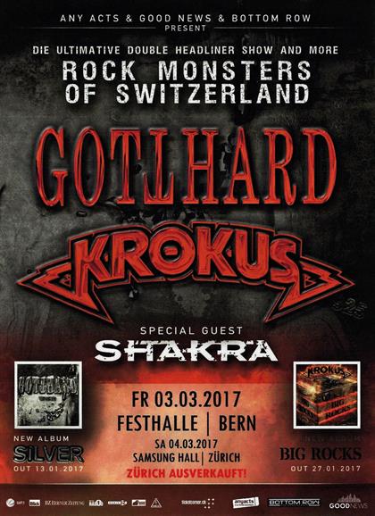 Enfin réunis, ces deux monstres monstrueusement suisses et monstrueusement rock que sont Gotthard et Krokus, portent la parole d’un courant à très haut voltage, nés dans nos vertes contrées et dont la renommée internationale fait encore à ce jour rêver plus d’un apprenti rocker, sans oublier Shakra, qui n’a rien à envier à ses grands frères. Pour la petite histoire, en 2010 Gotthard a bien failli se retirer après le décès inopiné du charismatique et regretté Steeve Lee. En 2011, faisant fi des commentaires perfides, Nic Maeder reprendra le flambeau permettant au groupe de continuer sa route jusqu’en 2017 où un nouvel album, ‘Silver’, a vu le jour, pour la plus grande joie des fans. À environ un album par an depuis 1992, ça en fait de la galette ! Krokus tient lui aussi bien la route et la distance depuis ses débuts en 1975 et après moult changements de line up. Ils ont toujours la pêche et le démontrent avec ‘Big Rocks’ leur tout nouveau bébé. Tout aussi prolifiques que Gotthard, ils ont à leur actif un nombre impressionnant d’albums studio, de live, de tournées de bières et de décibels. Ces deux parcours viendraient gentiment foutre à l’eau cette théorie qui insinuerait que les Helvètes seraient lents…