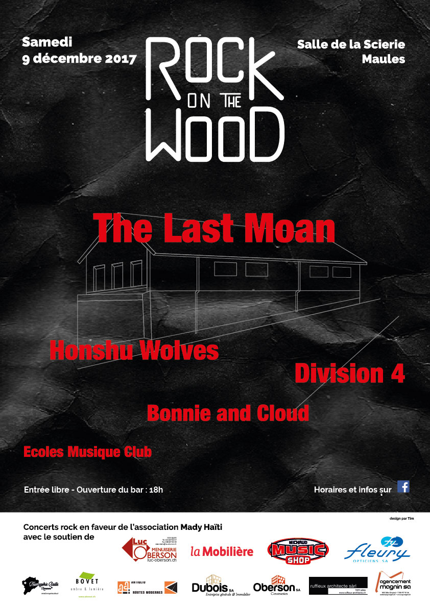 Rock on the Wood c’est une soirée de concerts de soutien pour l’association Mady Haïty, le 9 décembre 2017 à l’ancienne scierie de Sâles, avec The Last Moan (VS), Honshu Wolves (BE), Division 4 (FR), Bonnie and Cloud (FR) et les Écoles Musique Club.