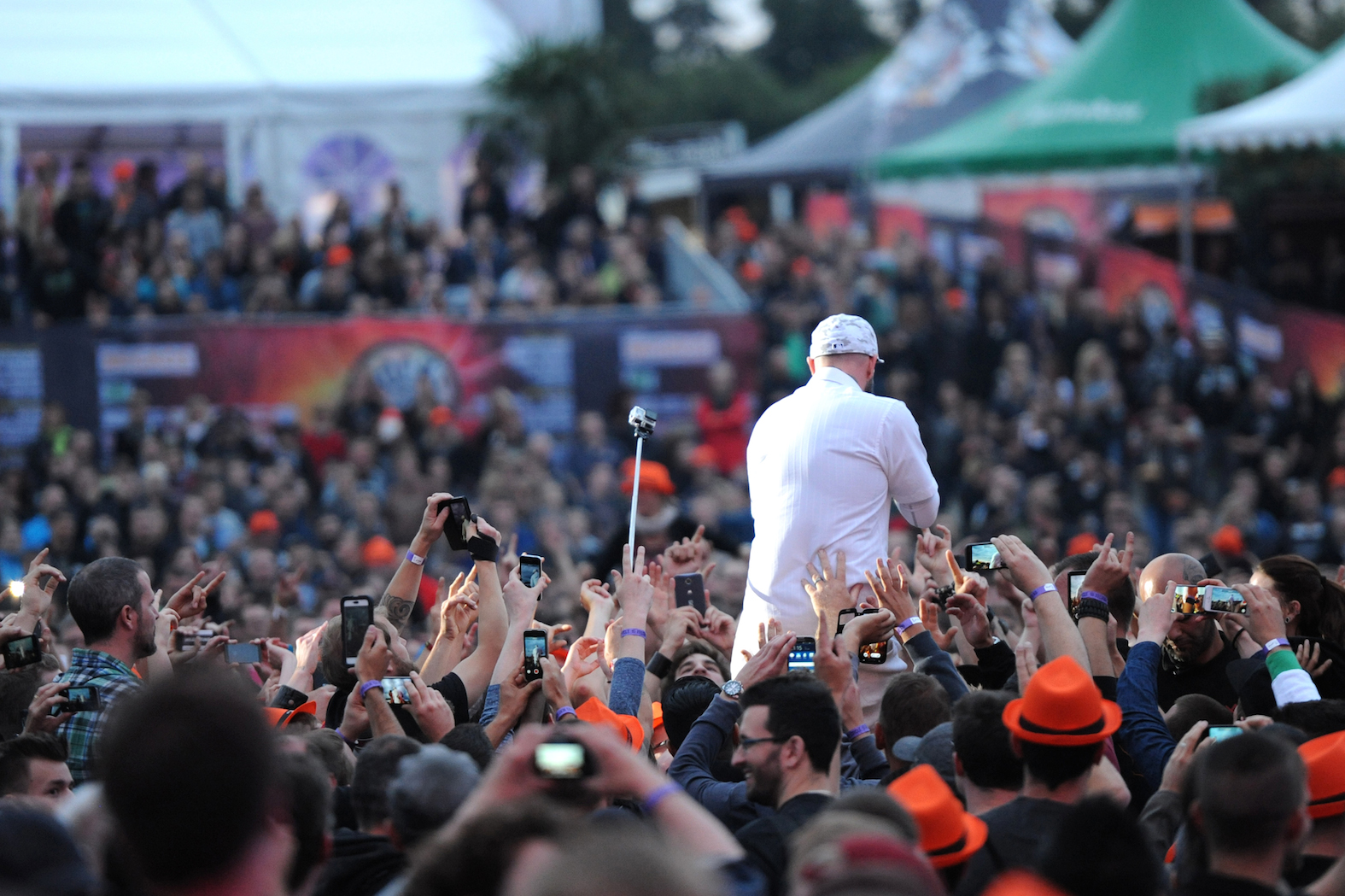 Sur place, heureusement, nous avons droit à une très bonne organisation. Le festival a un concept ‘old-school’ avec une seule scène, chose qui permet les spectateurs de se détendre entre les groupes et pas courir d’une scène à l’autre. Le terrain en pente permet aussi une très bonne visibilité depuis presque partout et le sol en asphalte évite de s’effondrer dans la boue en cas de pluie. Oui, bon, les festivals ne sont pas un truc pour des gamins, mais ceux qui ont été au Sonisphere à Jonswil en 2010 savent aussi apprécier un peut plus de confort… Evitable par contre le Golden Circle payant. Compréhensible dans un gros concert de stade, avec un ou deux groupes, le choix de créer une zone exclusive dans un festival devient vite difficile pour les groupes précédant les headliners, qui devront faire sans l’ambiance caractéristique au premier rang. Après avoir loupé Eluveitie donc, nous sommes prêts à accueillir Papa Roach et leur nu-metal/rap-metal qui fait leur beurre depuis une quinzaine d’années. Le groupe est sans aucun doute bien rodé et le chanteur Jacoby Shaddix est comme une balle en caoutchouc qui saute dans toutes les directions. Ils nous présentent tous leurs morceaux plus connus, de ‘Broken Home’ à ‘Last Resort’, ainsi que quelques morceaux issus de le nouvel album ‘F.E.A.R.’, mais malgré que les plus jeunes semblent bien s’amuser, l’atmosphère tarde à monter. Autre registre avec Limp Bizkit, qui grâce aussi à un son énorme, clair et puissant, nous frappe droit dans le visage ! Fred Durst est un frontman charismatique qui entretien le public et descend même dans le pit. Il se déplace même au fond du golden circle pour la joie des fans plus loin de la scène. Derrière Wes Borland nous surprend avec un de ses déguisements bizarres et le son de guitare le plus ‘fat’ du festival. Les cinq ricains nous présentent un show précis et truffés de hits: ‘Rollin’, ‘Nookie’, ‘My Way’ ou ‘Break Stuff’ ont la capacité de bien réveiller et faire sauter le public. Le groupe s’amuse sur scène et nous propose aussi un medley de reprises avec ‘Creeping Death’ et ‘Smells Like Teen Spirit’, une reprise de ‘Killing in the name’ et leure célèbre reprise de ‘Faith’ de George Michael. Oh well, peut-être une reprise de moins et jouer un morceau original en plus ? Mais bon, personne ne semble se plaindre et terminent un très bon concert avec ‘Take a look around’.