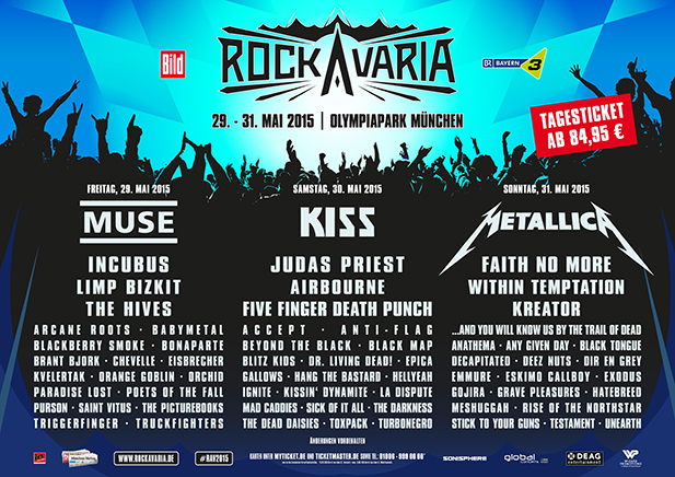 Comme pour d’autres festivals plus établis, il s’agit d’une vraie immersion dans la musique avec plus de 60 concerts sur 3 jours, divisé sur 3 scènes, pour un programme de grande qualité. Il n’y a que l’embarras du choix, du métal au doom, du nu-metal au sludge, du métal symphonique au punk. Les headliners du Rockavaria seront Metallica (le dimanche), qui comme d’habitude aiment passer leur vacances d’été en Europe et surtout dans des festivals. On peut les critiquer autant qu’on veut, mais ils restent un des raers groupes qui livrent deux heures de grande intensité musicale. Muse sont de retour et vont nous presenter leur tout nouvel album ‘Drones’, en sortie le début de juin. Leur concert du samedi s’annonce déjà une show très énergétique. Que dire de Kiss, une des icônes du rock ? Leur succès semble ne jamais s’arrêter et leur show plein de performances scéniques et feux d’artifices va surement nous amuser pour deux heures sur la scène principale le samedi soir. Les co-headliner du festival ne sont pas en reste, il suffit de nommer Incubus, de retour après une longue pause, Limp Bizkit, les icône du Metal ‘denim&leather’ Judas Priest, Airbourne, Faith no More ou Within Temptation. Et le nombre de groupes pouvant susciter votre intérêt est encore très long. Il n’y aura pas donc de quoi s’ennuyer au parc olympique de Munich.