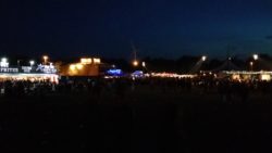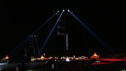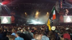 Sous l’ample tente Arena, une foule compacte piétine le sable gris depuis de longues minutes, produisant un son d’océan furieux. « High Energy Concert ! » avertissent comiquement les panneaux lumineux, nous faisant savoir par ailleurs que le mosh ça va, mais le crowd surfing, bonjour les dégâts… Le chapiteau style Knie est décoré au plafond d’oiseaux blancs stylisés, prémices ironiques aux sons guerriers à venir. Derrière la scène, apparaît en noir et blanc une tronche de Christ plutôt mal en point. Dans le public plutôt jeune et rigolard, fort peu de métaleux archétypiques. Ca s’impatiente :« Slayer ! Slayer ! » Résonne alors, mais oui, Thunderstruck d’AC/DC, repris par la foule. Les silhouettes emblématiques d’Araya et King se détachent sur fond rouge. Un Gary Holt à rouflaquettes de Wolverine toxico pose d’emblée l’ambiance avec son ticheurte Kill the Kardashians et sa gratte rendant hommage à son regretté prédécesseur Jeff Hanneman. C’est Repentless, seul vrai bon titre d’un dernier album très dispensable, qui ouvre les réjouissantes hostilités. Puis c’est God Hates Us All qui pulvérise l’assistance, Araya encore plutôt tranquille sur ce titre qui requerrait du poumon plus radical. Un verre d’eau s’envole et atterrit dans les mains de mon voisin interloqué, m’éclaboussant au passage – faites que ce soit vraiment de l’eau, par pitié. Au fil de la prestation carrée et réglée comme un orgue de barbarie, la foule s’agite de plus en plus, les pogos contaminant jusqu’aux derniers rangs. Sur l’écran balayant la foule, un couple adorable, surtout elle avec sa couronne de fleurs décorant sa blondeur platine, s’embrassent hilares sous l’œil de la caméra, entourés de déguisements de pikachus et de fées à baguette et tutu, parfaitement idiots et décontractés. Le set sera des plus classiques, avec peu de titres nouveaux et beaucoup d’incontournables comme War Ensemble, Reign in Blood, Angel of Death, Dead Skin Mask, Mandatory Suicide. Slayer peut rater un album, la machine est trop rôdée pour rater un concert, en voici un énième exemple.