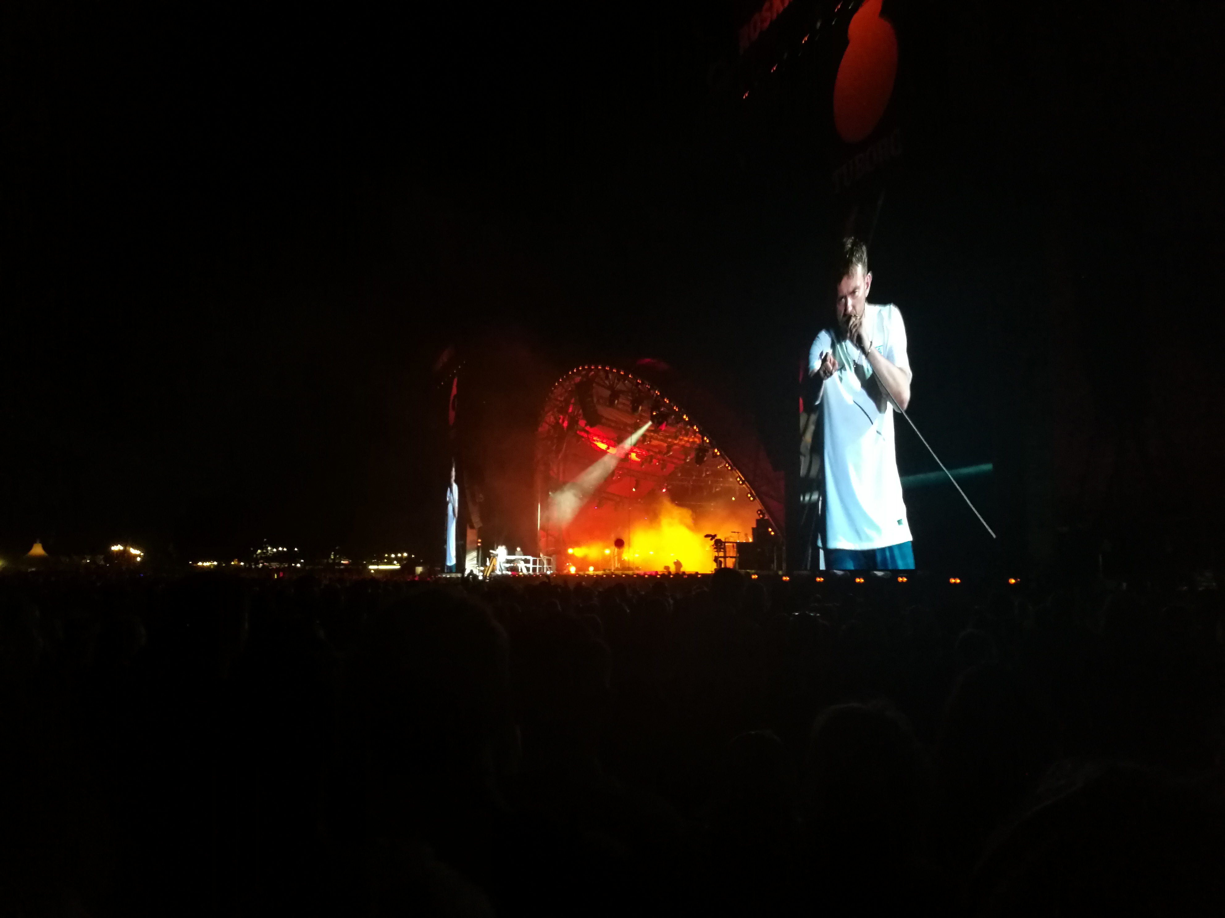 Damon Albarn est un habitué du festival. Parmi ses différents projets, notamment Blur et Gorillaz, c’est aujourd’hui sa huitième prestation sur une scène du Roskilde. L’Anglais est un artiste complet qui ne cesse de développer ses idées. Gorillaz est son terrain de jeu et lui permet de faire ses expériences musicales et visuelles, car le spectacle se regarde autant avec les yeux qu’avec les oreilles. La chorale qui l’accompagne est au top, les musiciens aussi. Damon Albarn est affublé d’un maillot des ‘Three Lions’, suite à la victoire des Anglais à la coupe du monde. Le concert est génial, la qualité du groupe est assez incroyable, ce qui justifie sa présence sur la scène musicale depuis maintenant vingt ans. La setlist est bien garnie et après quelques titres de leur dernier album, ‘Humanz’, viennent les tubes de Gorillaz, comme ‘Feel Good Inc.’, ‘Stylo’, ‘On Melancholy Hill’ et ‘Kids with Guns’. Arrive alors la fin du concert avec le titre ‘Clint Eastwood’, la chanson qui a fait connaitre le groupe au début du XXIème siècle. Et le moins que l’on puisse dire, c’est qu’on s’en souviendra ! En effet, lors du premier couplet, Del the Funky Homosapien, le rappeur accompagnant Damon Albarn sur ce titre, fait une très brève apparition sur scène. Au beau milieu de son texte, pouf ! Plus rien. Del a disparu sans un bruit et le groupe est confus. Après une minute, Damon reprend : ‘Désolé, pour cette coupure, mais on a dû s’arrêter parce que … je ne sais pas.’ Nous apprenons ensuite que Del est tombé de la scène, et doit se rendre à l’hôpital. Heureusement pour lui, tout va bien et il sera bientôt sur pieds. La chute du festival prend donc une drôle de tournure.