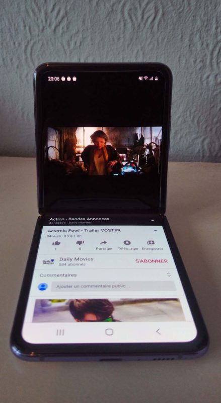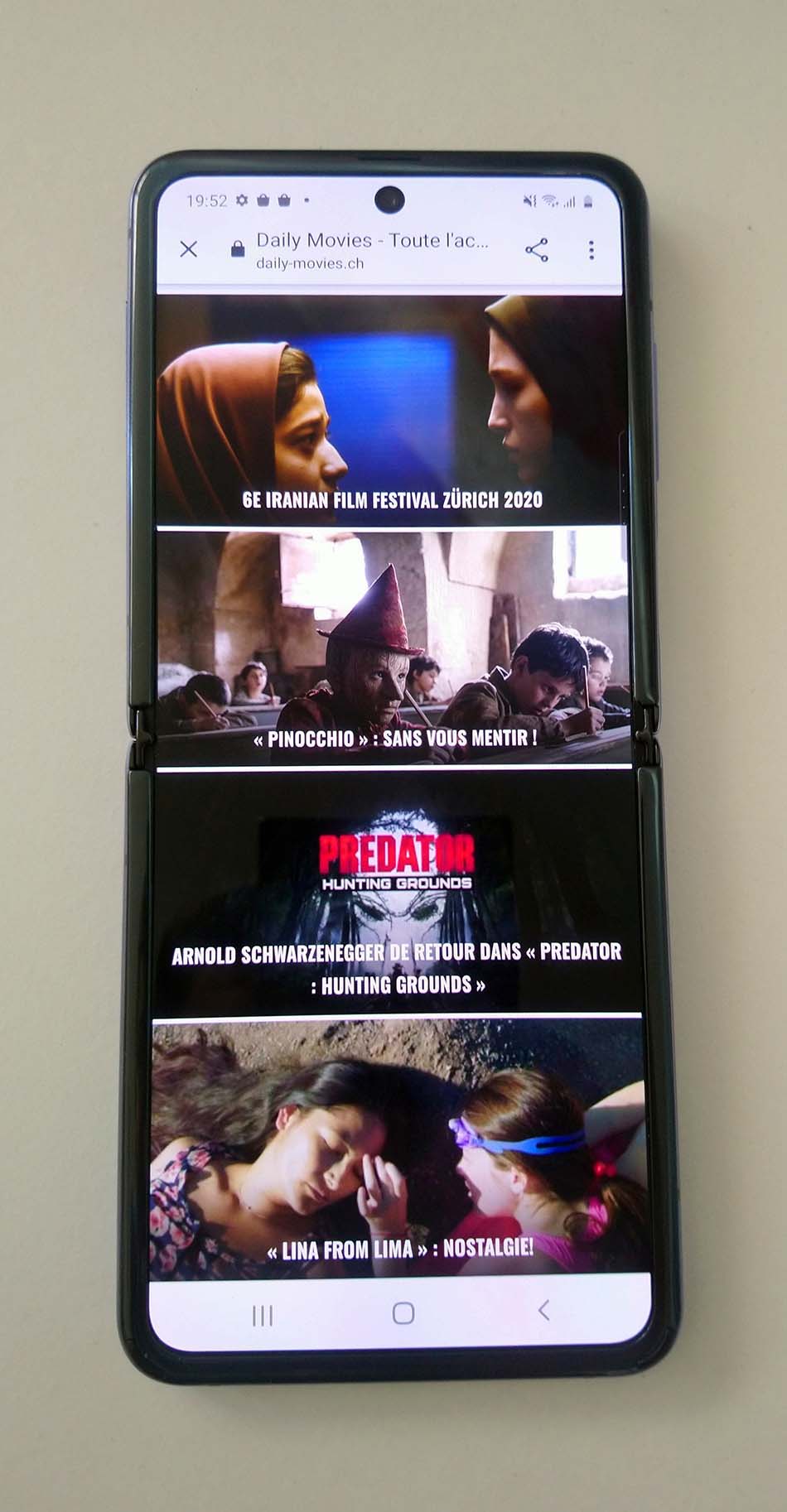 Je pense que tout le monde est d’accord pour dire que Samsung est devenu le maître de l’affichage et le Galaxy Z Flip est la preuve que le fabricant coréen progresse vite sur les écrans pliants. Si l’afficheur du Fold montrait des faiblesses le Flip les a vite fait oublier. Notamment grâce à son Ultra Thin Glass, un verre ultra fin, qui a permis à Samsung d’augmenter la résistance de son écran. Elle n’est pas équivalente à celle des écrans en verre des smartphones traditionnels, mais le progrès est bien réel et il s’annonce bien pour la suite. S’il se montre aussi lumineux que celui du Fold, le taux de réflexions lumineuses est bien plus bas sur le Flip. Cela dit, il reste lisible en plein soleil sans aucun problème. Avec une définition Full HD+ (2 560 x 1 080 pixels), le Galaxy Z Flip jouit d’une résolution satisfaisante (425 ppp). Le ratio de l’écran en 22:9 est un peu déroutant et ne s’adapte pas très bien à certaines applications mais reste un écran de très haute qualité et pratique pour certaines infos.