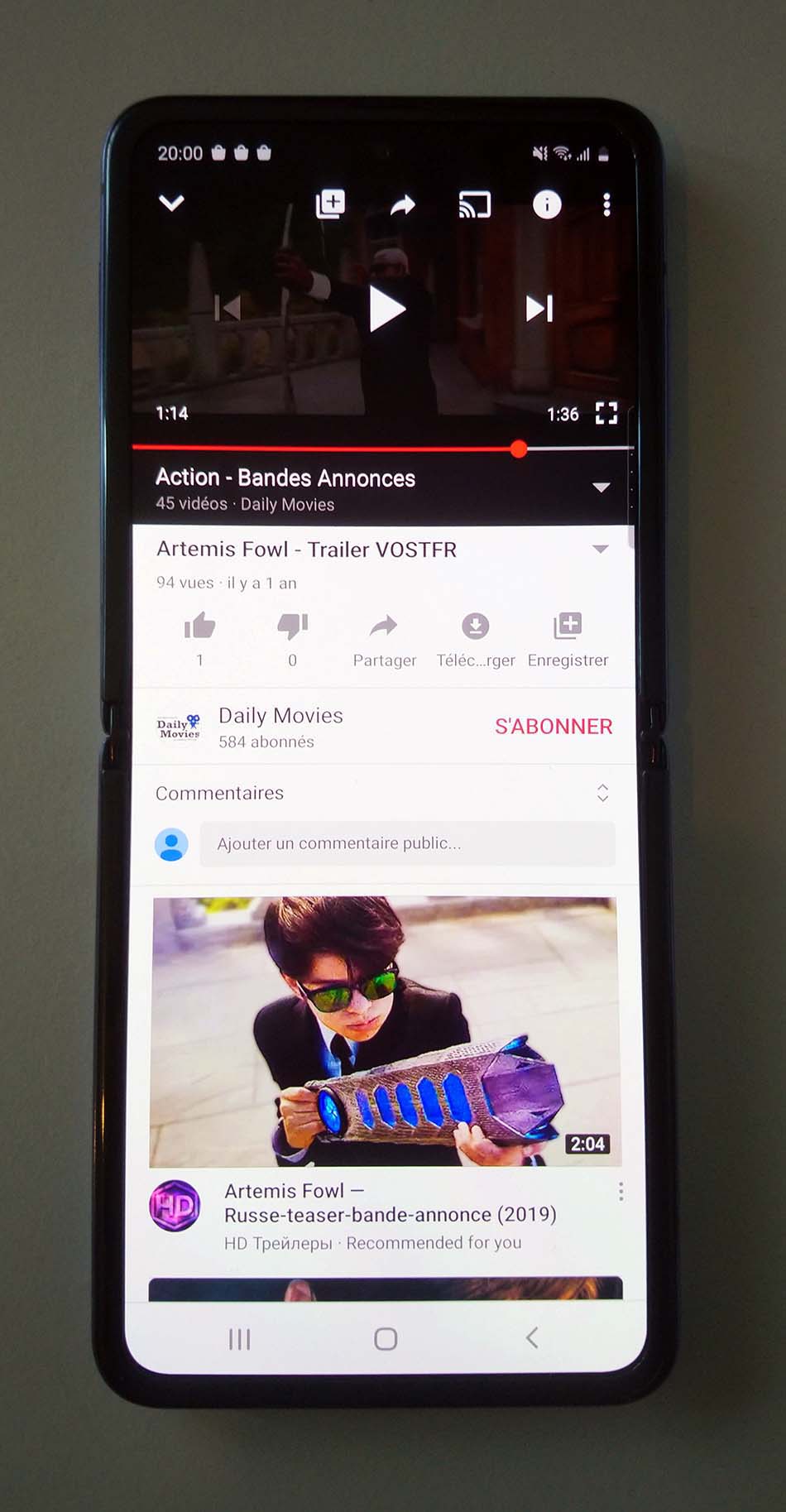 Le Galaxy Z Flip propose un mode de capture nommé « Single Take ». Il permet de capturer une séquence dont sont tirés plusieurs clichés avec des effets différents, des vidéos en accéléré, au ralenti, en boucle, etc. Des séquences basées sur les meilleurs moments détectés par l’IA du Galaxy Z Flip. Les résultats de ce gadget sont intéressants, mais demandent une certaine créativité. Du côté de la vidéo, pas de 8K et on doit se contenter de filmer un UHD à 60 i/s, ce qui est suffisant pour une utilisation classique, et même pour tourner des courts-métrages. Et pour terminer, le capteur frontal et ses 10 mégapixels sont corrects. Les clichés capturés sont assez bons dans l’ensemble, tant que la luminosité est bonne, bien entendu.