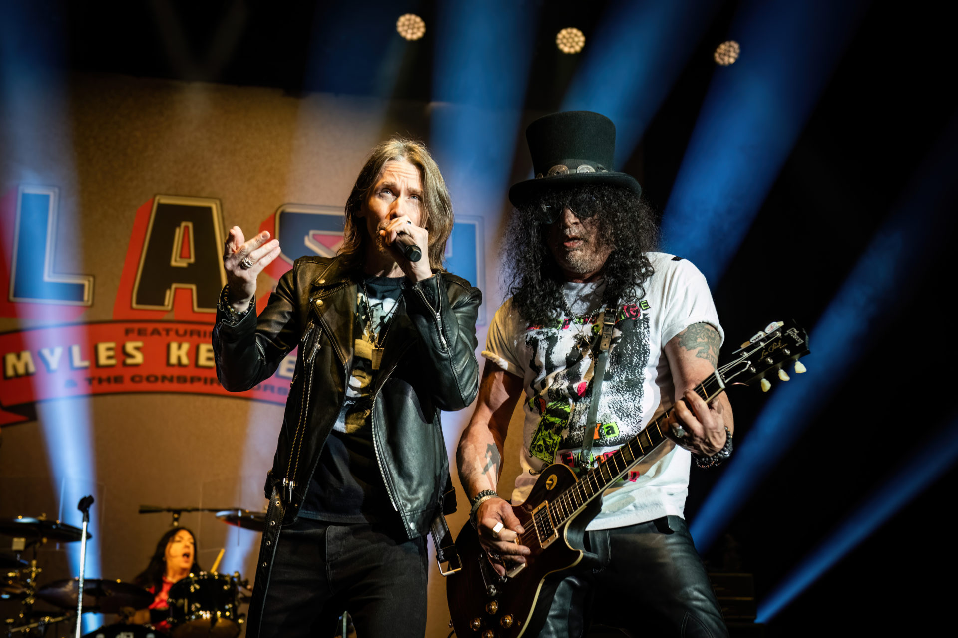 Dans la deuxième partie du concert, une cover de Guns’n’Roses, eh oui, tout le monde l’attendait nous est offerte… mais « Perfect Crime » est un titre moins connu, extrait de « Use Your Illusion I », deux minutes et 30 secondes d’énergie débridée, quasi punk, lors desquelles Todd Kerns prend à nouveau le micro… l’esprit d’Axl des 90’s y est ! On baisse d’un ton, histoire de reprendre nos esprits et notre souffle avec « Starlight », belle ballade où une fois de plus Myles démontre toute sa générosité et l’étendue de son talent derrière le micro. « Wicked Stone », le titre suivant, est l’occasion pour Slash de se déchaîner dans un long solo de virtuose qui titille le public ébahi. Le dernier titre du set sera l’énergique « World on Fire » où Myles lui-même joue de la gratte, l’occasion de présenter également tous les musiciens.