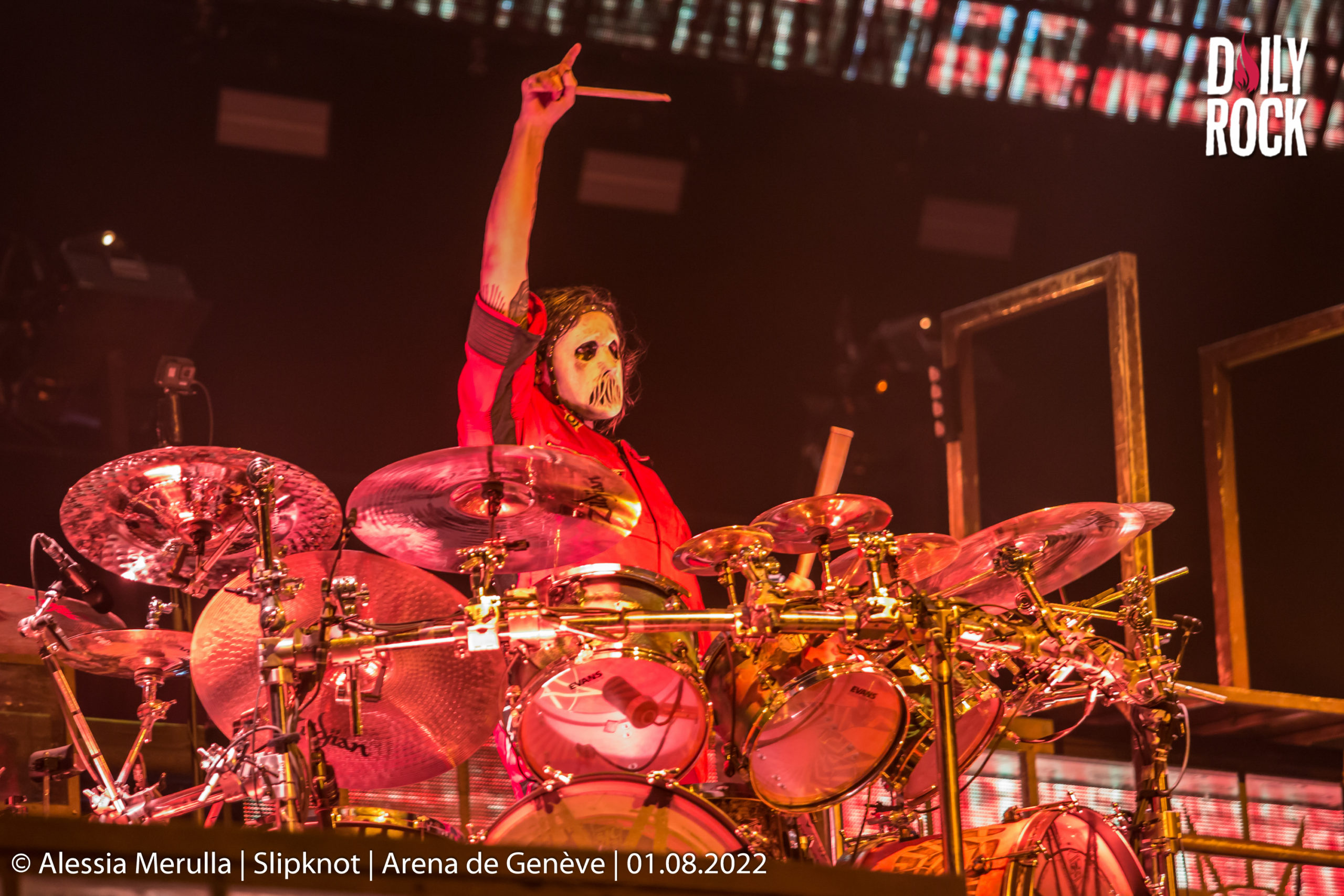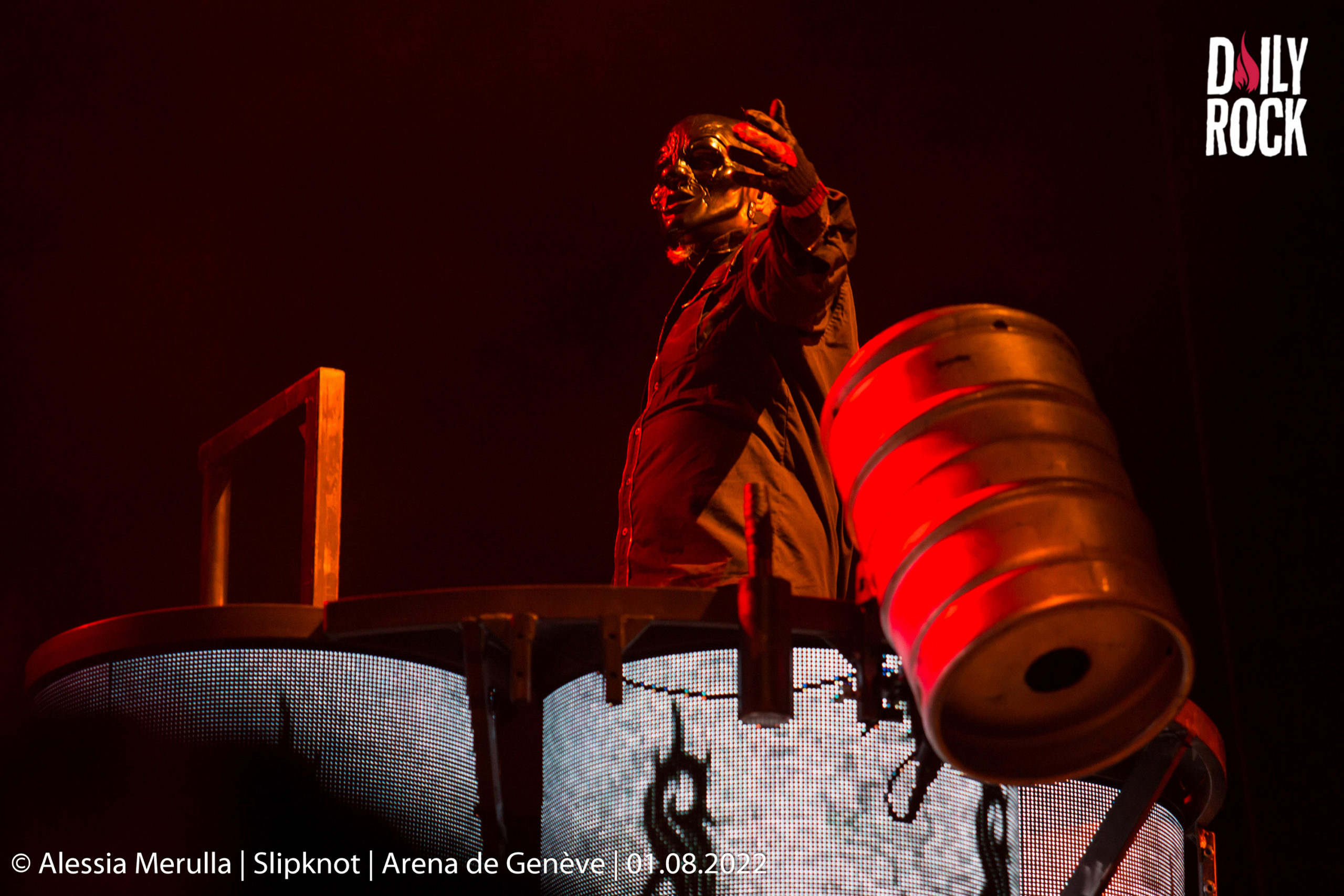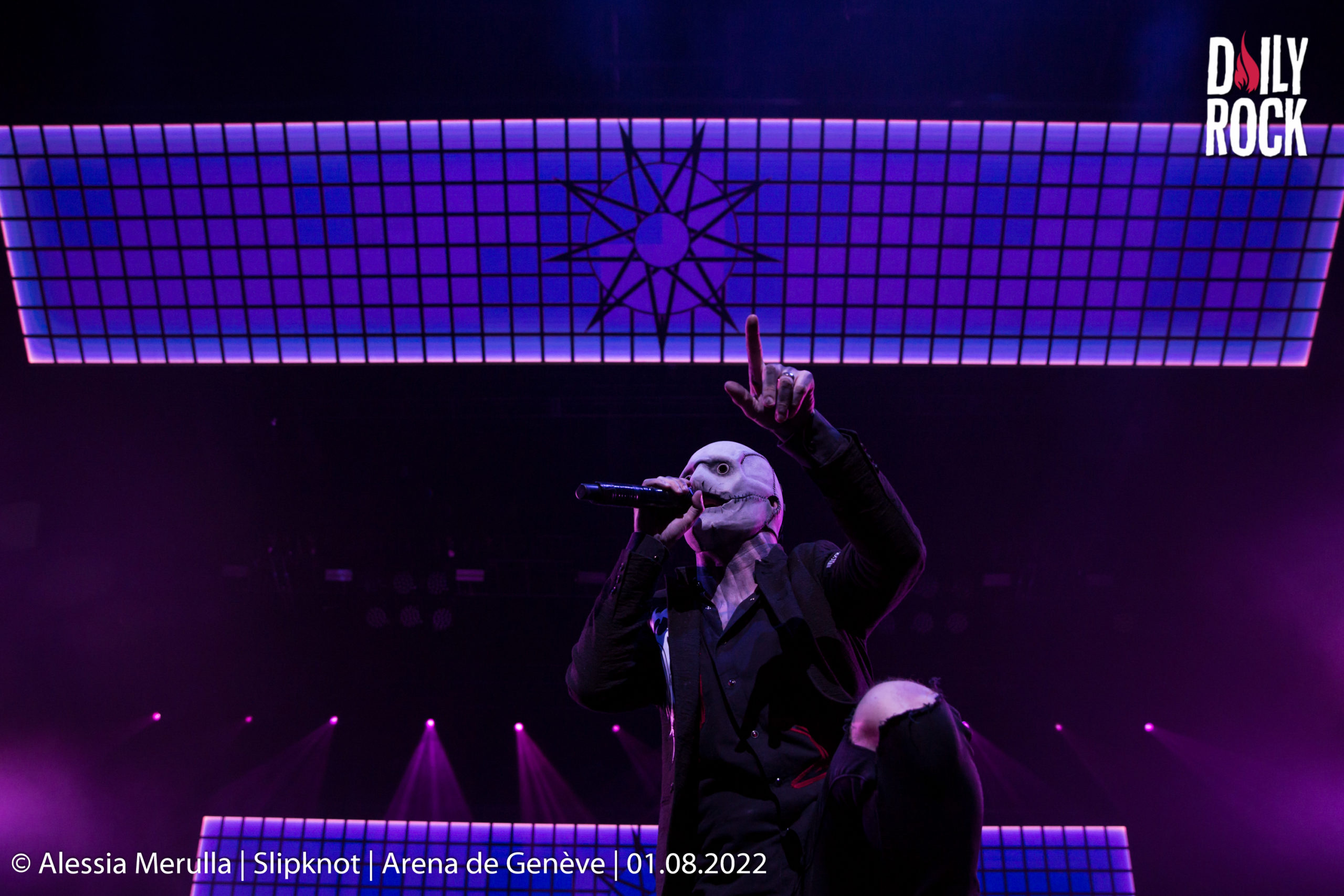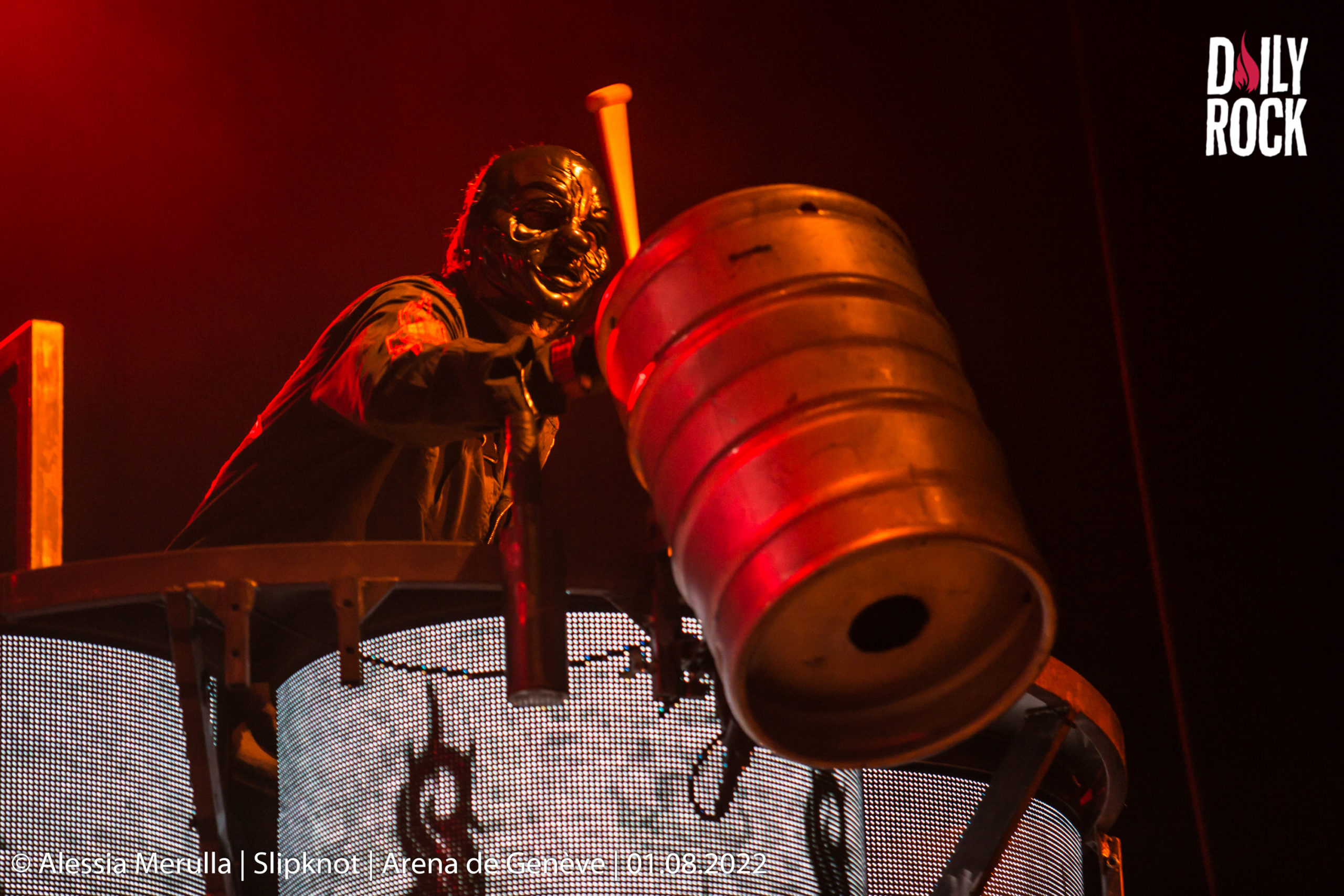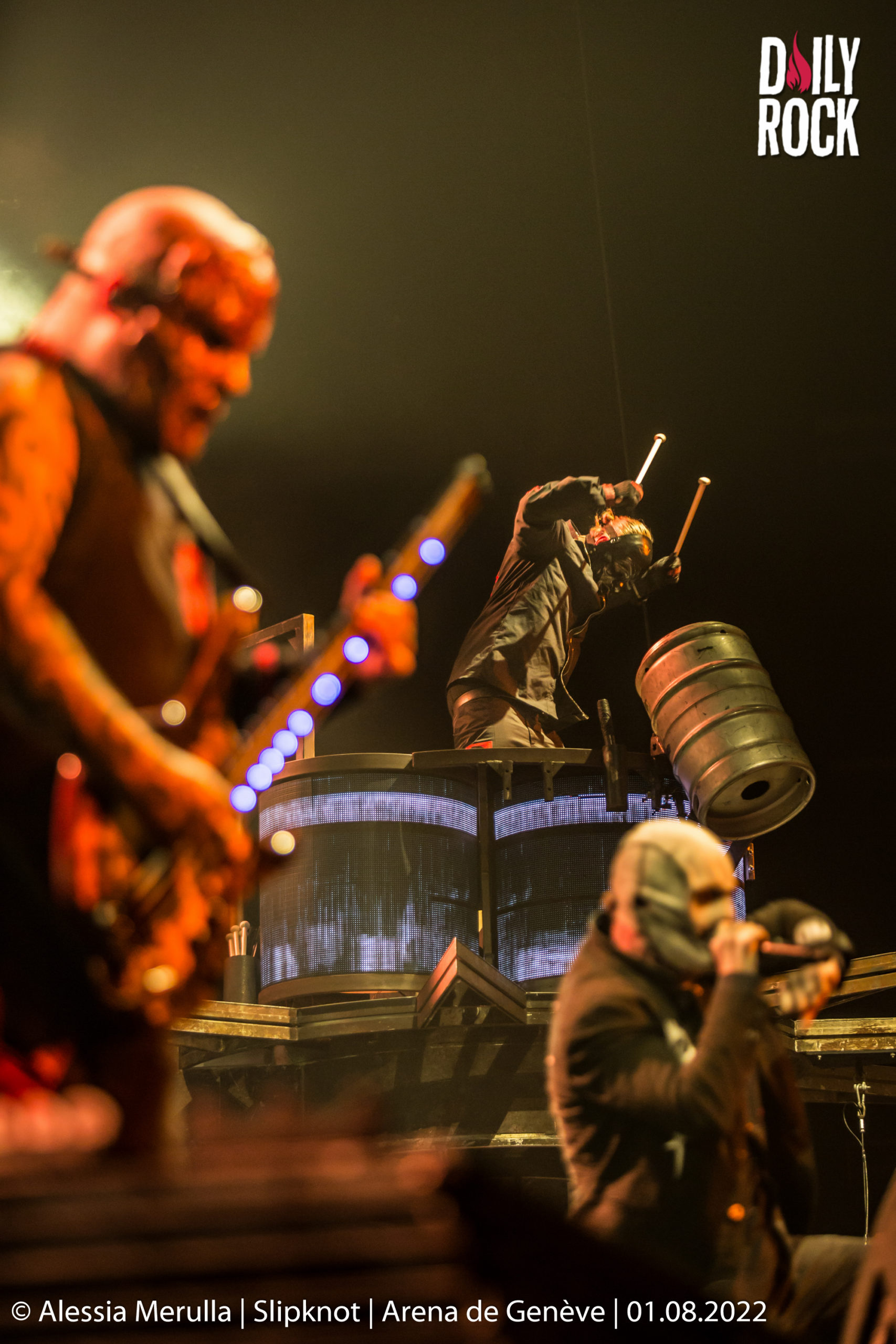 Il y a des groupes qui sont des valeurs sûres. Slipknot en font partie. La configuration de la scène, sans avoir 36’000 décors si ce n’est les imposantes plateformes des percussionnistes, fait son effet. Avec ses différents étages et ses longs écrans eux aussi sur plusieurs niveaux, elle offre une vue esthétique peu importe notre place dans la salle. C’est simplement beau.