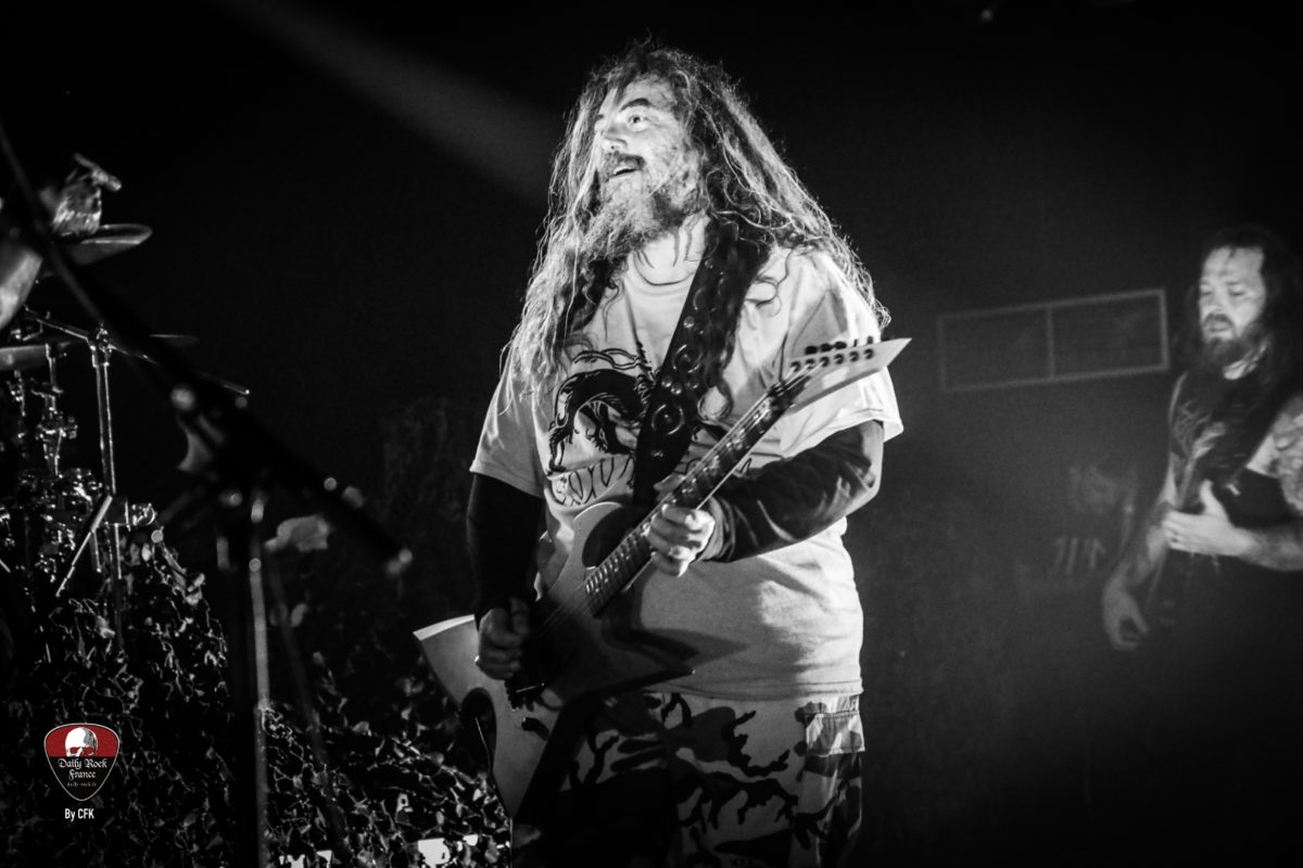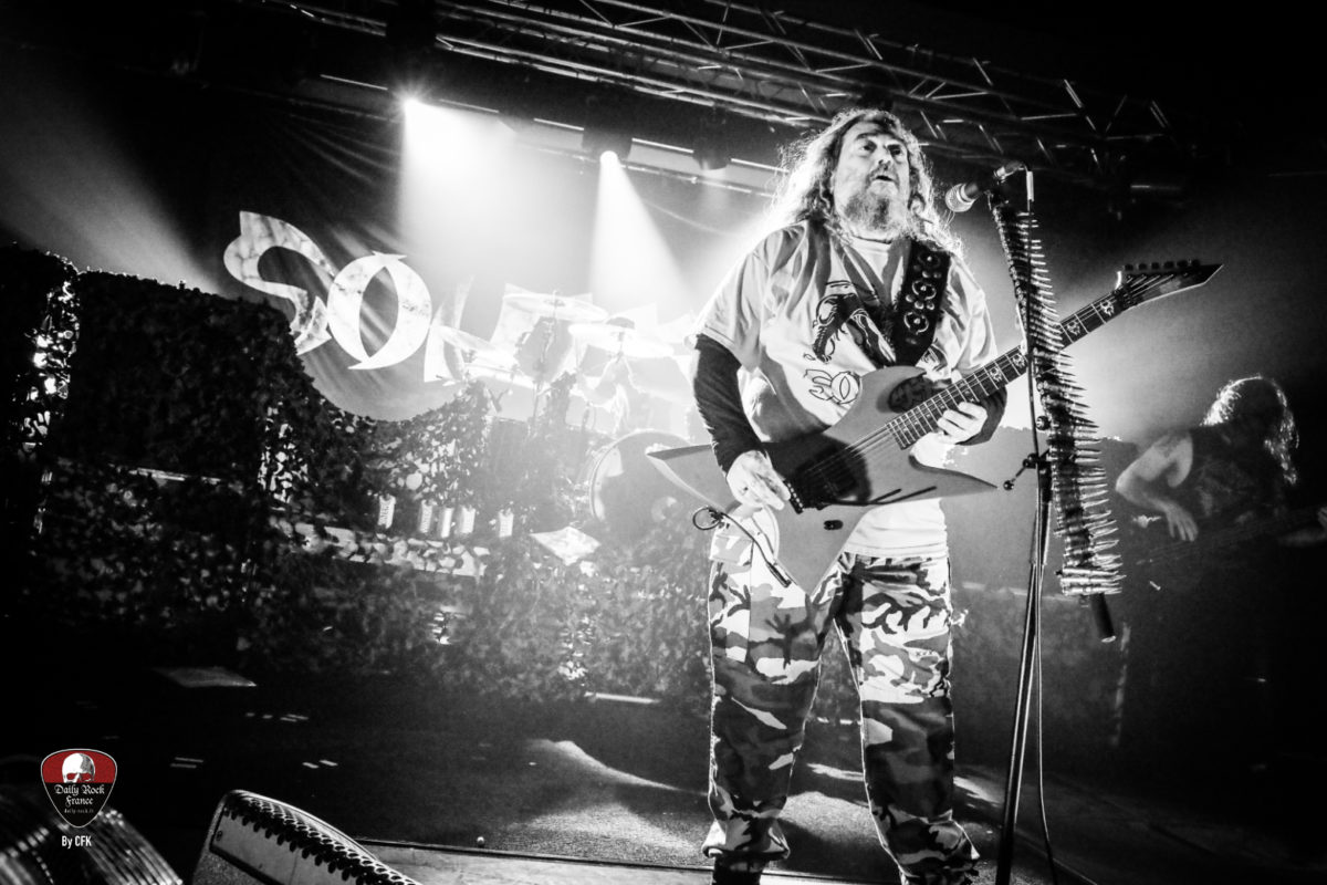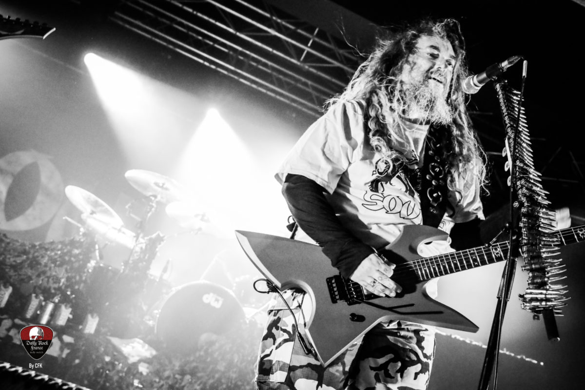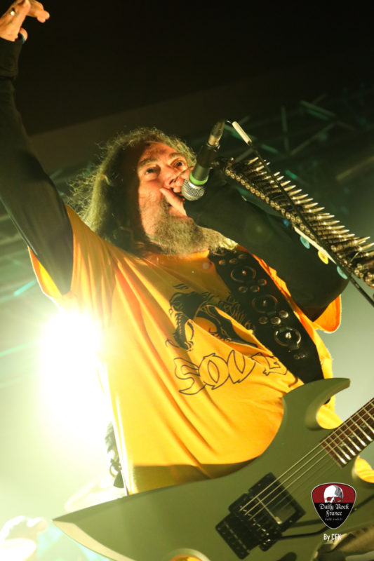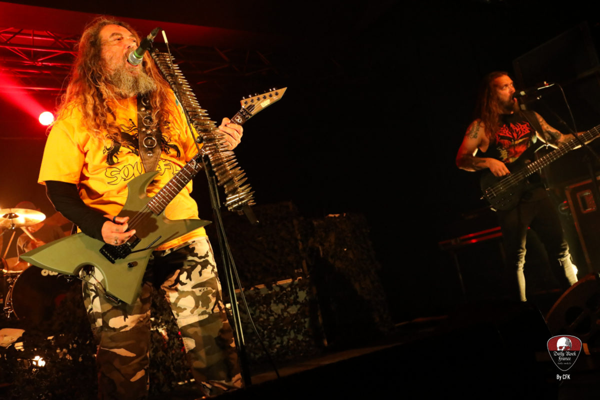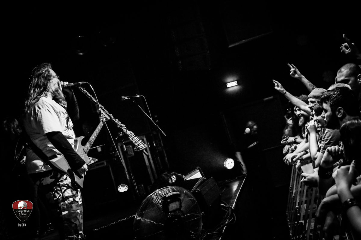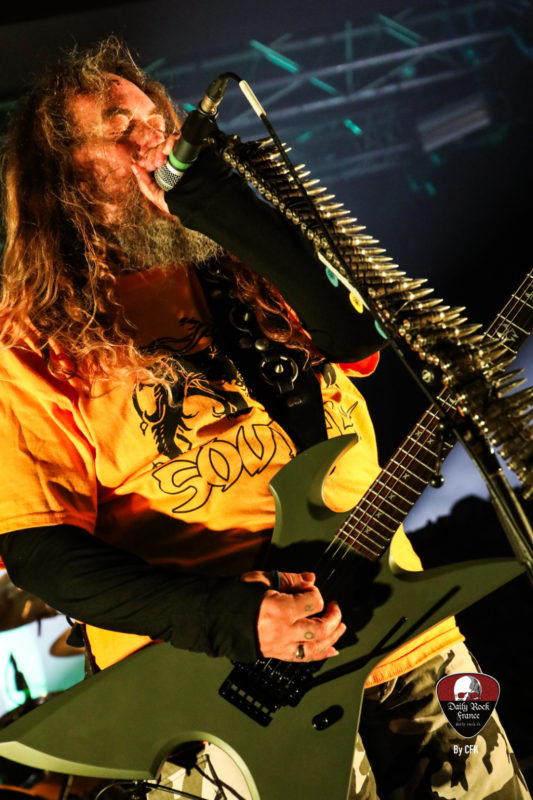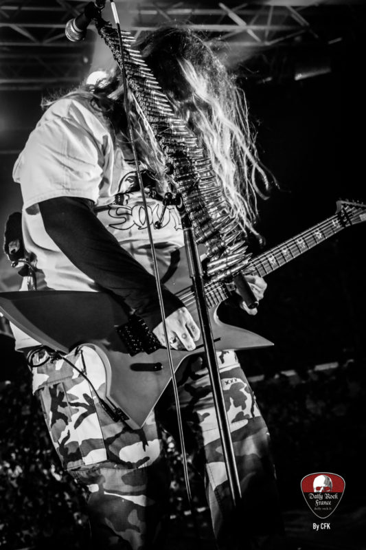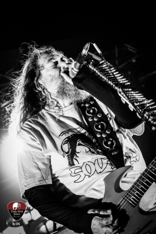 Mais le groupe tant attendu ce soir c’est bel et bien Soulfly. Et dès leur entrée sur scène c’est le feu. La salle qui s’est vidée entre deux sets, et remplie en 2 secondes, dès les premières notes pour acclamer Max Cavalera and co. Et le moins que l’on puisse dire c’est que ça commence fort avec ‘Primitive’ qui met direct le feu à une salle comble. Il ne faudra pas plus de 10min pour que les pogos se forment et que les plus téméraires tentent un slam dans une salle, certes conçue pour les concerts, mais pas pour toute sorte d’ambiance. Quoi qu’il en soit, les spectateurs sont lancés et sont à fond surtout avec un enchainement de morceaux comme ‘No Hope, No Fear’, ‘Downstroy’, ‘Frontlines’, ‘Superstition’, ‘Fire’, ‘Porrada’ et ‘Filth Upon Filth’. Des titres emblématiques de Soulfly qui déboitent en live. Et puis résonnent les notes de ‘Prophecy’ et là, la foule exulte. L’énergie est bel et bien au rendez-vous, et on est même assez impressionné par la fougue de Zion Cavalera, qui tape sur ses fûts comme un malade mais avec une précision et une vitesse impressionnante. Les gênes de la musique et du metal sont indéniablement dans la famille Cavalera. ‘Bleed’, ‘Scouring the Vile’, ‘Wasting Away’ pour faire un tour du côté de Nail Bomb, puis un magistral ‘Refuse/Resist’ de Sepultura, comme un clin d’œil aux groupes actuels ou passés de Max Cavalera. ‘Eye to an Eye’ et ‘Jumpdafuckup’ viendront terminer ce set boosté aux hormones. Pas de temps de répit pendant plus d’une heure et demie, on est presque bluffé par la forme olympique de ces anciens routiers du metal. Max Cavalera a certes un peu moins de coffre, mais honnêtement, cela n’entrave en rien cette prestation énergique, lourde comme on les aime et très efficace.