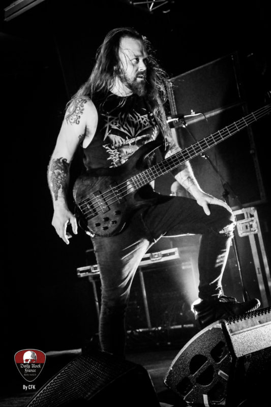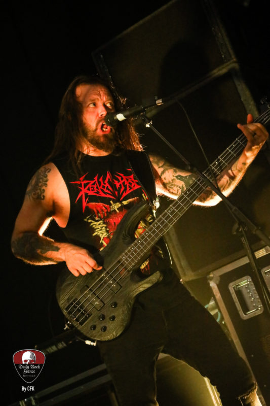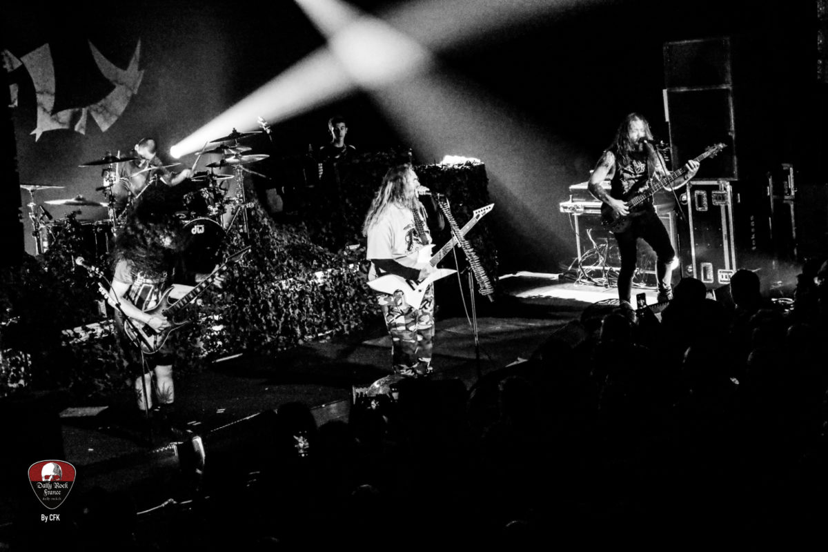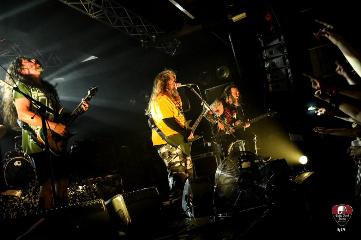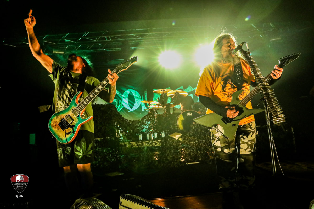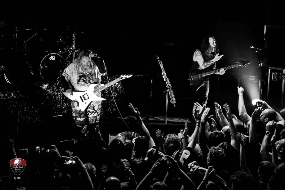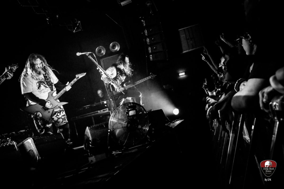 Mais le groupe tant attendu ce soir c’est bel et bien Soulfly. Et dès leur entrée sur scène c’est le feu. La salle qui s’est vidée entre deux sets, et remplie en 2 secondes, dès les premières notes pour acclamer Max Cavalera and co. Et le moins que l’on puisse dire c’est que ça commence fort avec ‘Primitive’ qui met direct le feu à une salle comble. Il ne faudra pas plus de 10min pour que les pogos se forment et que les plus téméraires tentent un slam dans une salle, certes conçue pour les concerts, mais pas pour toute sorte d’ambiance. Quoi qu’il en soit, les spectateurs sont lancés et sont à fond surtout avec un enchainement de morceaux comme ‘No Hope, No Fear’, ‘Downstroy’, ‘Frontlines’, ‘Superstition’, ‘Fire’, ‘Porrada’ et ‘Filth Upon Filth’. Des titres emblématiques de Soulfly qui déboitent en live. Et puis résonnent les notes de ‘Prophecy’ et là, la foule exulte. L’énergie est bel et bien au rendez-vous, et on est même assez impressionné par la fougue de Zion Cavalera, qui tape sur ses fûts comme un malade mais avec une précision et une vitesse impressionnante. Les gênes de la musique et du metal sont indéniablement dans la famille Cavalera. ‘Bleed’, ‘Scouring the Vile’, ‘Wasting Away’ pour faire un tour du côté de Nail Bomb, puis un magistral ‘Refuse/Resist’ de Sepultura, comme un clin d’œil aux groupes actuels ou passés de Max Cavalera. ‘Eye to an Eye’ et ‘Jumpdafuckup’ viendront terminer ce set boosté aux hormones. Pas de temps de répit pendant plus d’une heure et demie, on est presque bluffé par la forme olympique de ces anciens routiers du metal. Max Cavalera a certes un peu moins de coffre, mais honnêtement, cela n’entrave en rien cette prestation énergique, lourde comme on les aime et très efficace.