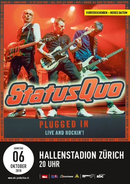 Le concert de Status Quo qui devait avoir lieu le 3 novembre 2018 à la Hallenstadion de Zurich est avancé. Le groupe jouera finalement le samedi 6 octobre 2018, toujours à la Hallenstadion. Les tickets déjà achetés restent valables bien entendu.