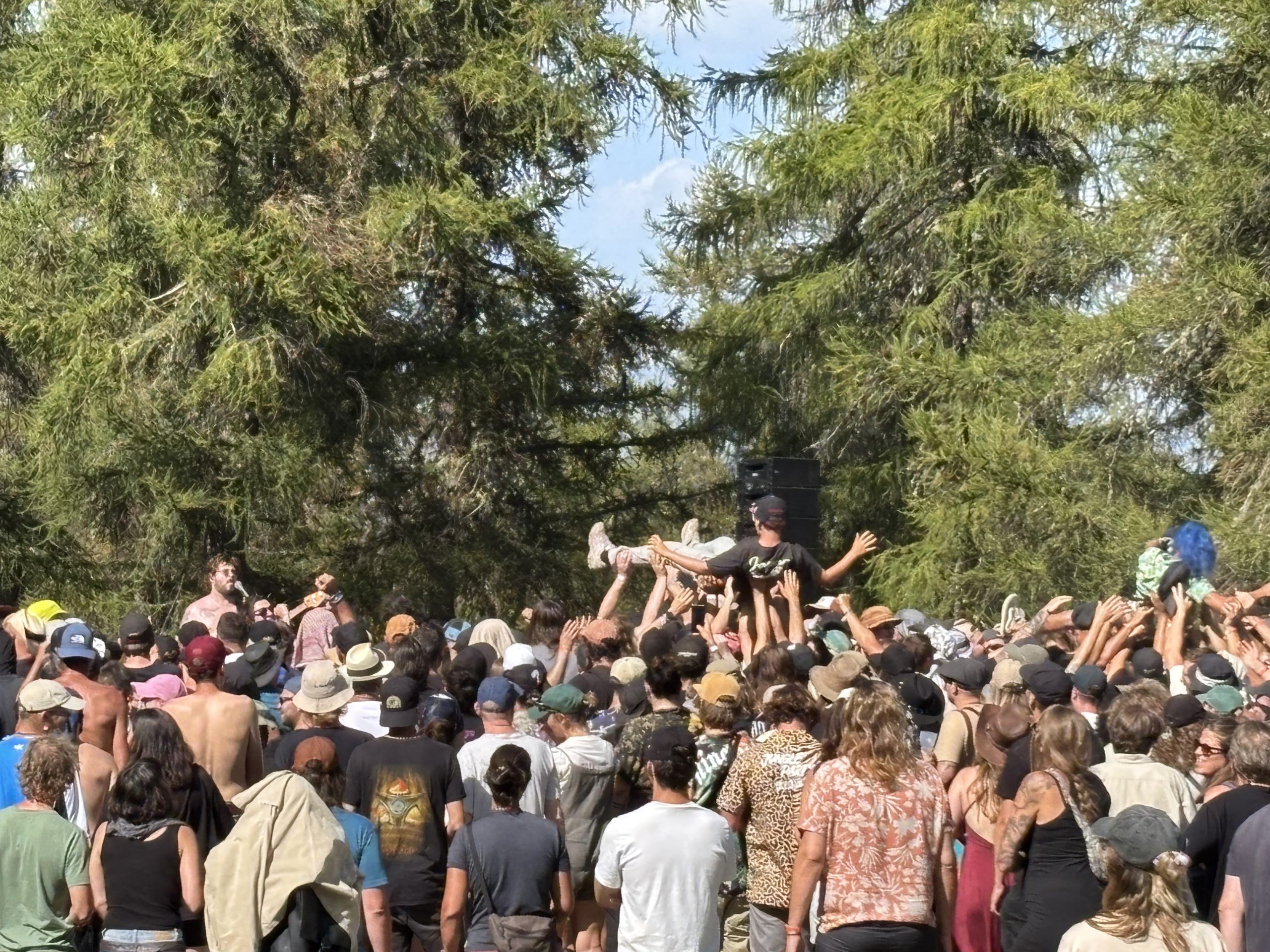 Avant-dernier rendez-vous du festival, la Rocklette du samedi 9 août prenait ses quartiers au Col du Lein à près de 1800 mètres d’altitude. C’est un site privilégié et spectaculaire où les festivaliers aiment à s’allonger sous l’ombre des rois mélèzes centenaires, spécialement en cette journée estivale par excellence où la température flirtait avec les 30 degrés. Décidément, la canicule s’invite même en altitude cette année.