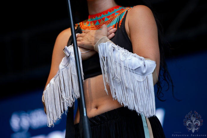 Le parcours commence sur la scène du Jardin, à Trois-Rivières, avec Anyma’Ora. Artiste autochtone québécoise originaire de Wendake, elle est membre de la Nation Wendat. Je la suivais sur Instagram depuis un moment, intrigué par son univers, et j’attendais avec impatience de la découvrir enfin sur scène. C’est accompagné de la pluie que le concert débute, avec la présence de Gabriel Gros-Louis, un danseur traditionnel wendat venu, dit-on, chasser les nuages. La musique d’Anyma’Ora est un savant mélange d’électro-pop et de traditions autochtones, qui enveloppe doucement le public. Chaque morceau semble chargé d’émotion, un peu comme une prière moderne pleine de souvenirs, portée par sa voix douce et lumineuse. Un album est en préparation : ouvrez l’œil, et ne manquez pas son passage près de chez vous.