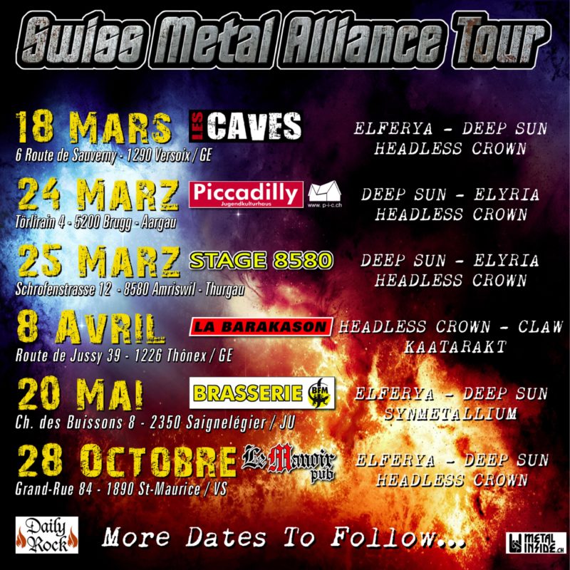 La tournée Swiss Metal Alliance Tour rassemble plusieurs groupe de metal suisses comme Deep Sun (metal symphonique), Elferya (metal symphonique) et Headless Crown (heavy metal). La tournée comporte six dates sur lesquelles se joindront différents groupes comme Kaatarakt (viking metal), Elyria (metal symphonique) et Synmetalium (metal symphonique).