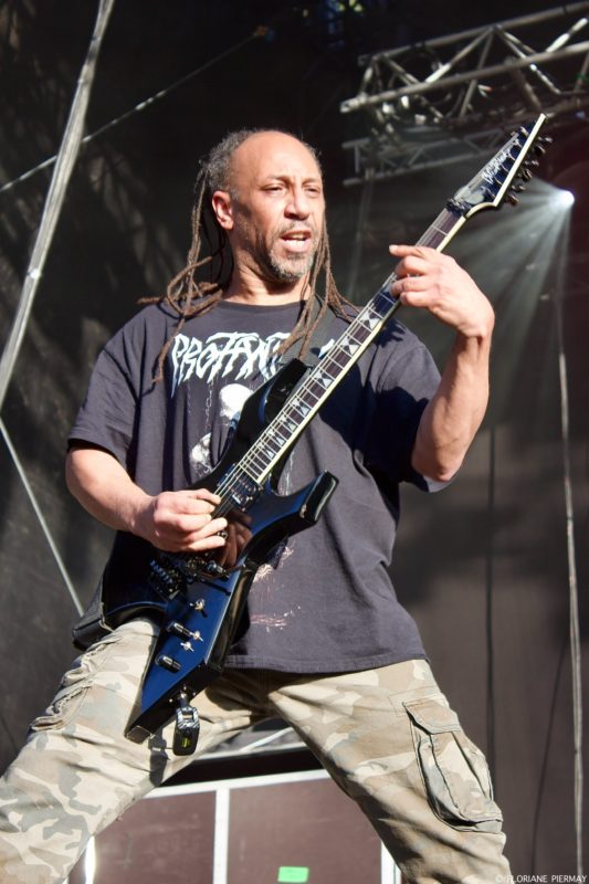 Il est un peu plus de 19h30, et malgré l’heure qui avance, la chaleur reste écrasante. Changement radical d’ambiance avec Suffocation : on monte d’un cran, à la fois dans les décibels et dans les BPM. Les riffs tranchants, presque sanglants, frappent sans relâche et nous arrachent la nuque à force de headbanging. Ricky Myers, nouveau chanteur officiel de la formation américaine depuis 2019, assure un chant sans fausse note. Il bat la mesure avec sa main et ne bronche pas.