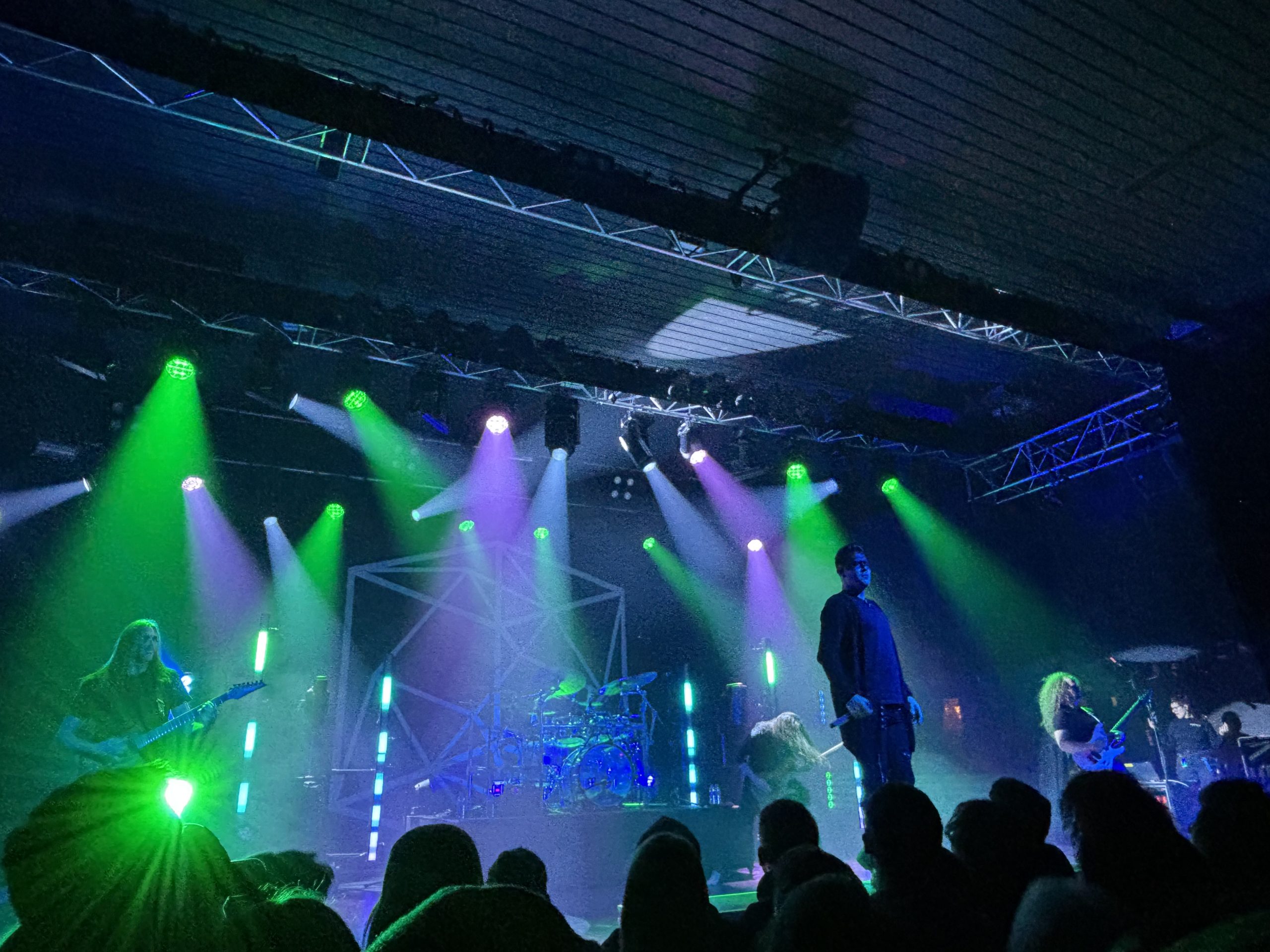Le concert commence avec le puissant ‘Natural Disaster’ dont on adore le final aérien qui emporte tout sur son passage. La scène est magnifique, bien qu’un peu trop dans l’obscurité au début, beaux jeux de projecteurs et LED qui confèrent une ambiance futuriste. On embraie avec ‘Echoes’, pépite qui illustre bien le style musical de TesseracT oscillant entre douceur, rage contenue puis qui éclate comme un poing dans la face. A nouveau, Daniel Tompkins est stratosphérique au chant – quel artiste ! – passant d’un registre à l’autre, occupant bien la scène et venant titiller le public. On a eu les frissons sur ‘Tender’, pépite du dernier album, qui sublime la voix de Daniel. Ambiance et riffs saccadés à la Leprous sur l’intro de ‘King’ qui tabasse et coups de cœur pour l’ambiant ‘The Arrow’, l’entraînant ‘Legion’ avec la voix folle de Daniel, ‘War of Being’ la pièce maîtresse et ‘Juno’ qui finit d’exploser les cervicales du front row.
