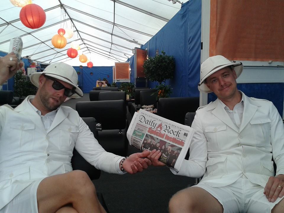À quelques minutes de leur show sur la grande scène du Festi’Neuch, Nicholaus et Chris, respectivement guitariste et batteur du groupe suédois, nous ont accueilli en backstage habillés tous deux d’un accoutrement digne d’un safari…