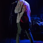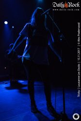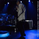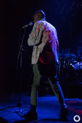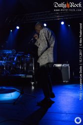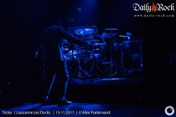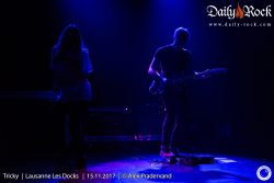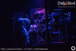 Il faut attendre le morceau suivant pour que Tricky s’avance enfin un peu vers son pied de micro, qu’il passera toute la soirée à maltraiter par jeu. Pour autant, on ne distingue toujours pas grand-chose tellement il fait sombre. Difficile de compter les morceaux et impossible de se baser sur la setlist qui ne sera pas suivie, mais il faut bien attendre trois morceaux avant que la chanteuse ne commence à chanter sur un extrait du nouvel album ‘Armor’. Après, c’est ‘Palestine Girl’ pendant laquelle Tricky disparaît de la scène après avoir poussé une partie de la batterie sur le sol et abandonné ses deux micros entremêlés. Dans le public, on ignore si cela fait partie du spectacle ou s’il y a un problème. Les trois musiciens se regardent un moment et décident de lancer ‘Overcome’ (pourtant prévue dans le rappel normalement) sans lui. Le traitement de ce classique est malheureux. On n’entend que mal la voix et c’est susurré plus que chanté. A oublier. Tricky ne réapparaissant toujours pas, Paul lance les arpèges de ‘Dolls’ (la reprise de ‘Doll Parts’ de Hole) dont l’interprétation vocale n’est pas géniale non plus. Vers la fin du morceau, Tricky réapparaît et chante quelques lignes. La suite du set sera de meilleure facture entre duos calmes et morceaux énergiques tels un chouette ‘Dark Days’, un des meilleurs morceaux d’ ‘Ununiform’.