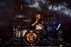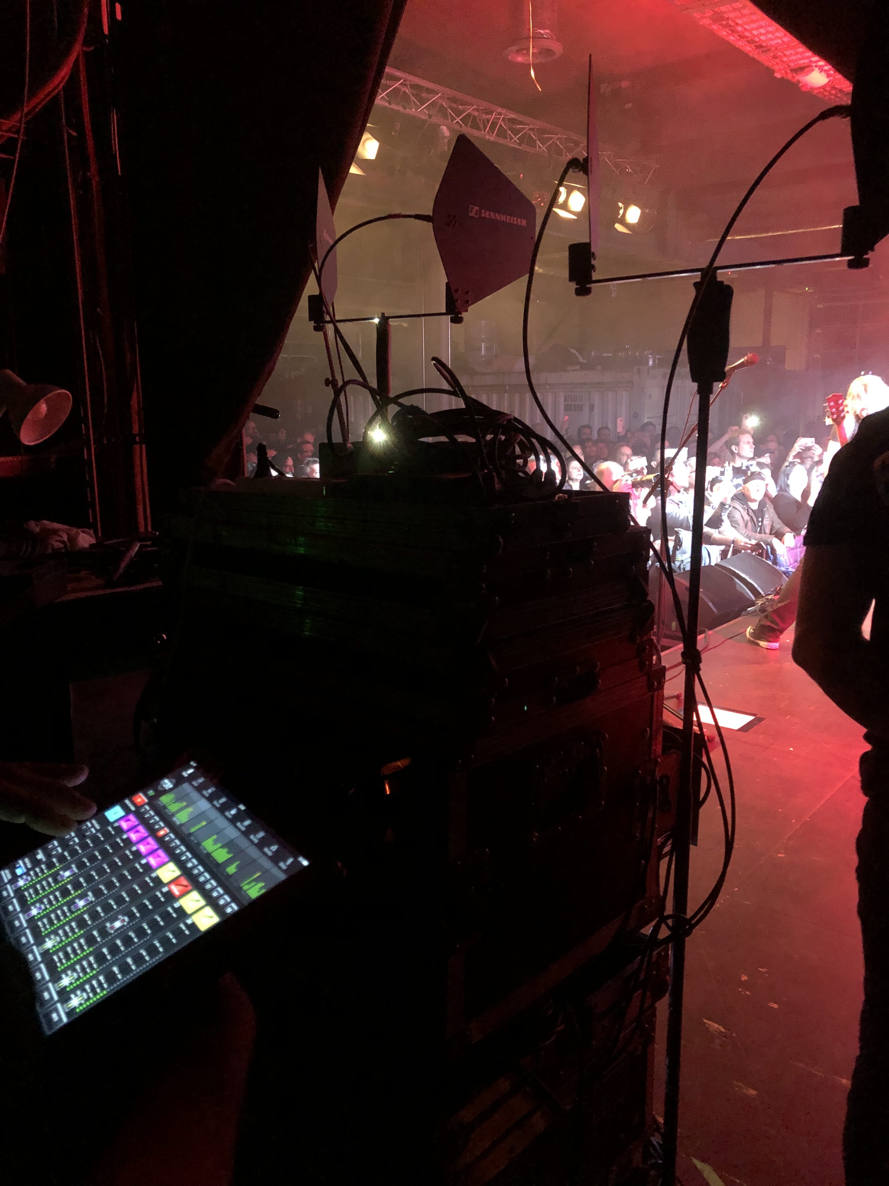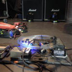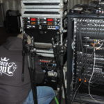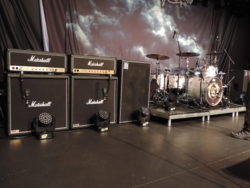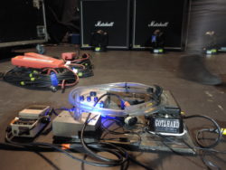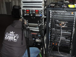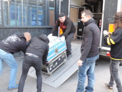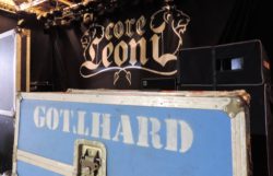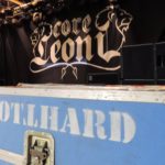 Remis et requinqués, tout le monde s’affaire pour vider la remorque de l’impressionnant matériel et l’amener sur la scène. Un joli mélange de musiciens, organisateurs, bénévoles et sonorisateurs mettent la main à la pâte. Les ‘flight cases’ défilent avec plein d’inscriptions notées dessus : Gotthard, Leo, CoreLeoni. Chaque musicien monte lui-même son matériel pendant que la décoration est suspendue, que les éclairagistes ajustent leurs lumières et que les ingénieurs du son raccordent et branchent les micros sur tous les instruments fraîchement mis en place.Tout ce beau monde a mis beaucoup d’énergie pour rattraper le temps perdu et les premières notes du ‘soundcheck’ claquent vers 17h00.
