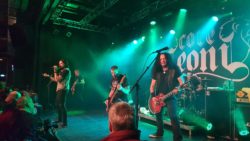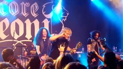 Nous assistons aux concerts de Silver Dust et de Redeem. On en profite aussi pour boire des coups ‘backstage’. Notre employeur n’étant vraiment pas regardant sur la consommation d’alcool pendant le service, on en profite ! Et on ‘tape des théories’ avec la sympathique Aude (la tour manager de Silver Dust), avec le sonorisateur de la salle, avec James Anderson, et nous nous autorisons déjà les premières raclettes avec les membres de Redeem. Mais l’heure tourne et la pression s’accentue. CoreLeoni va monter sur scène…