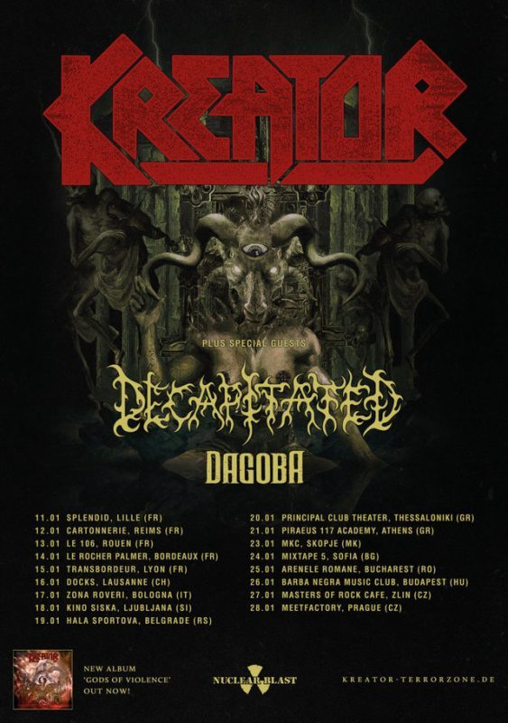 A l’origine le groupe avait annoncé être supporté par ses camarades de label Decapitated mais suite à la récente polémique du groupe c’est Vader qui viendra partager la scène avec Kreator ! Le groupe français Dagoba sera également de la partie pour des shows qui promettent d’être exceptionnels !