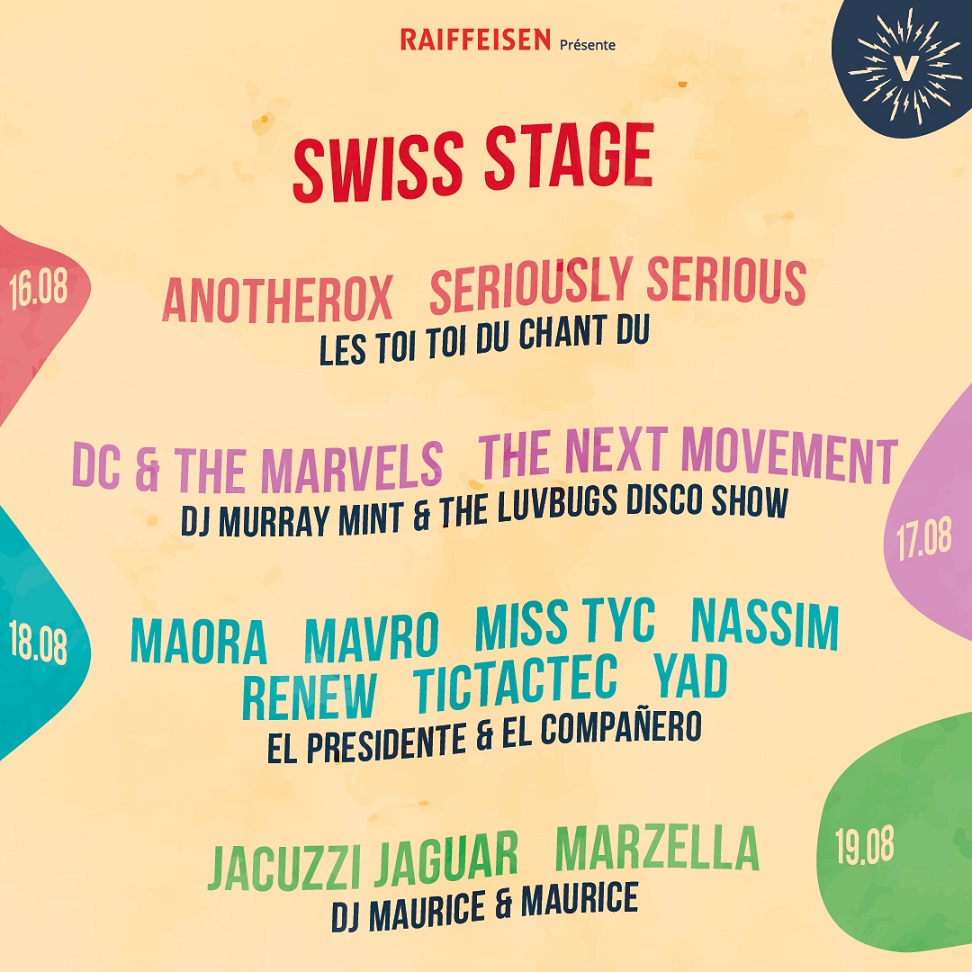 Cette année, la scène gratuite Swiss Live Talents n’est pas reconduite, mais les artistes locaux ne sont, comme à chaque édition, pas oubliés. Pour cette 27ème édition, des artistes suisses ont la possibilité de jouer sur les scènes principales du Venoge. Le mercredi, ce seront les vaudois de Gut’s et samedi, il y aura The Two, qui viendra présenter son nouvel album. Mais si l’on parle des artistes suisses, c’est parce que fort du succès des afters parties de l’année dernière, le bar La Rotonde se transforme cette année en SWISS STAGE, offrant une programmation spéciale mettant en avant des artistes suisses talentueux, tout en respectant la thématique de chaque soirée. Et pour une expérience encore plus immersive, cette scène, sous son chapiteau rond, sera située juste à côté de l’entrée du festival, dans un lieu repensé et réaménagé. La SWISS STAGE promet d’être un rendez-vous incontournable pour découvrir et célébrer le talent des artistes suisses. Et bien entendu pour terminer, les afters parties, qui ont fait le succès de l’édition précédente, seront toujours présentes pour prolonger la fête jusqu’au bout de la nuit après les concerts.