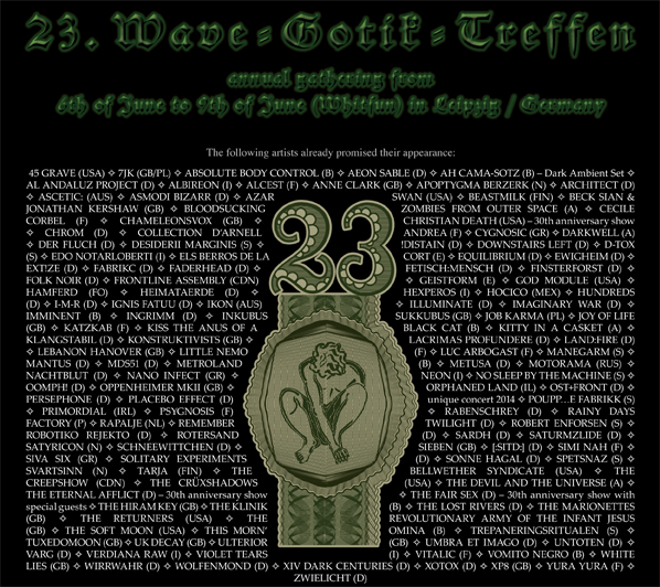 Avec déjà 23 ans au compteur, le Wave Gotik Treffen n’est pas seulement l’un des plus grand festival gothique du monde, mais on peut sans aucun doute le considérer comme la Meque pour les fans des genres musiques et cultures plus sombres. Un lieu où un goth doit aller au moins une fois, un rendez-vous entre personnes qui partagent les même goûts et intérêts. En effet on peut pas définir le WGT comme un festival, mais une vraie manifestation culturale à 360°. A côté des nombreux concerts de groupes des sub-genre disparus (genres dark, gothique, new-wave, batcave, deathrock, neofolk, industrial, EBM,…), il y a spectacles, pièces de théâtre, expositions, ainsi que des marchés médiévaux et gothiques : le tout dans salles de spectacles, théâtres, entrepôts industriels, parc d’expositions, mais aussi églises ou cryptes, dispersés dans toute la ville de Leipzig. Comme vous pouvez bien imaginer, impossible de tout suivre et même pour ‘seulement’ suivre les concerts (plus de 150 groupes), il faut faire des choix bien précis (ou se faire cloner !). Les points centraux du festival sont les gros salles du Agra Halle, un vieux centre d’exposition hors du centre-ville. Une des grosses scènes se trouve à l’intérieur de ce complexe ainsi que l’énorme marché gothique. A l’extérieur le camping se trouve une intéressante proposition culinaire. L’allée qui amène aux salles est désormais devenue une sorte de passerelle pour les participants aux festivals, une occasion de montrer leur plus beaux vêtements et look extravagants. Un peu comme sur la Croisette au festival du film à Cannes, sauf que les stars sont les festivaliers eux-mêmes. C’est incroyable d’observer la fantaisie et la recherche du détail de certains looks ou l’extravagance et audace d’autres : gothique, steam-punk, old-school dark, EBM, vampire, victorian,… you name it !