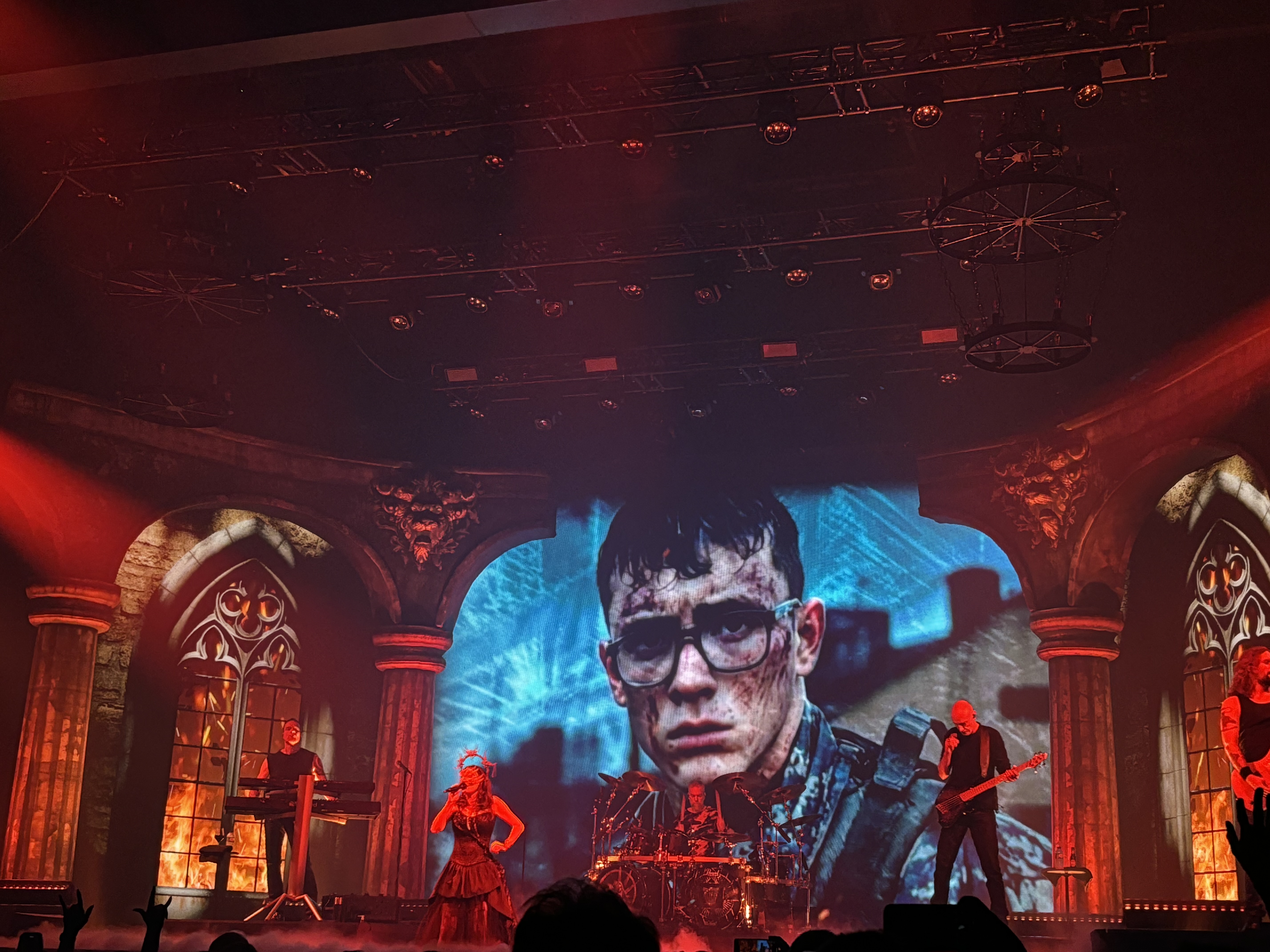 Comme à l’accoutumée, les décors de la scène sont imposants, en l’occurence des colonnes antiques surplombant et entourant des catacombes dans lesquelles le groupe prendra place. 21 heures tapantes, sur l’écran du fond de scène et au son des premières mesures de ‘We Go To War’ sont projetées des images de jeunes femmes et jeunes hommes parés pour la guerre sur fond de champs de tournesols qui se transorment peu à peu en cimetières, paradoxe cruel et d’actualité, la fin de l’innocence. Projections de fumigènes, montée en puissance de la musique pour l’entrée en scène de Sharon Den Adel, telle une déesse de la guerre, portant un imposant masque vénitien. Une mise en scène très esthétique et impressionnante qui fait tout son effet.