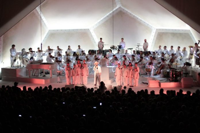 Arrivée dans un décor futuriste, accompagné d’un orchestre classique et d’une chorale, Woodkid a revisité ses plus belles chansons avec une myriade d’amis dont Ed Drost, chanteur de Grizzly Bear et la comédienne Elle Fanning.