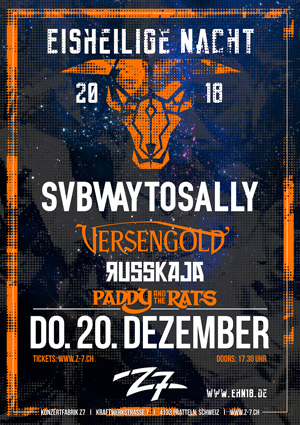 Une fois de plus, le groupe de folk metal Subway To Sally a organisé un beau rassemblement de groupes pour son Eisheilige Nacht. Outre la tête d’affiche incontestée, le très polyvalent groupe de rock allemand Versengold, le groupe viennois de turbopolka Russkaja et finalement le groupe hongrois de folk irlandais Paddy & The Rats se partageront la scène du Z7.